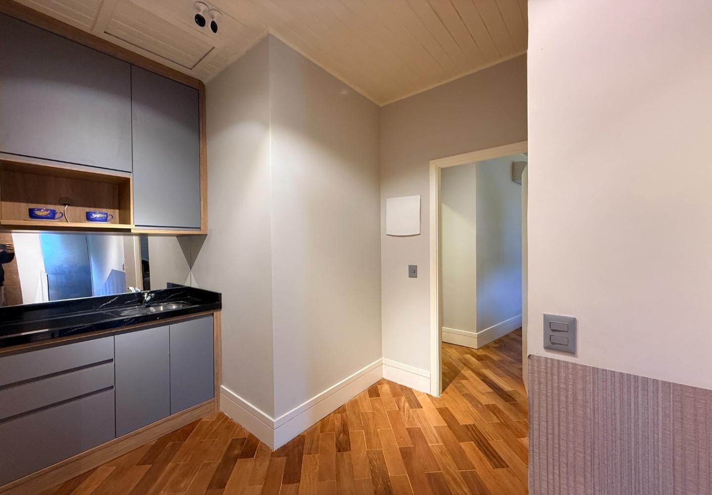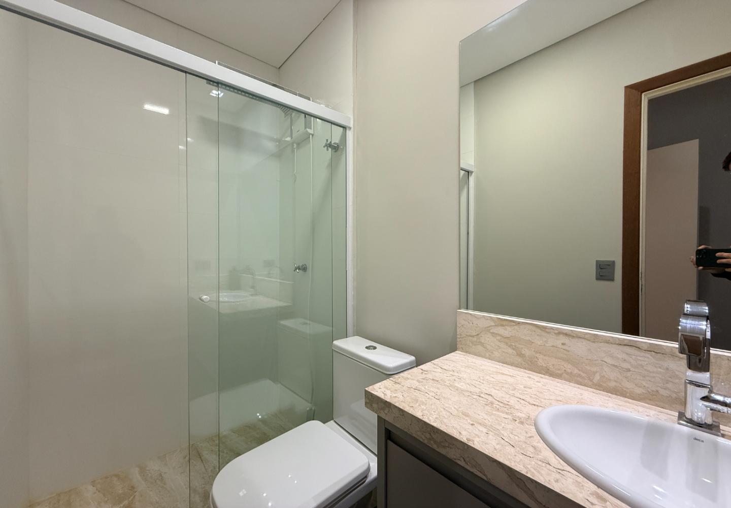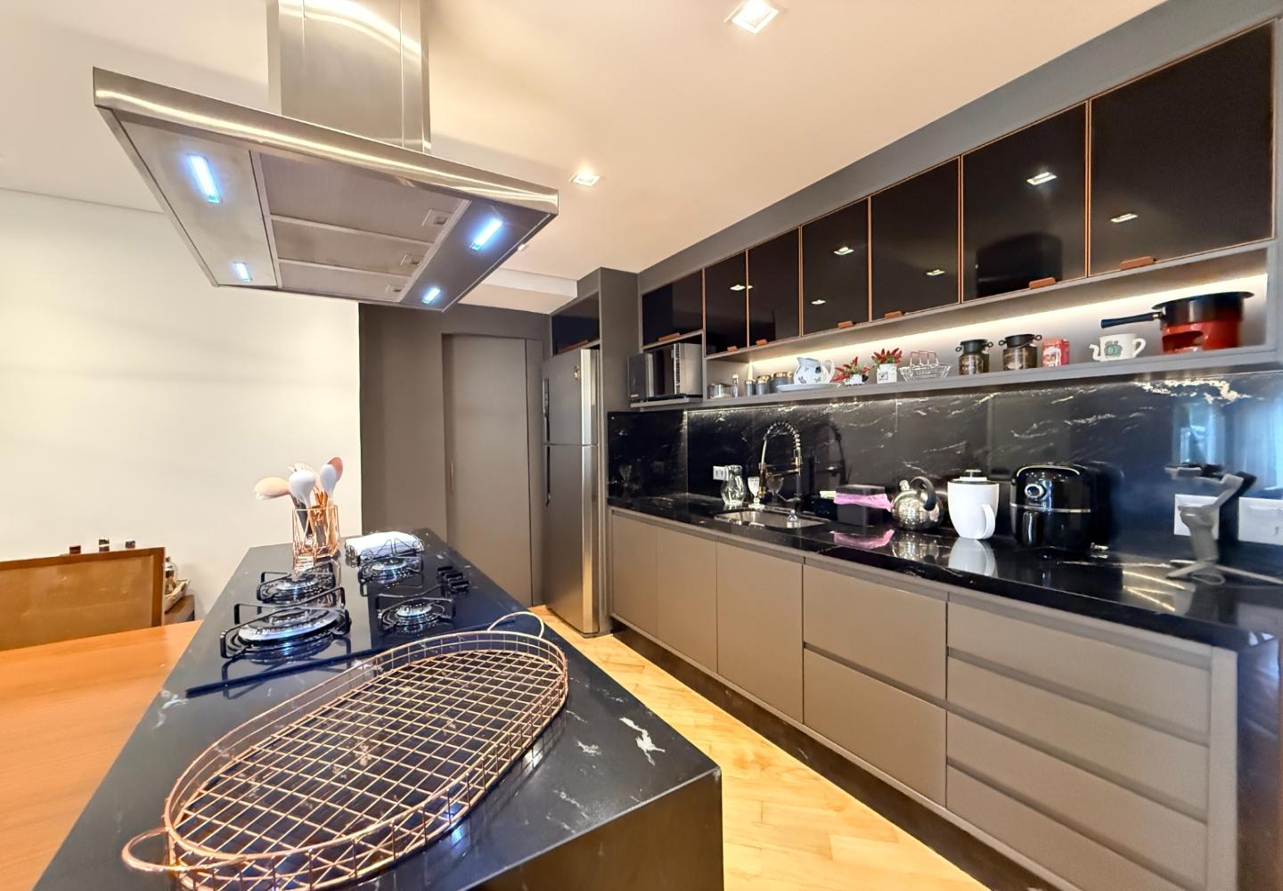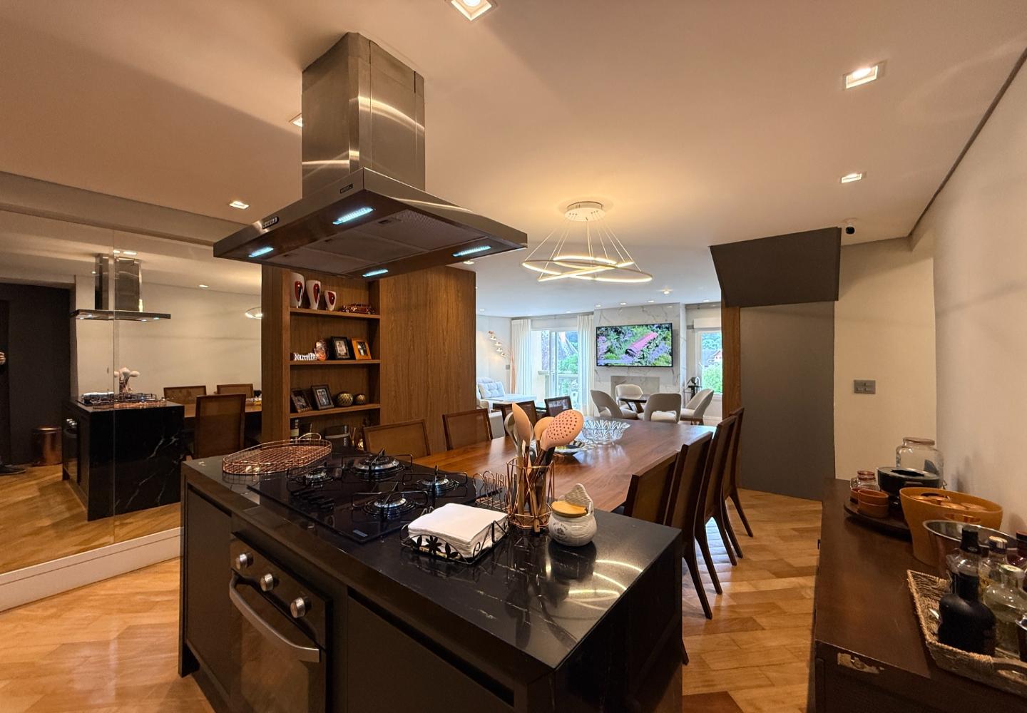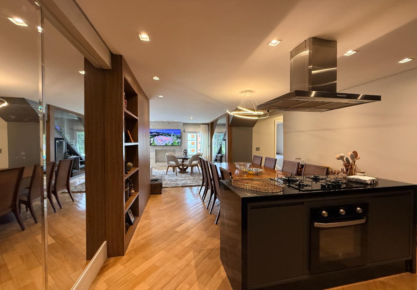 No pavimento principal, a área social conecta cozinha, jantar e estar de forma fluida, com ilha central e boa entrada de luz natural. Ainda neste nível, há uma suíte com varanda e um dormitório adicional atendido por banheiro no corredor.