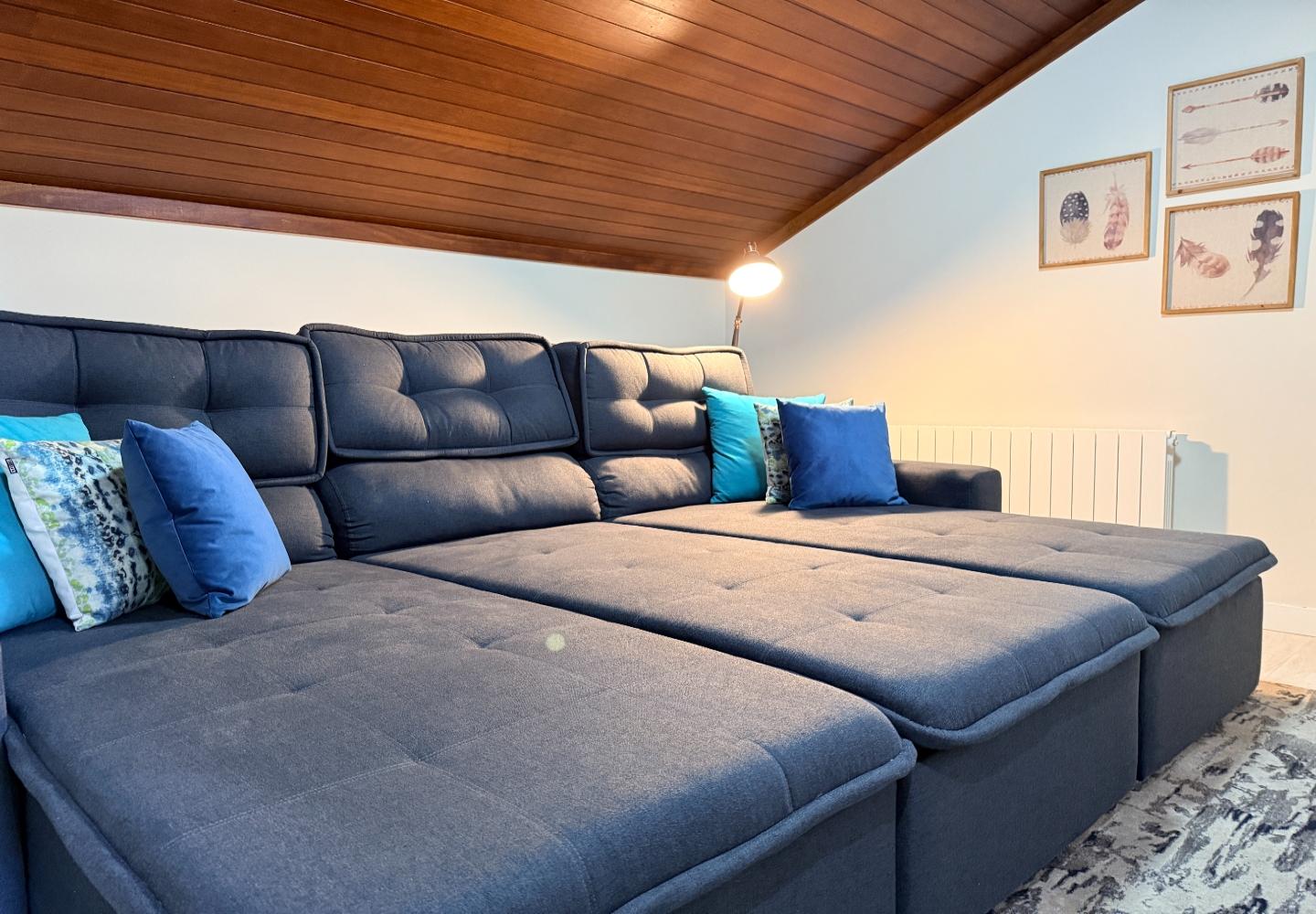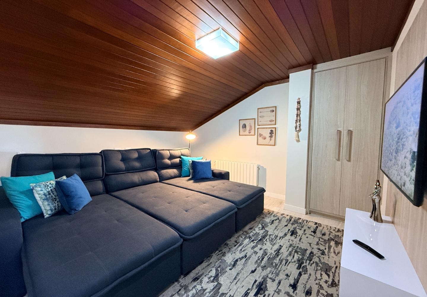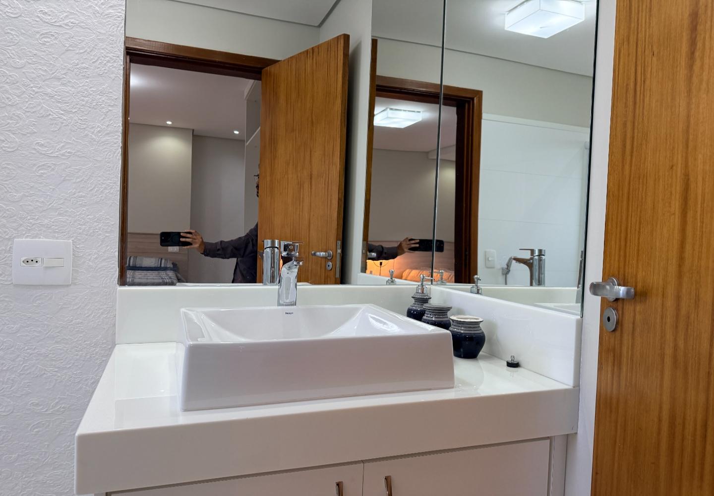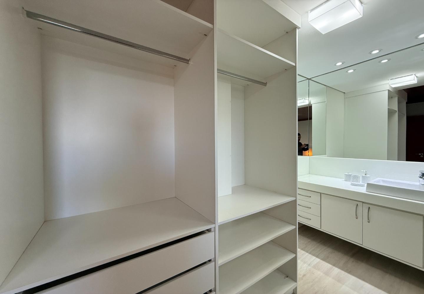 A cozinha é equipada com ilha central e marcenaria sob medida, conectada diretamente ao ambiente social. Ainda no piso principal, estão os dormitórios, com boa circulação e praticidade. No pavimento superior, a sala íntima funciona como um espaço mais reservado, acompanhada de uma das suítes, garantindo mais privacidade.