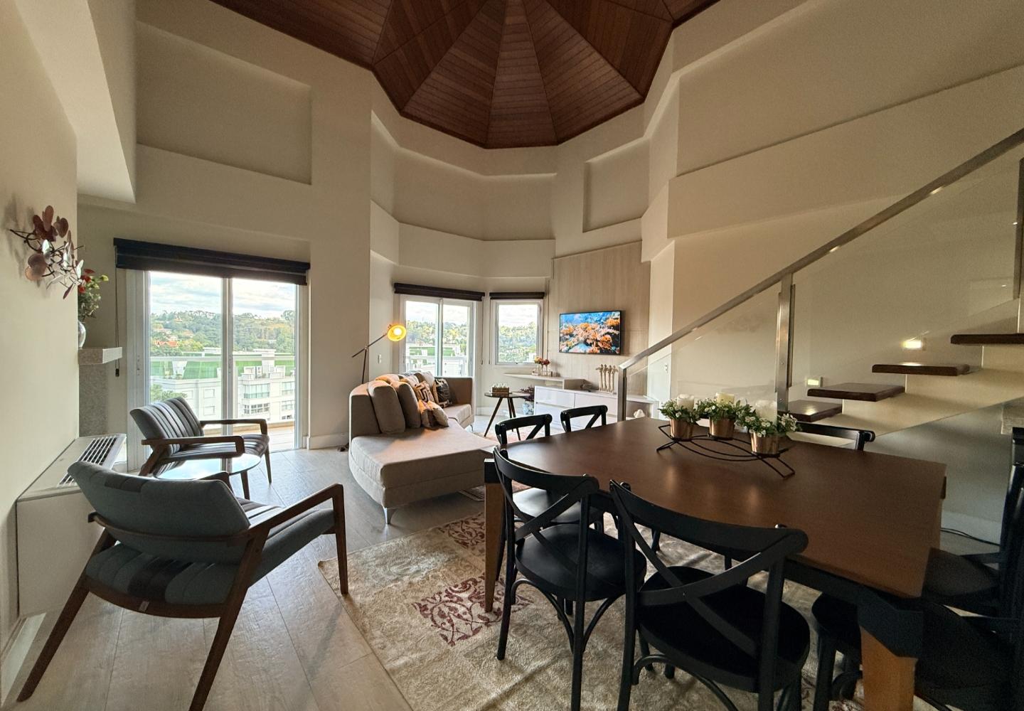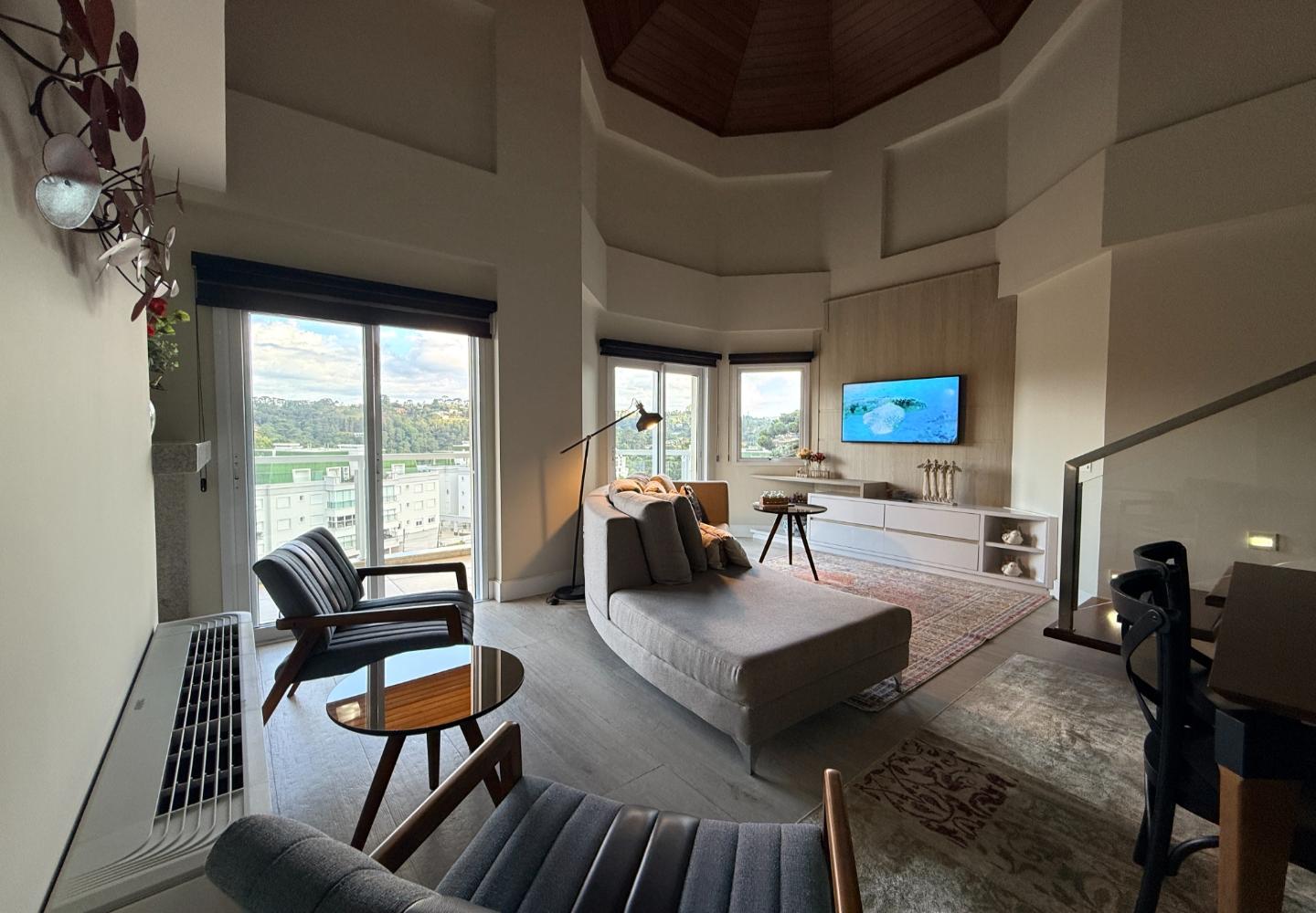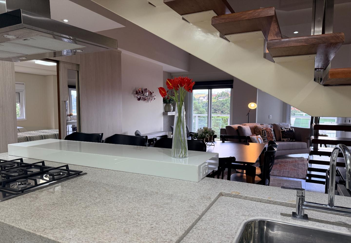 Cobertura duplex com 187 m² de área privativa, com uma planta bem distribuída e ambientes amplos, pensados para uso confortável no dia a dia. O living principal reúne sala de estar com lareira, jantar e integração com a cozinha americana, resultando em um espaço aberto e funcional, com boa entrada de luz natural e acesso à sacada.