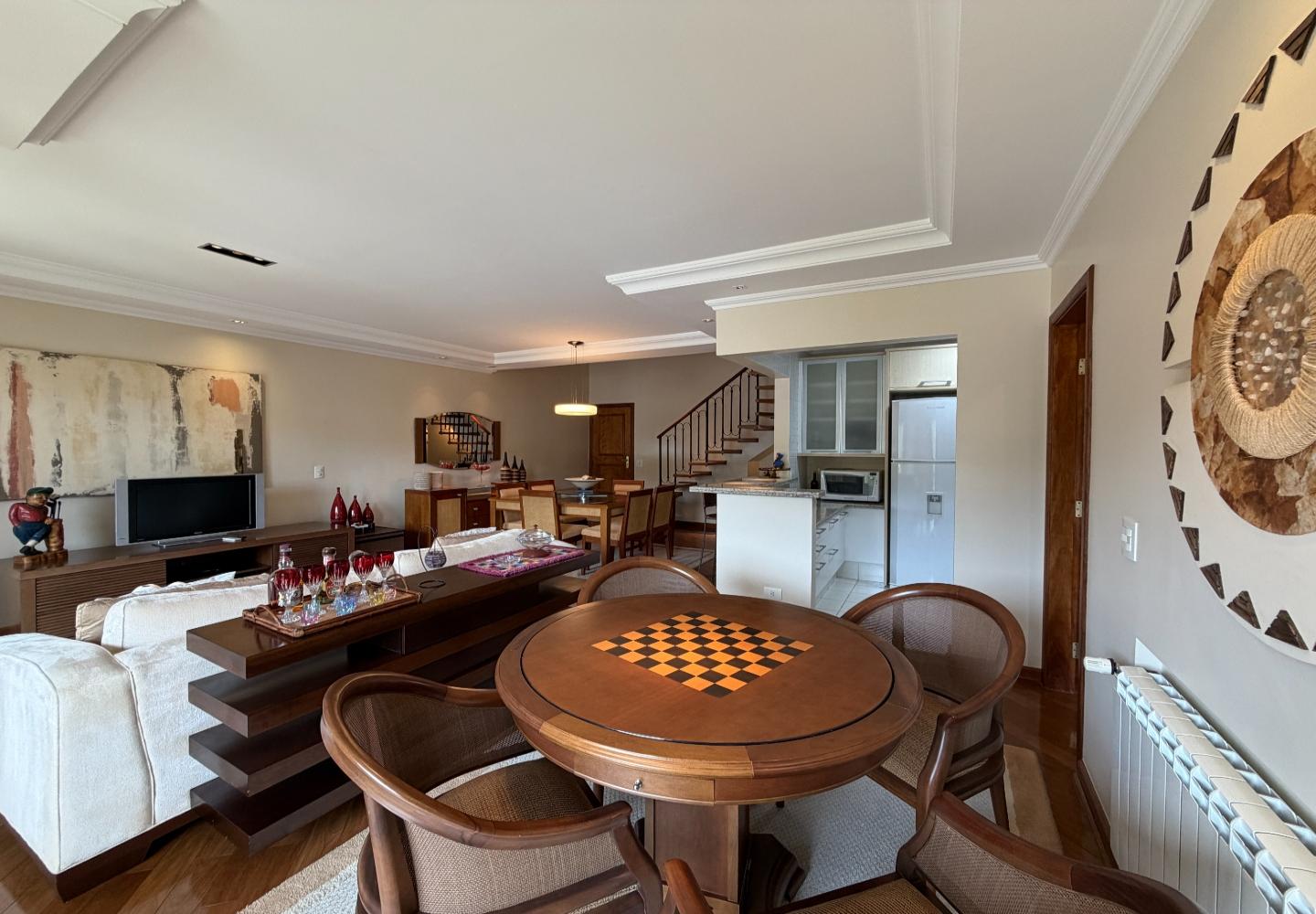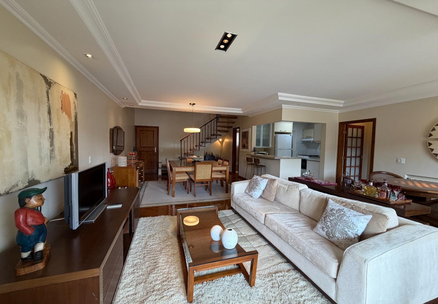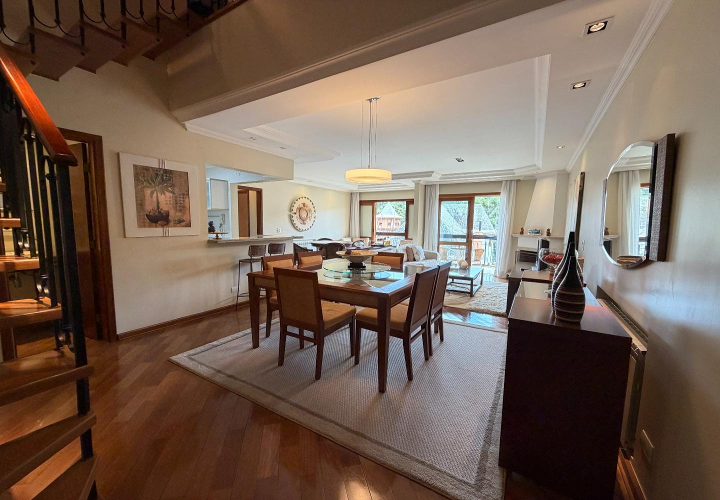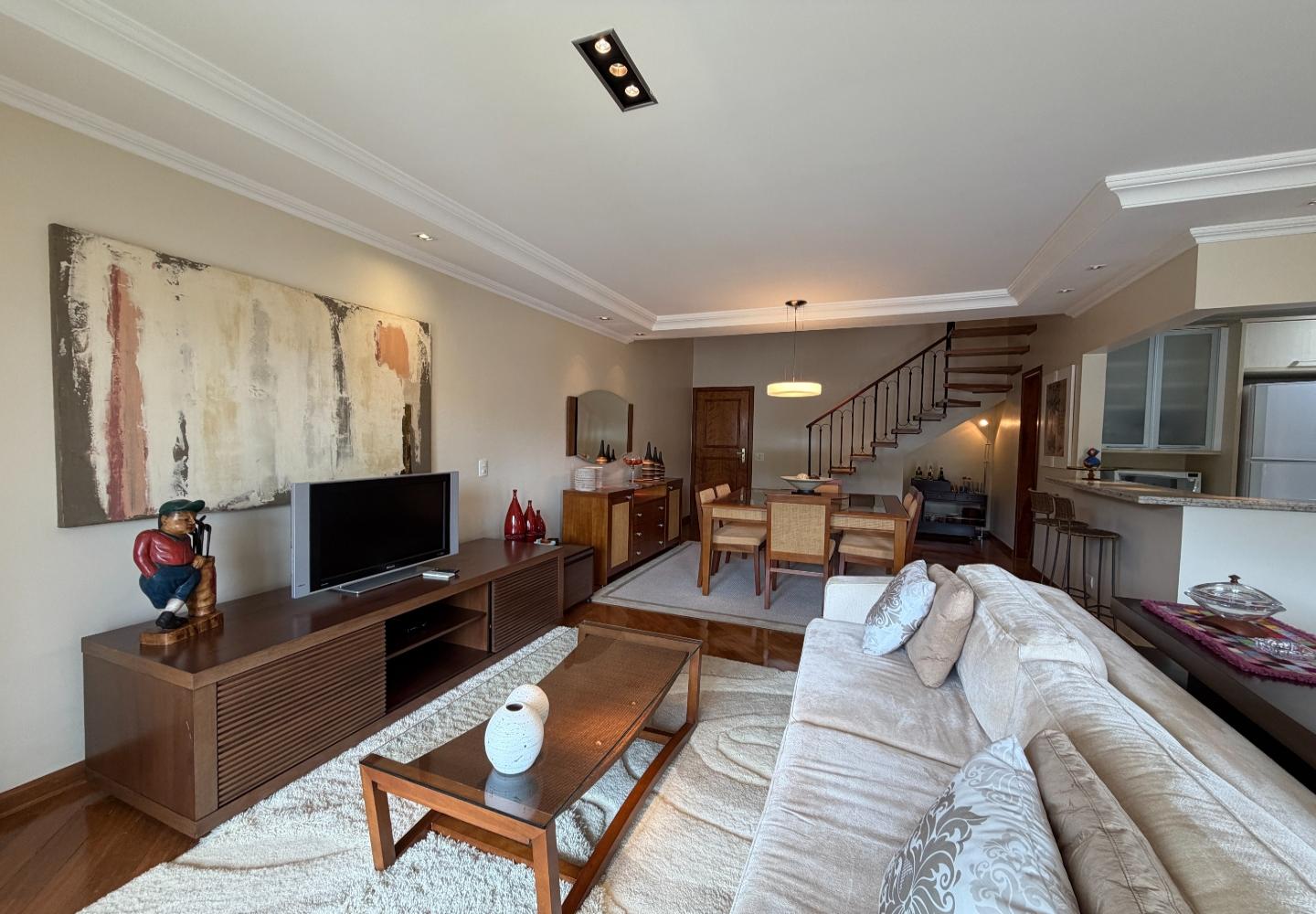 No centro de Capivari, esta cobertura no condomínio Pousada do Barão entrega uma planta rara e muito bem resolvida: são 4 suítes, com 2 no piso principal e 2 no pavimento superior, garantindo privacidade e boa separação de usos no dia a dia.