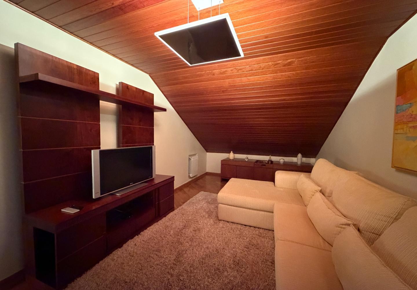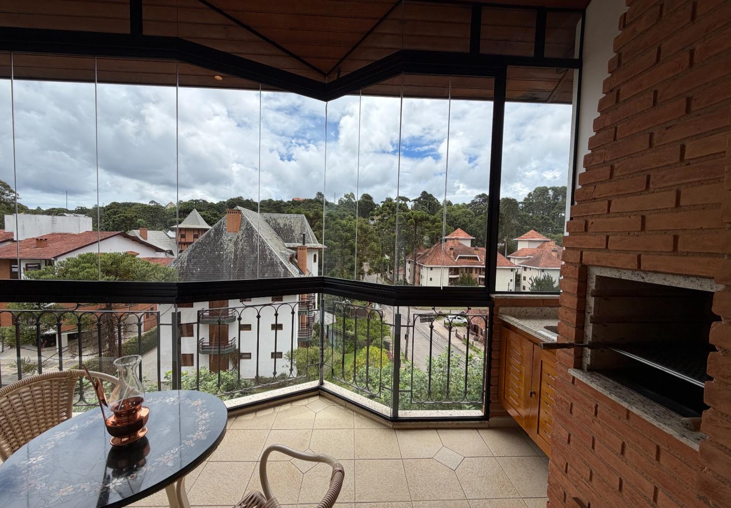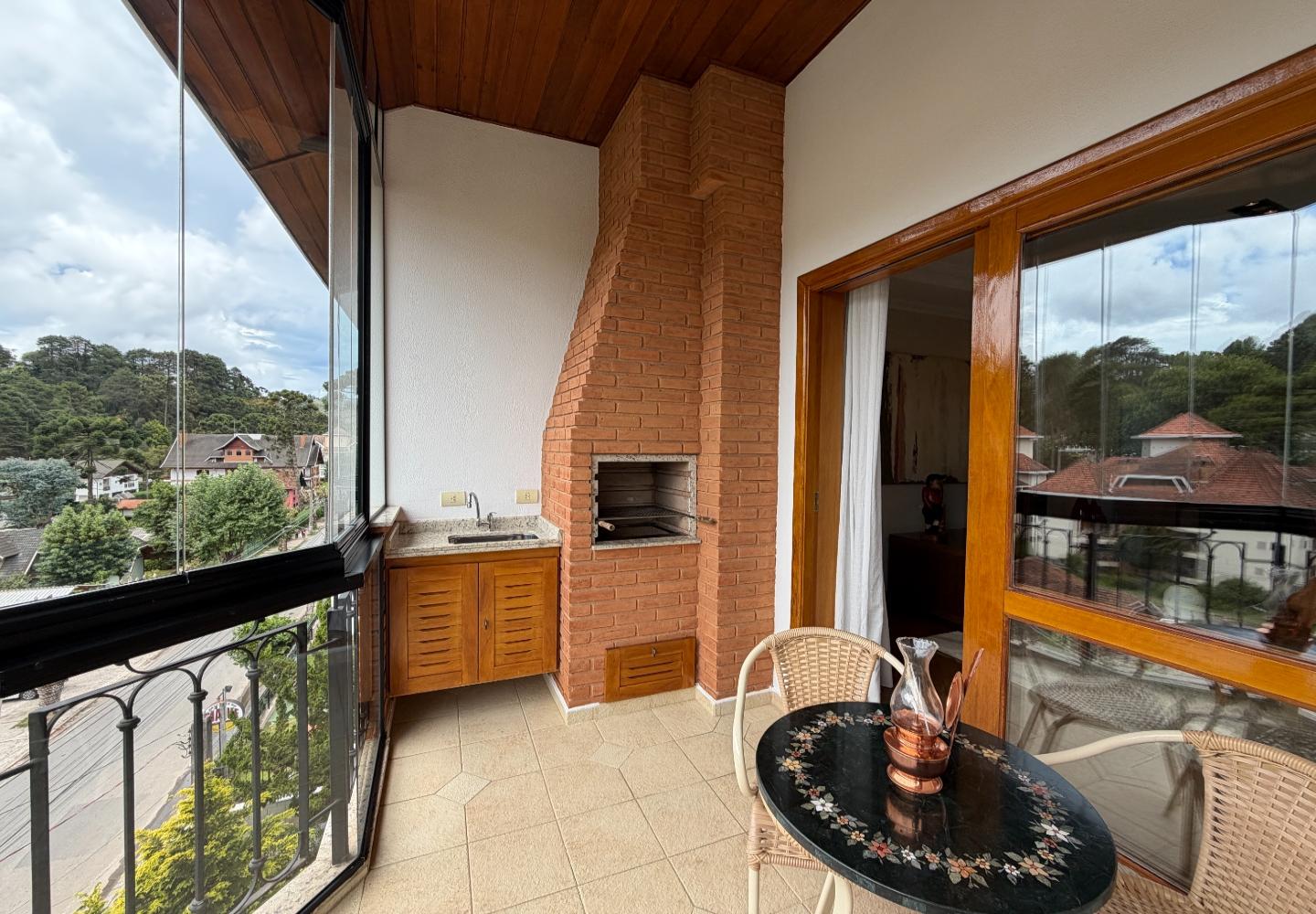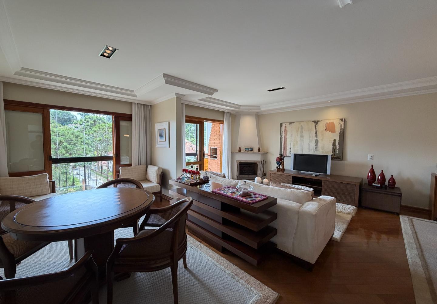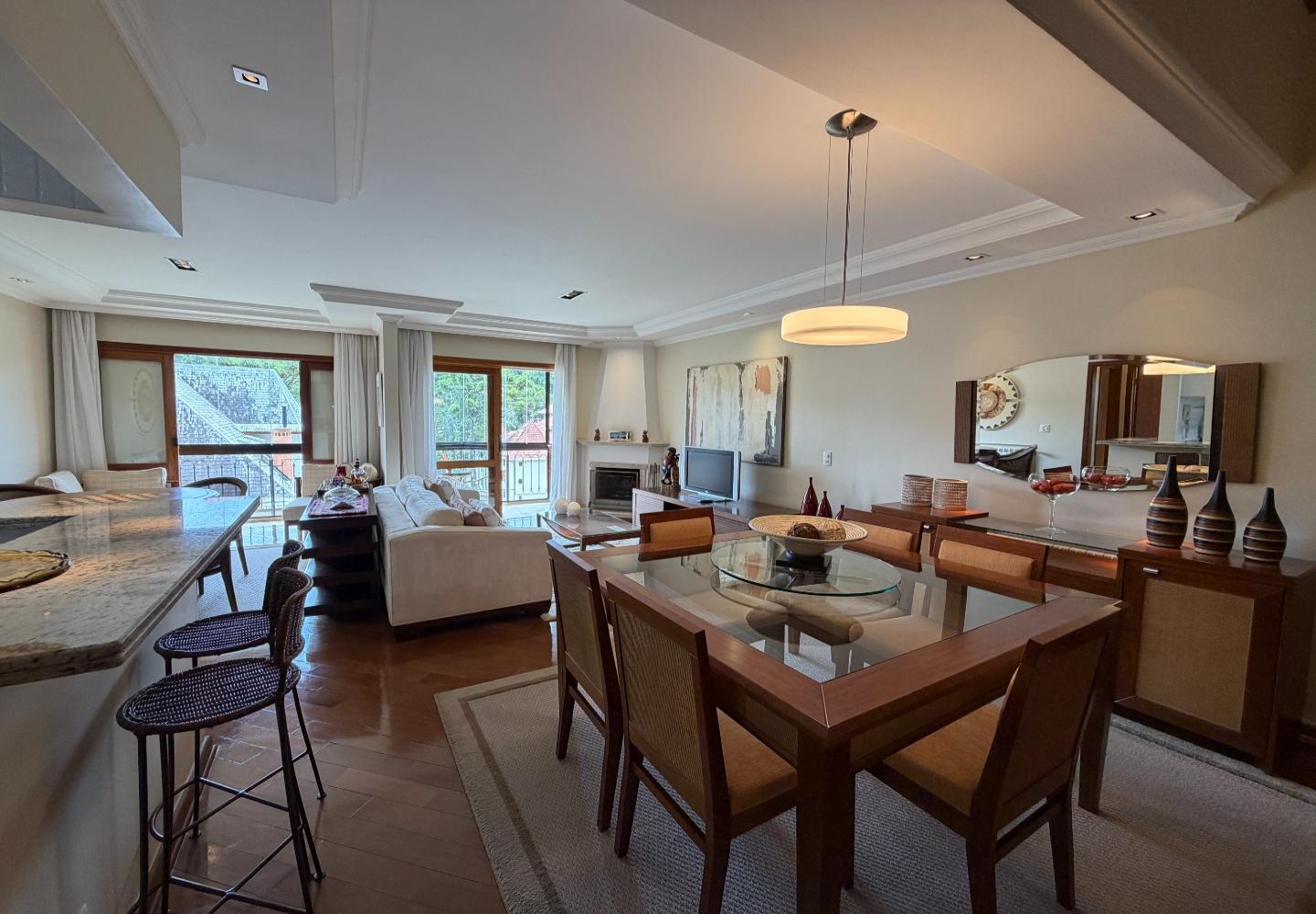 A área social é generosa e bem iluminada, com living integrado ao jantar, acabamento de bom gosto e lareira, além de uma varanda gourmet fechada em vidro, com churrasqueira e vista da região. No andar de cima, a cobertura ganha um segundo living, perfeito para TV, jogos ou um espaço mais reservado.