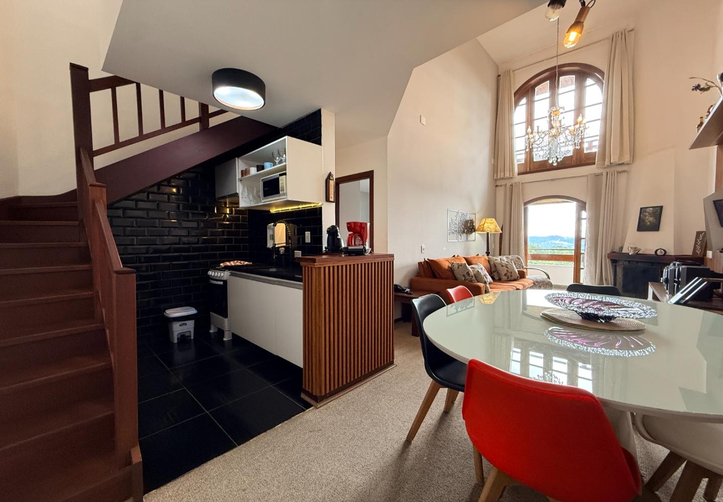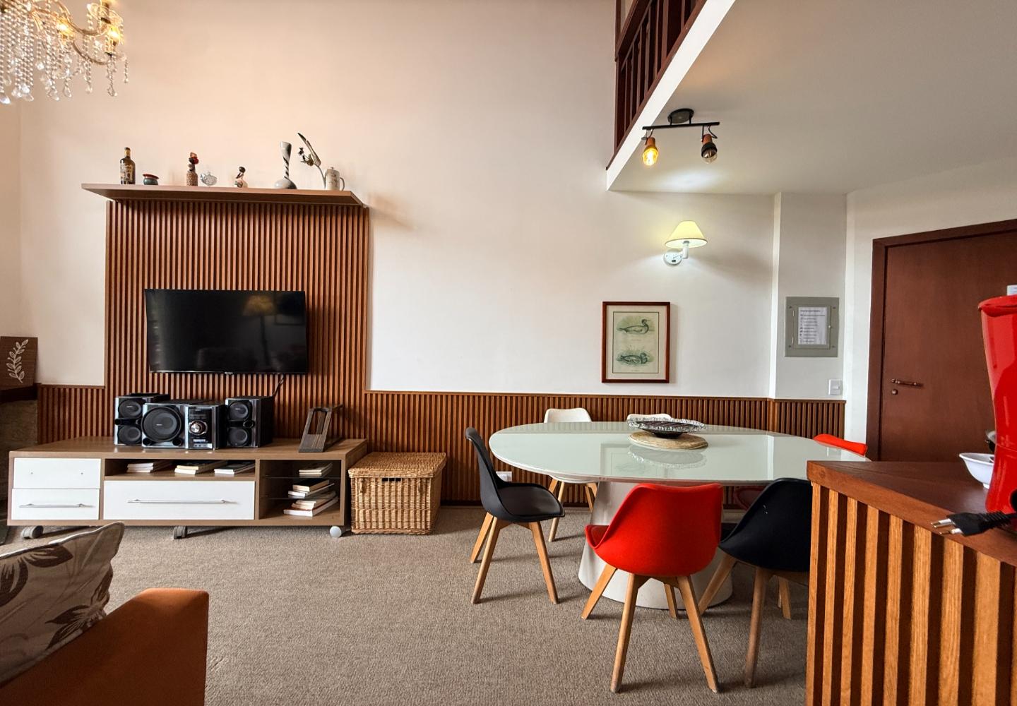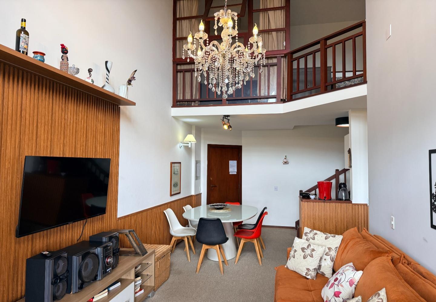 Apartamento duplex com 100m², bem distribuído e com uma área social marcada pelo pé-direito duplo e grandes aberturas, que trazem luz natural e valorizam a vista para a vegetação ao redor. A sala integra estar, jantar e cozinha em um único ambiente, com lareira e acesso direto à varanda. No piso principal, o apartamento conta com um dormitório atendido por banheiro social. No pavimento superior, há mais um dormitório, além de um espaço adicional que hoje está configurado como quarto, mas pode ser utilizado como sala íntima, escritório ou outro ambiente de apoio, conforme a necessidade. O apartamento será vendido mobiliado. A taxa de condomínio inclui gás, água, internet básica e pacote SKY.