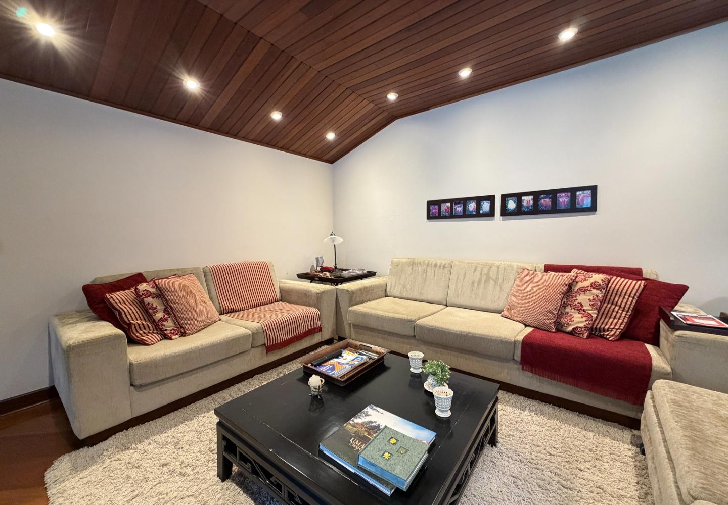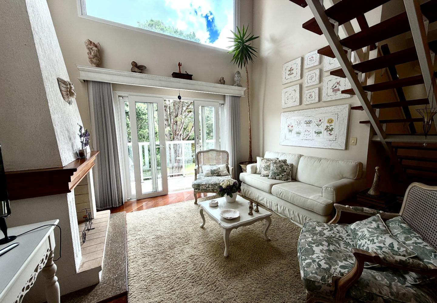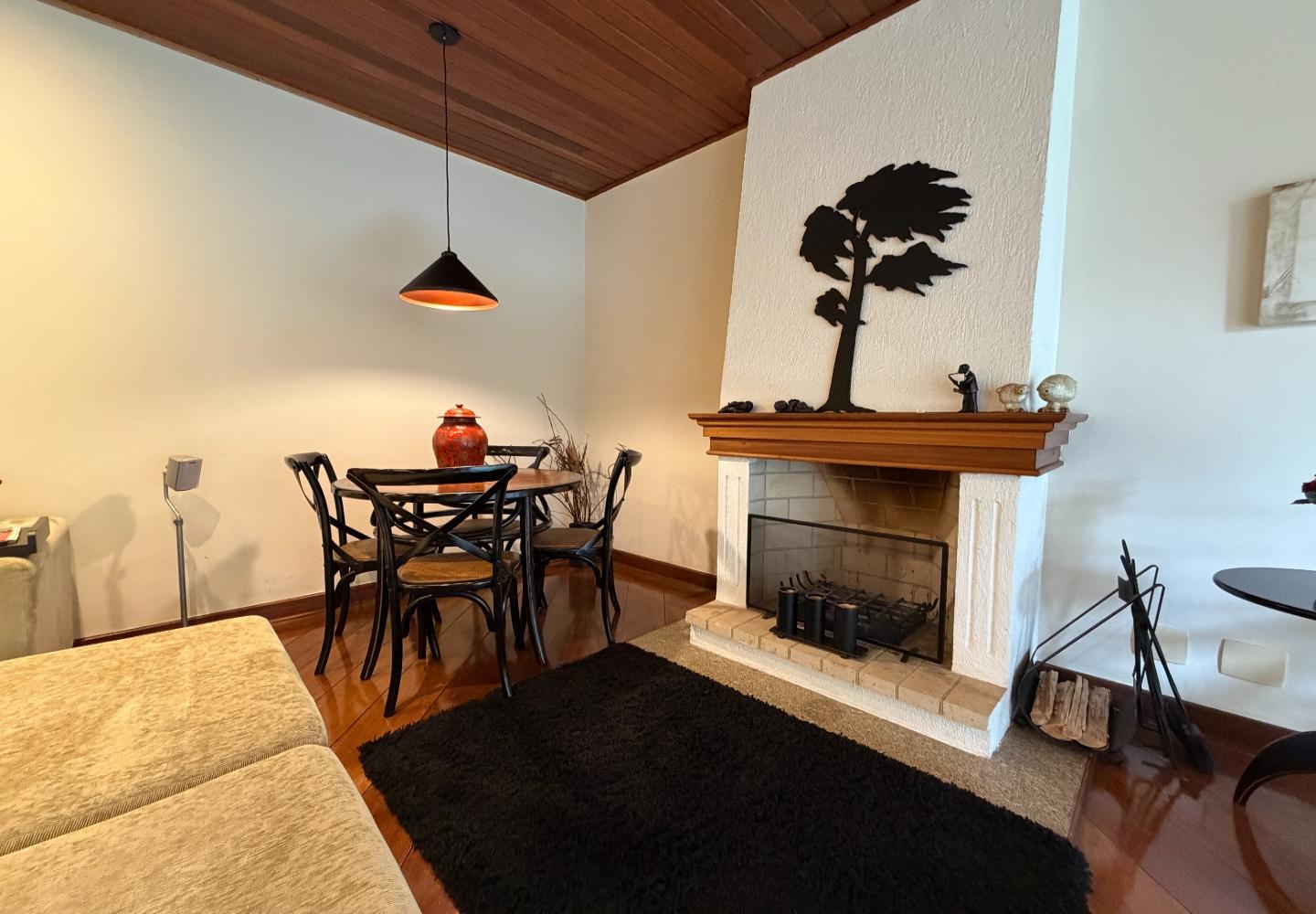 Cobertura duplex localizada no terceiro andar do Condomínio Flat Residence Maison Suisse, com planta bem distribuída e ambientes claros. A área social conta com sala para dois ambientes com lareira e acesso a uma sacada ampla, que amplia a sensação de espaço e valoriza a vista. Há ainda uma sala privativa com lareira, oferecendo um segundo ambiente de estar mais reservado.