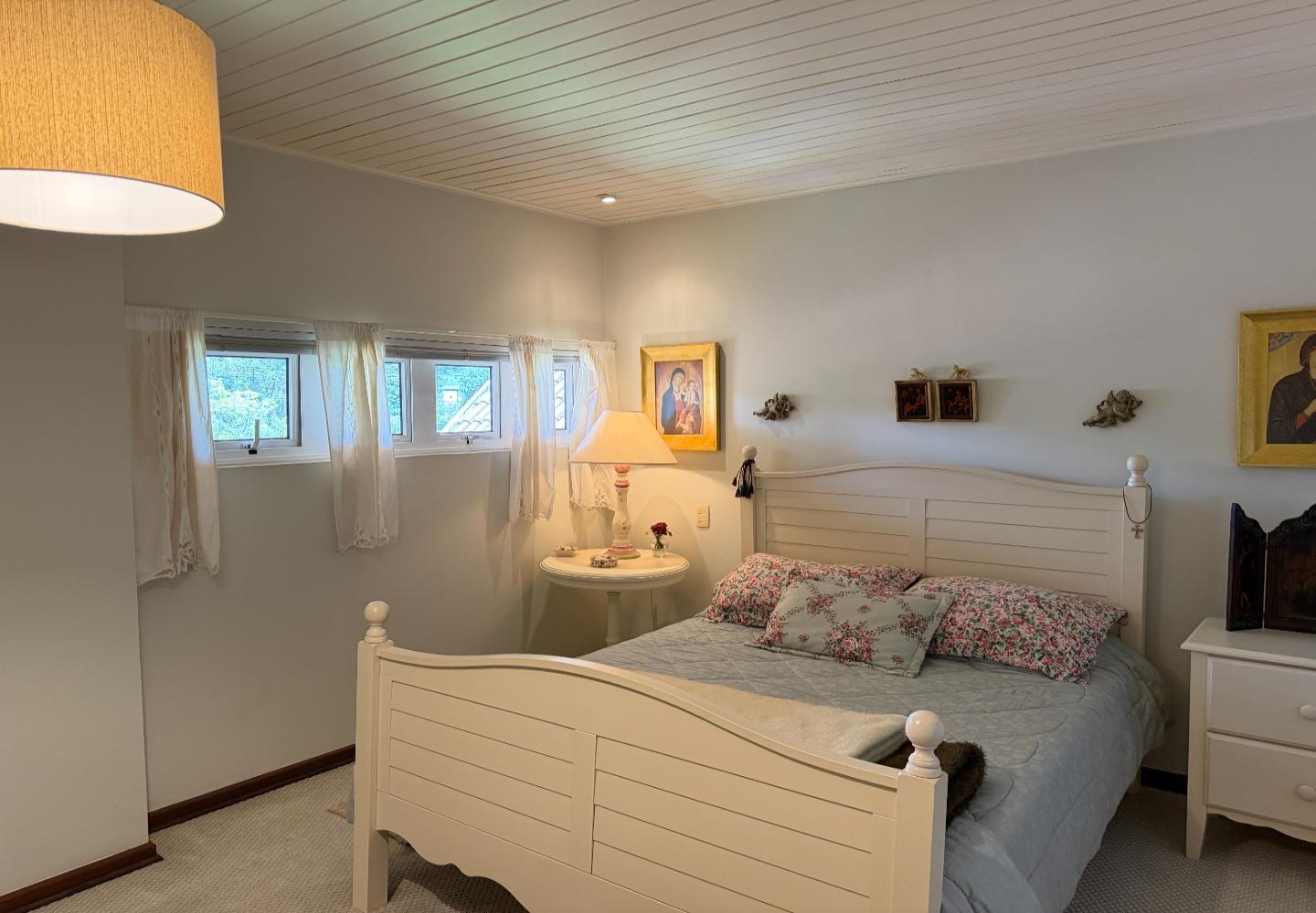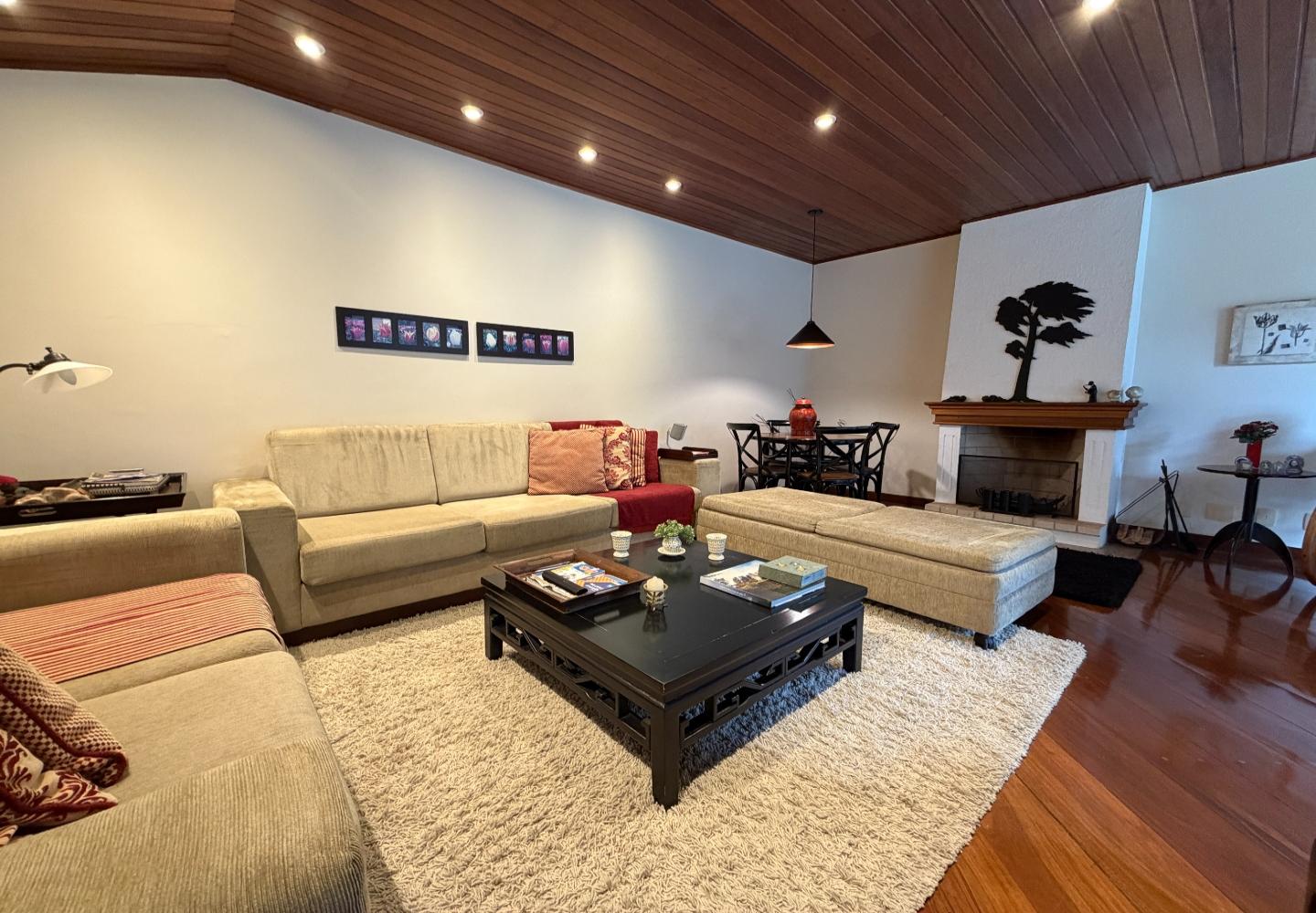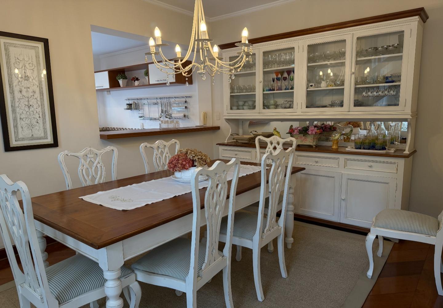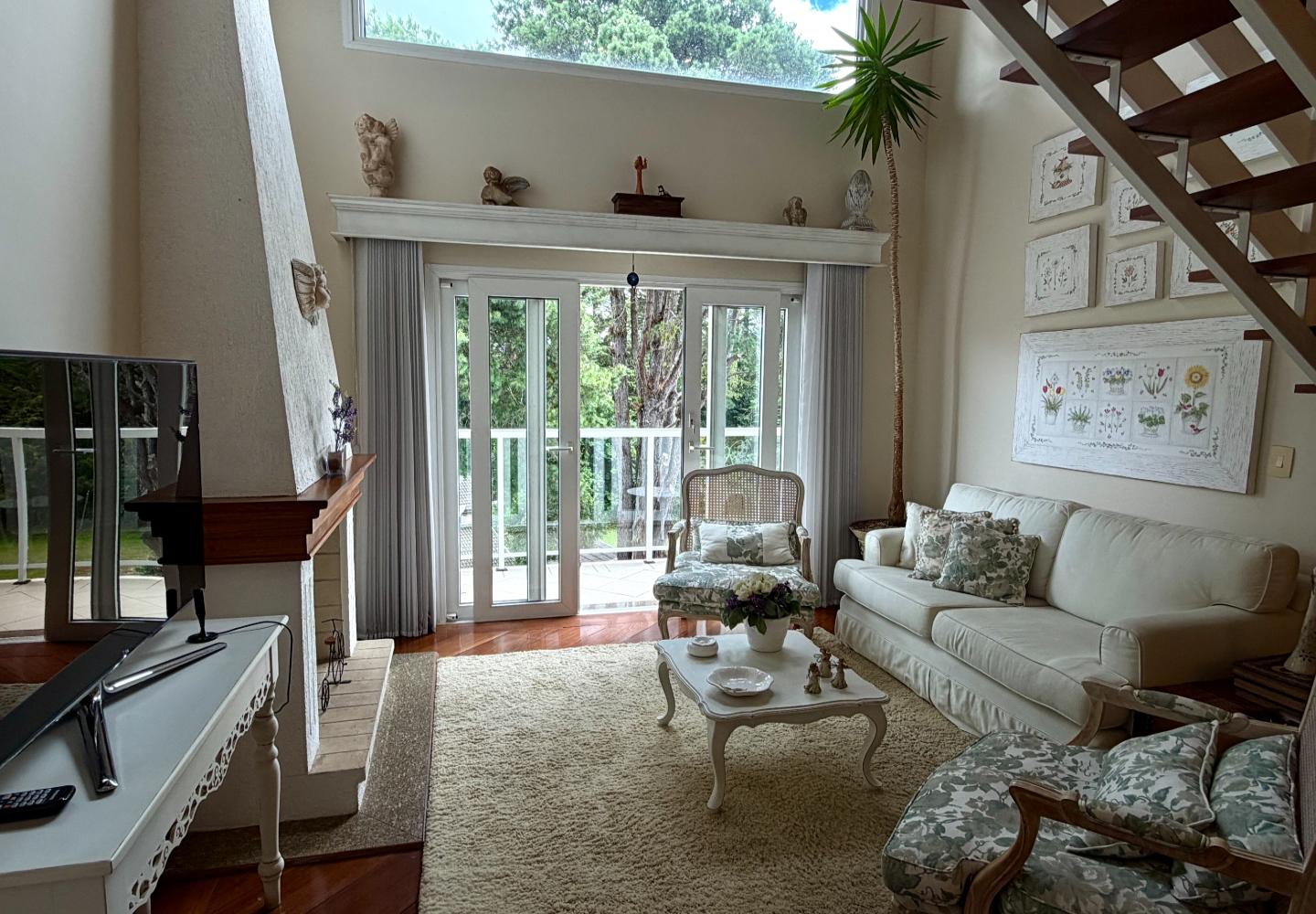 Cobertura duplex localizada no terceiro andar do Condomínio Flat Residence Maison Suisse, com planta bem distribuída e ambientes claros. A área social conta com sala para dois ambientes com lareira e acesso a uma sacada ampla, que amplia a sensação de espaço e valoriza a vista. Há ainda uma sala privativa com lareira, oferecendo um segundo ambiente de estar mais reservado.