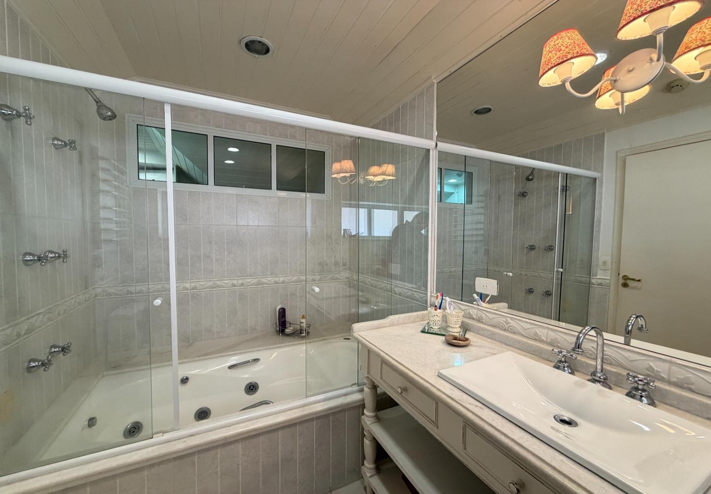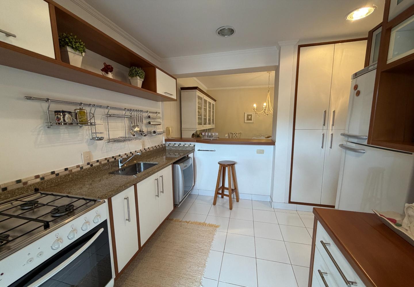 A cozinha americana planejada se integra de forma prática ao conjunto, acompanhada de área de serviço e lavabo. O apartamento dispõe de quatro suítes bem distribuídas, garantindo conforto e privacidade. Duas vagas de garagem completam a estrutura.