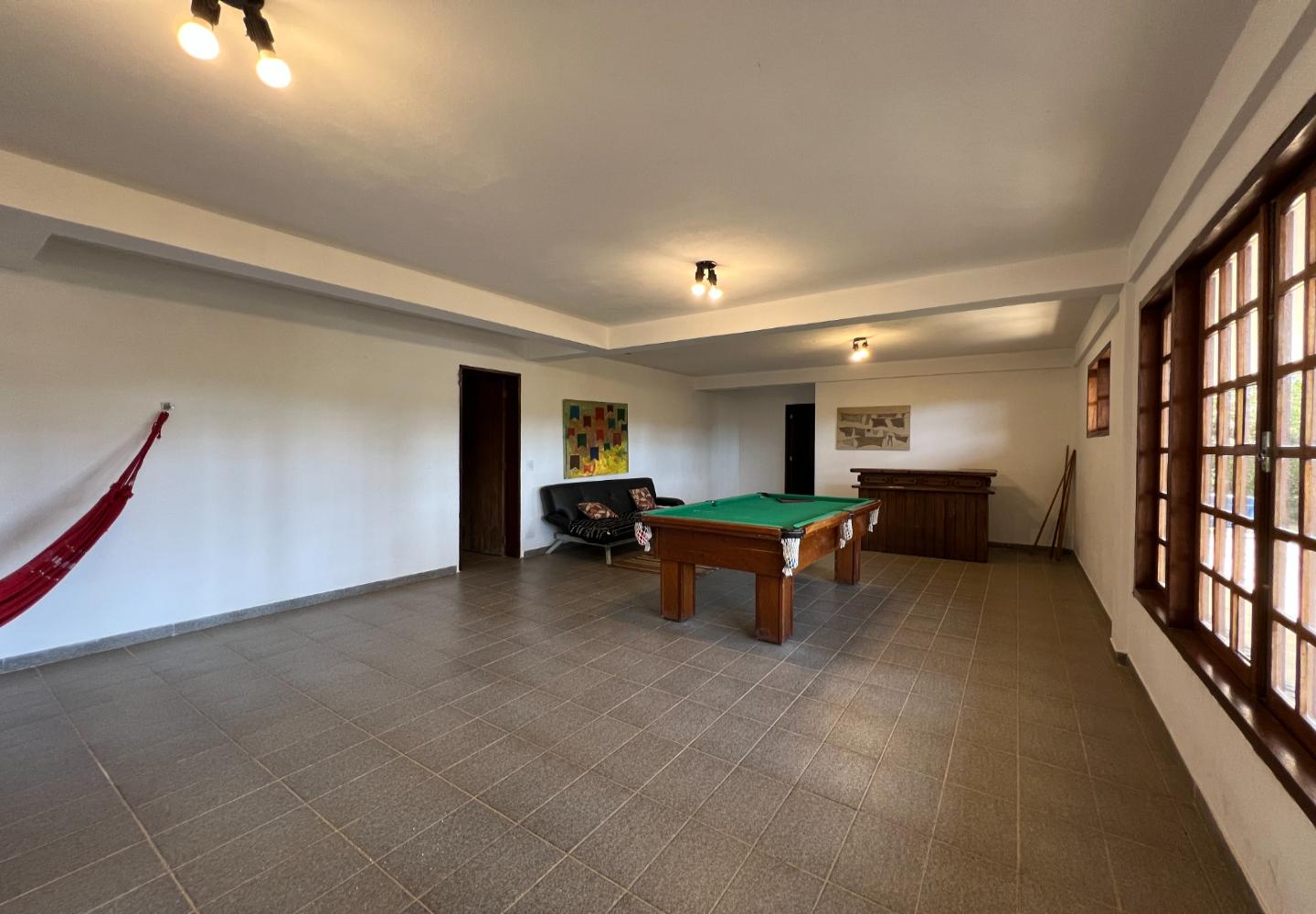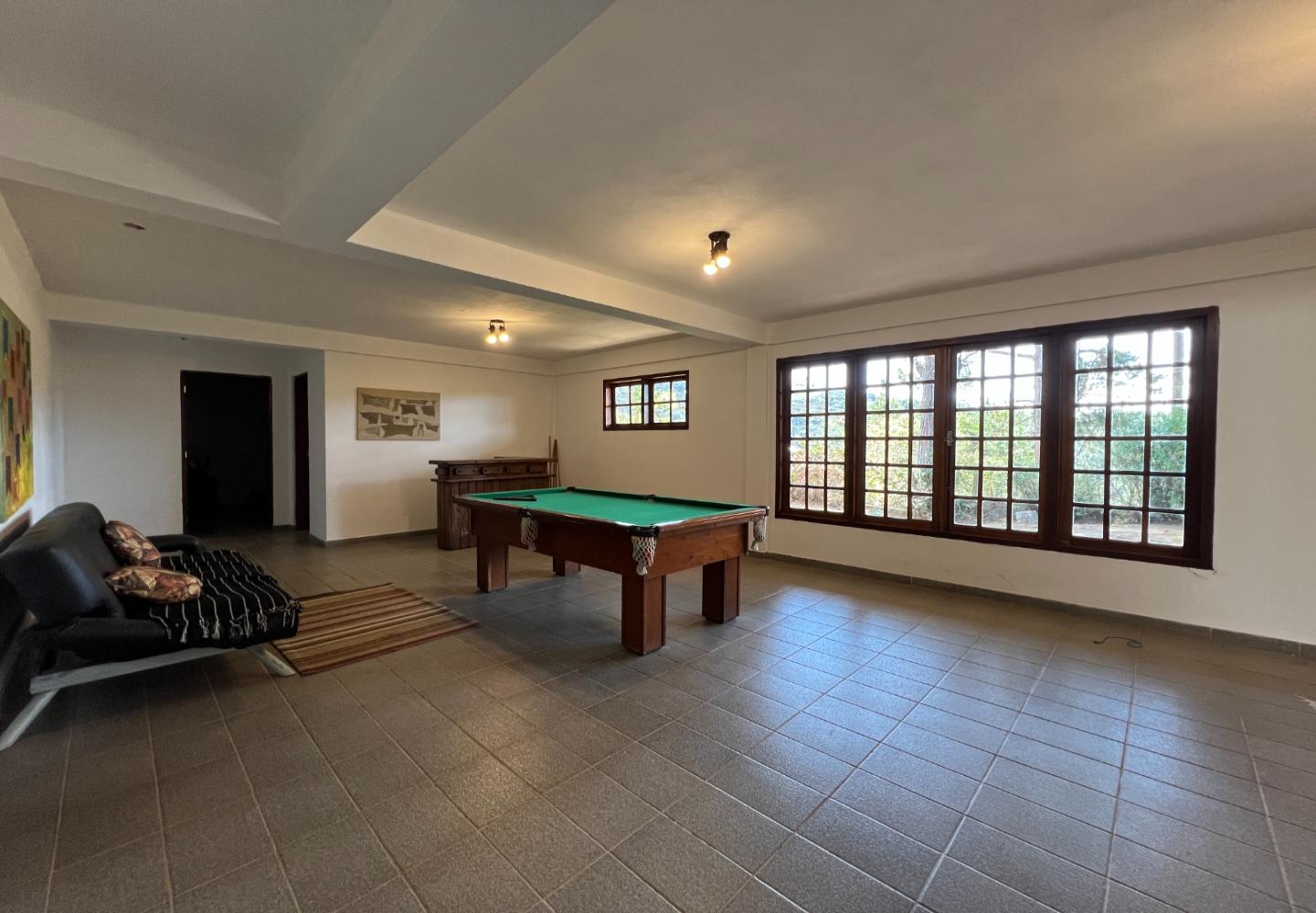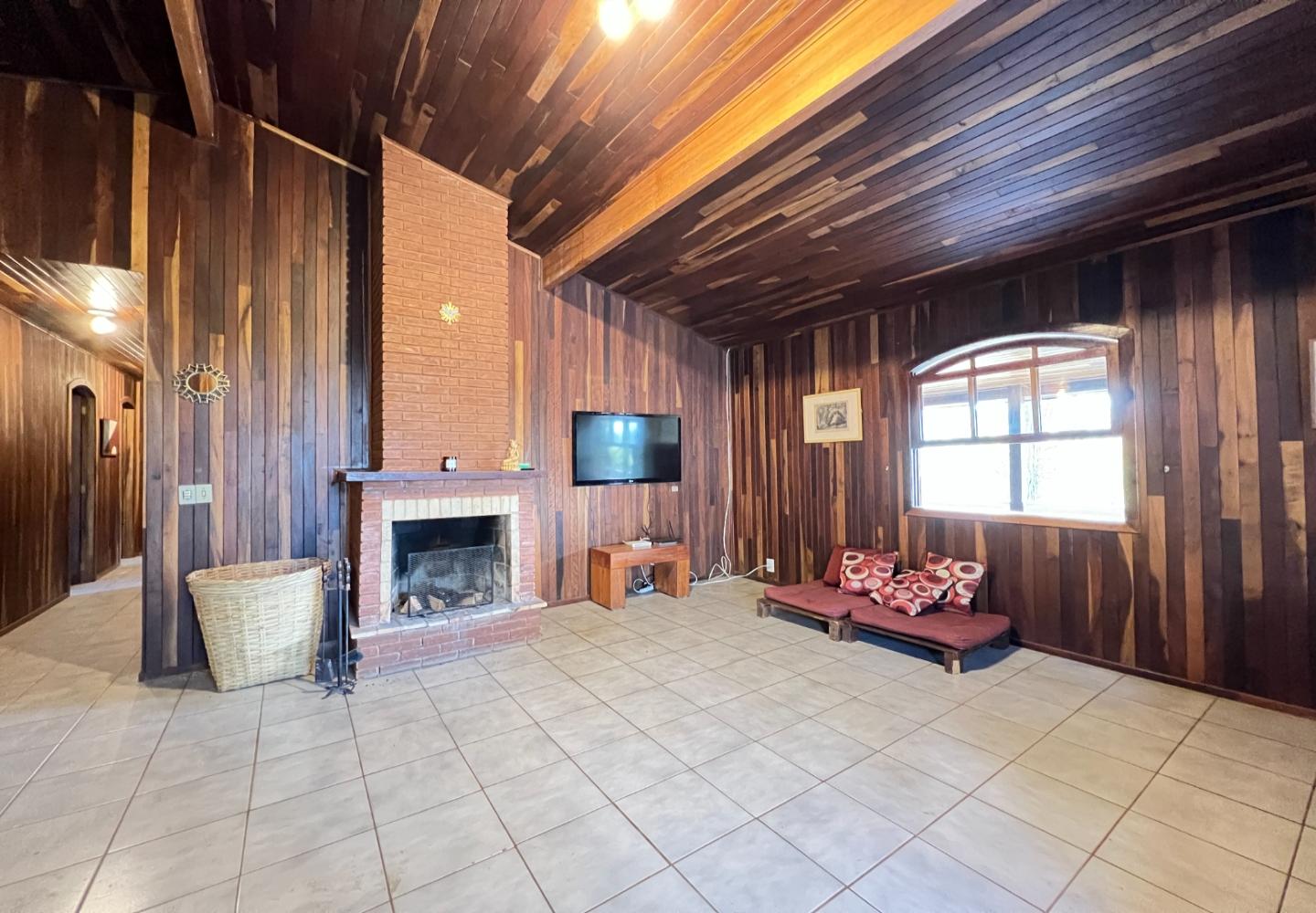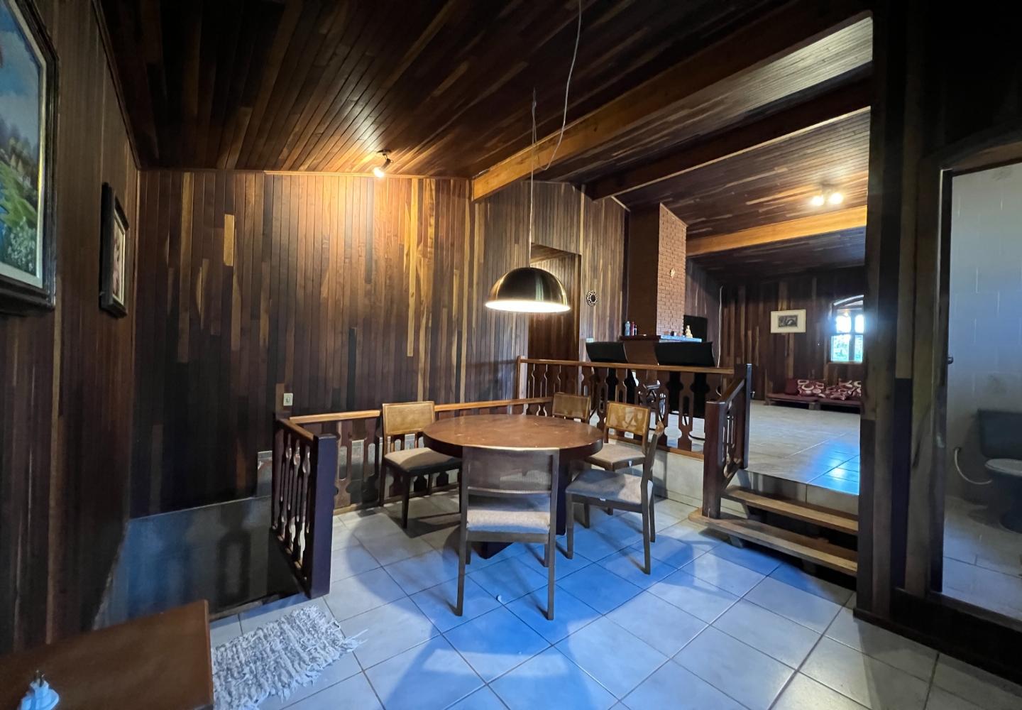 A construção possui cerca de 305 m², distribuídos em dois pavimentos. No andar superior, são 4 dormitórios, sendo 1 suíte, salas aconchegantes com lareira e varanda com vista para o jardim. Já no piso inferior, um amplo ambiente hoje utilizado como sala de jogos, além de 1 dormitório e 1 banheiro adicionais, com acesso interno pela escada.