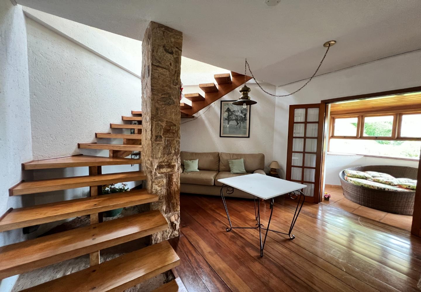 A área social tem salas integradas e bem dimensionadas, com lareira, piso em madeira e vãos que trazem luz natural e vista para o entorno. A circulação interna é marcada por escada em madeira e pé-direito mais alto em pontos estratégicos, criando sensação de amplitude. Há ainda ambientes que funcionam bem como estar adicional, apoio ou home office, graças às janelas amplas e à boa entrada de luz.