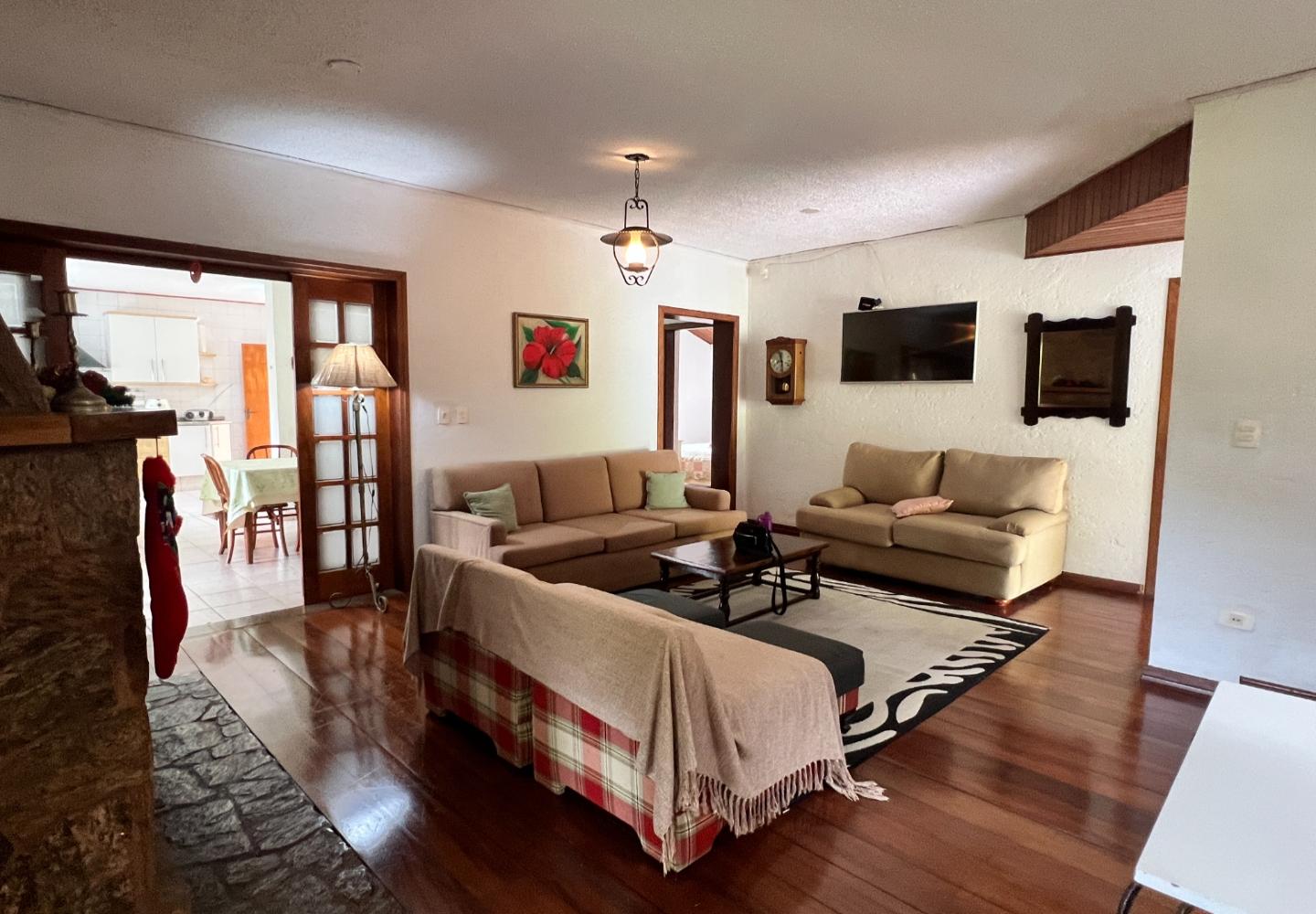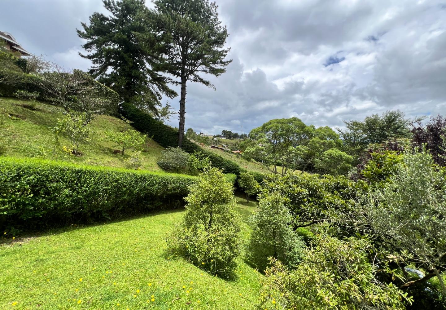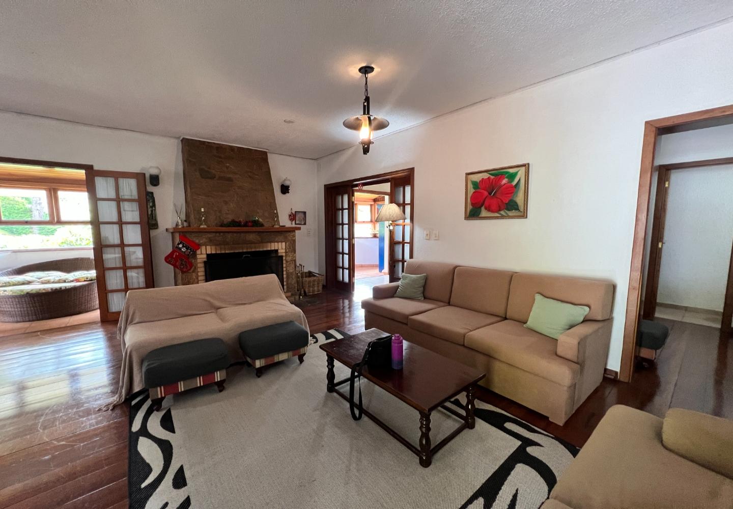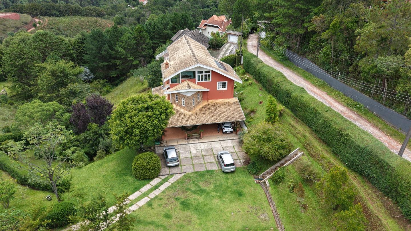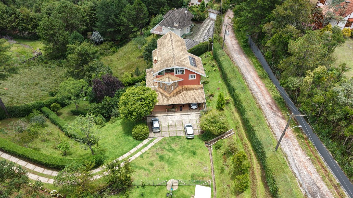 No Atalaia, esta casa se destaca pelo terreno generoso de 2.800 m² e pela implantação que aproveita bem a topografia, com jardins e áreas externas abertas ao verde. São 409 m² de área construída, em um conjunto com linguagem bem característica da serra, incluindo volumes com acabamento em pedra, boa presença de madeira e telhado inclinado.