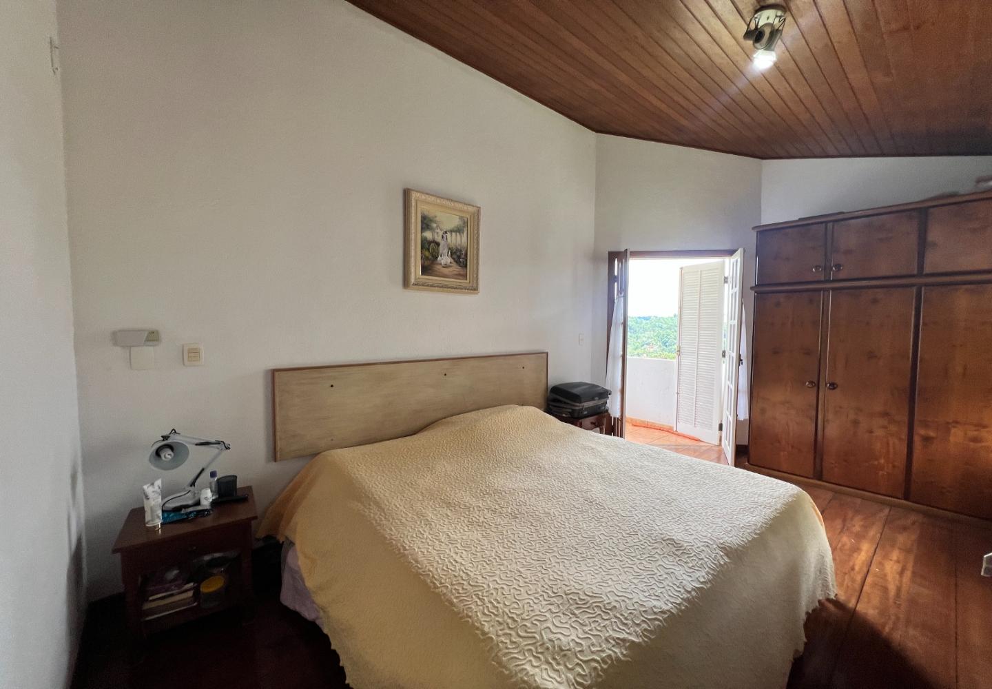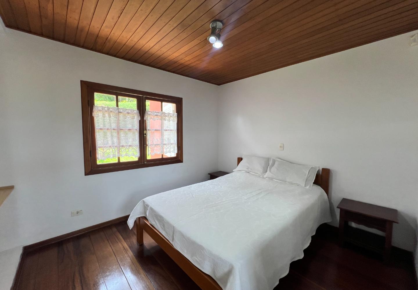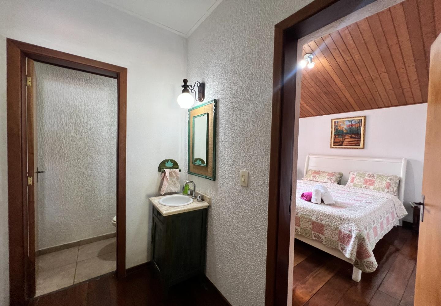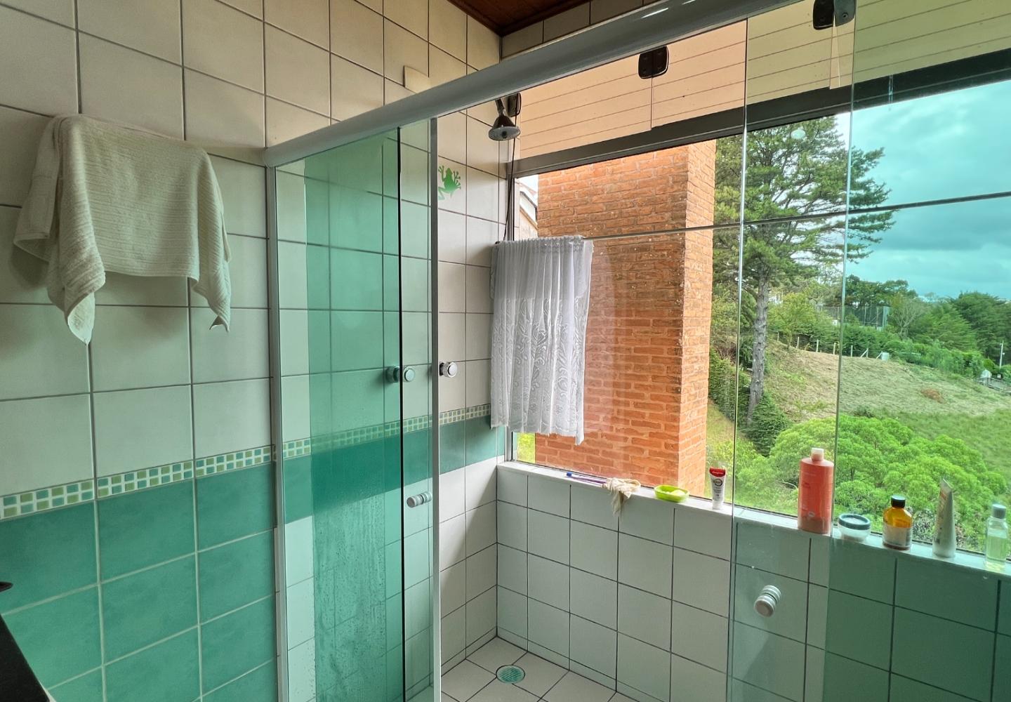 No Atalaia, esta casa se destaca pelo terreno generoso de 2.800 m² e pela implantação que aproveita bem a topografia, com jardins e áreas externas abertas ao verde. São 409 m² de área construída, em um conjunto com linguagem bem característica da serra, incluindo volumes com acabamento em pedra, boa presença de madeira e telhado inclinado.