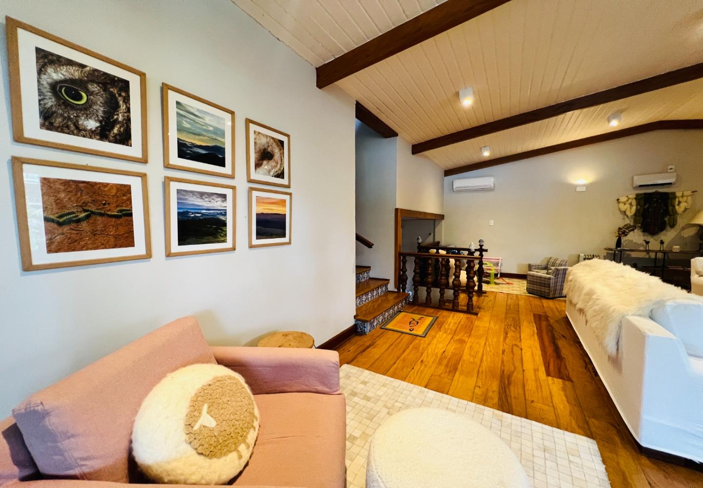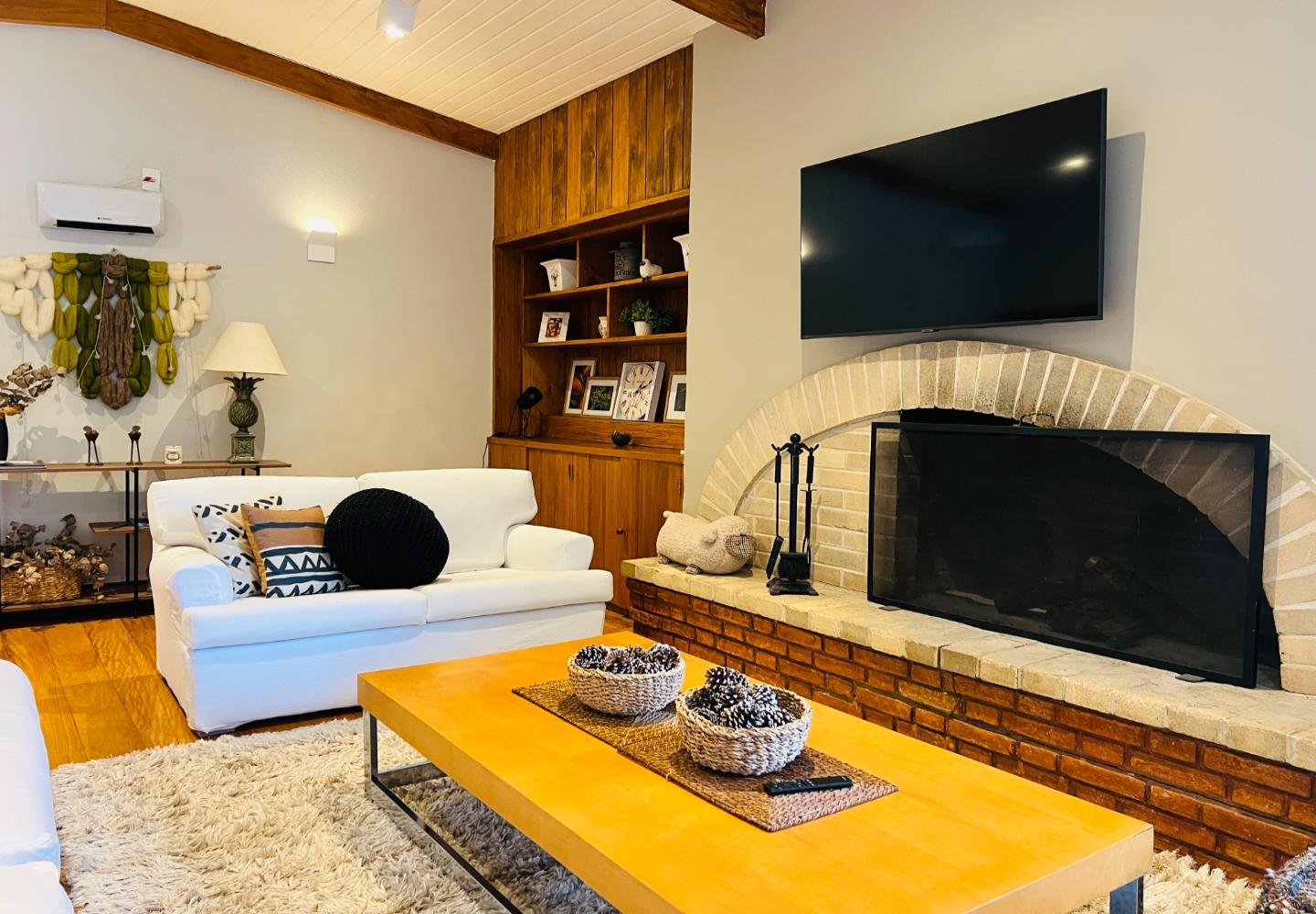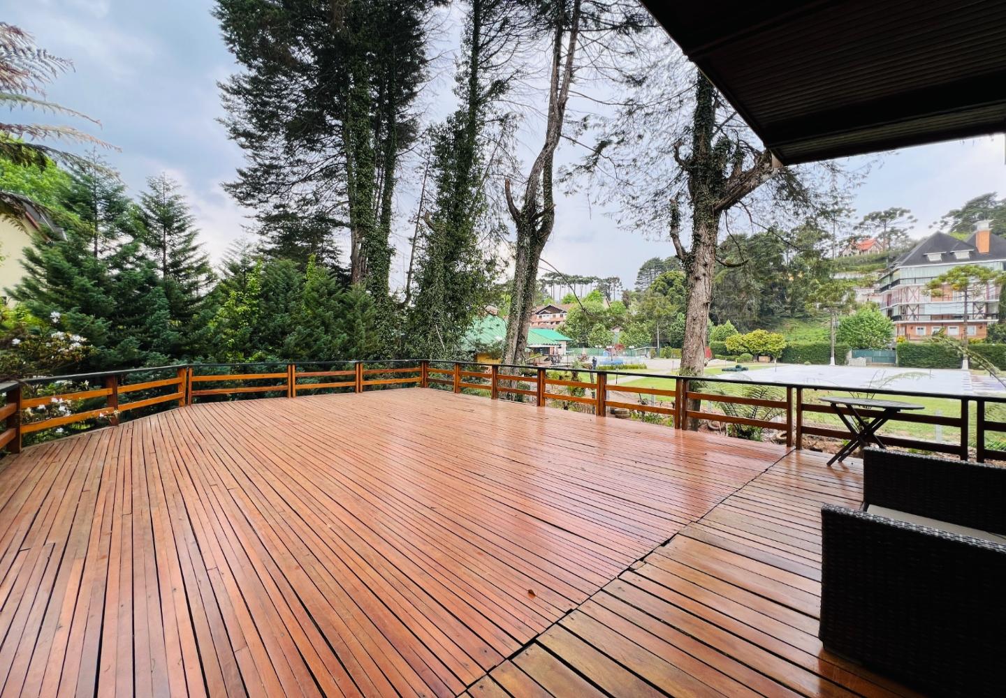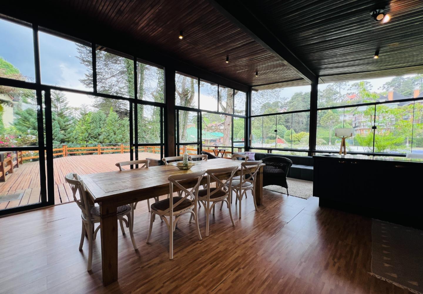 São 350 m² de área construída em um terreno de 800 m², com ambientes bem distribuídos e uma arquitetura que favorece adaptações. O imóvel principal conta com cinco dormitórios, três banheiros, amplas salas com lareira e piso de madeira, além de uma cozinha funcional. O espaço envidraçado integrado ao deck de madeira oferece um cenário agradável e versátil — perfeito para um restaurante, café ou ambiente corporativo que valorize o visual da montanha.
