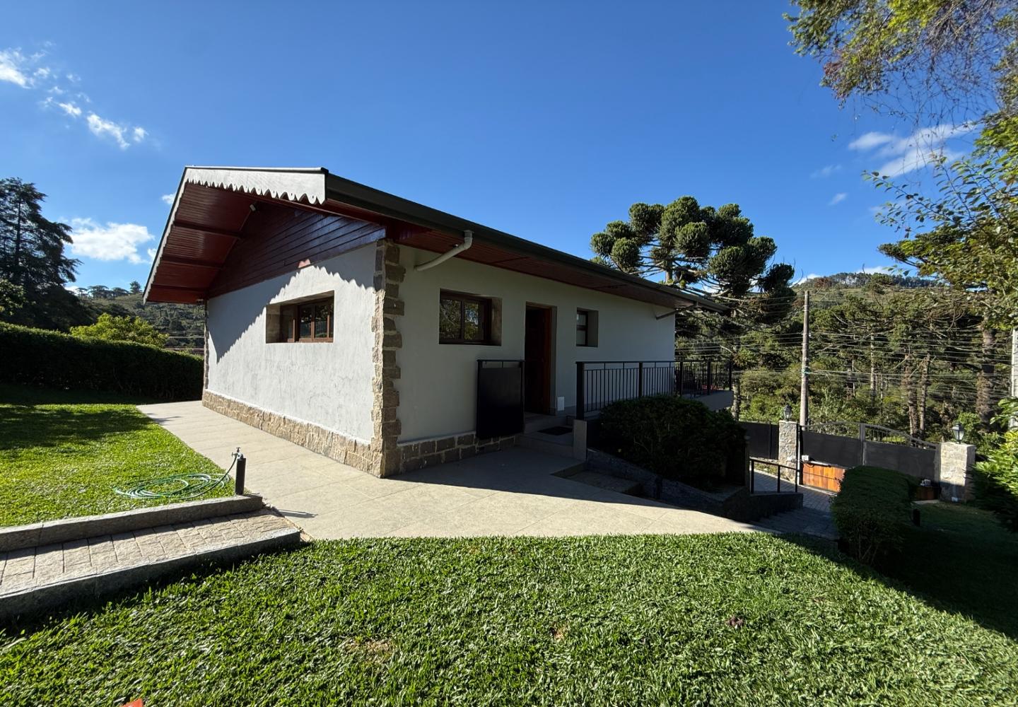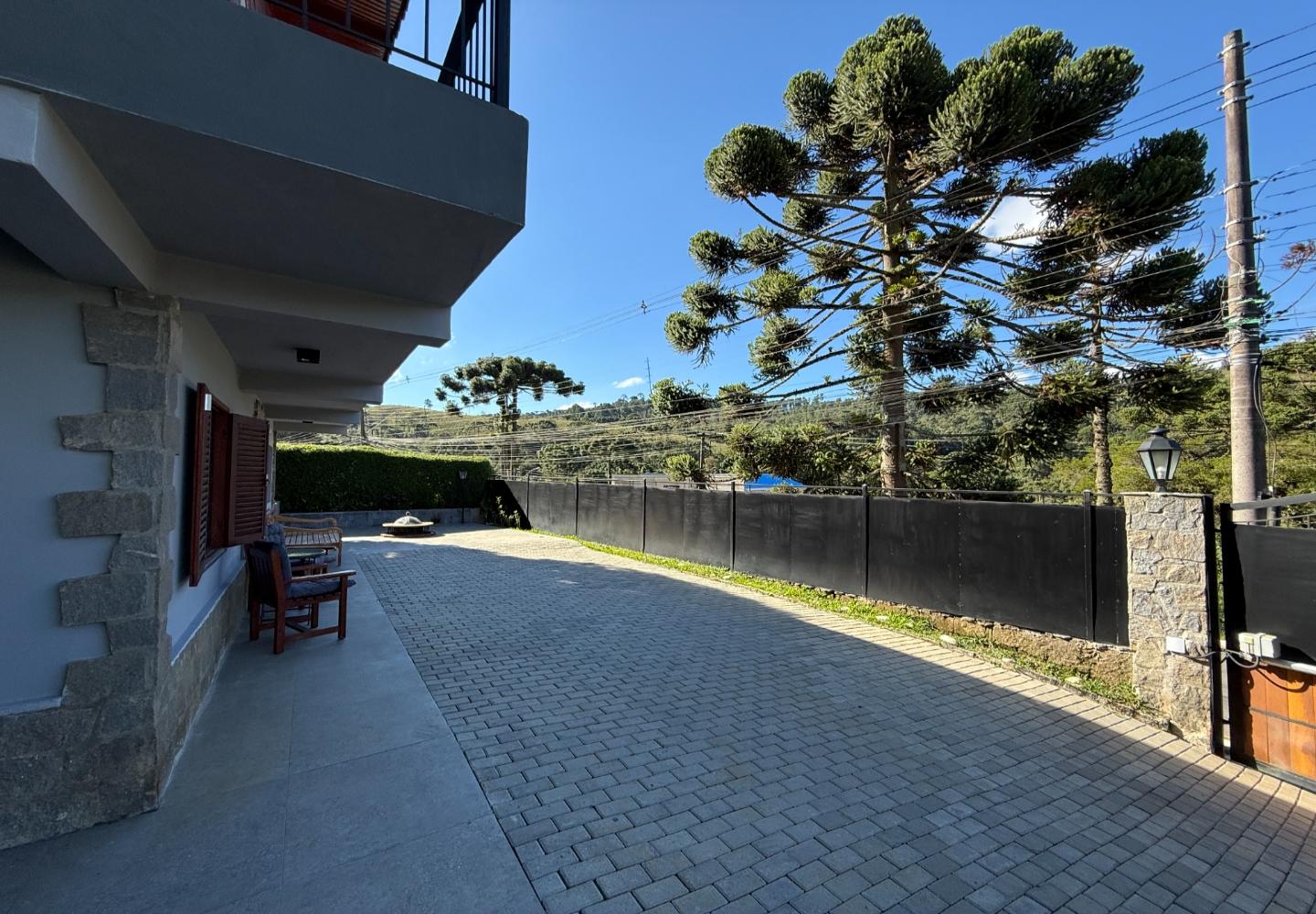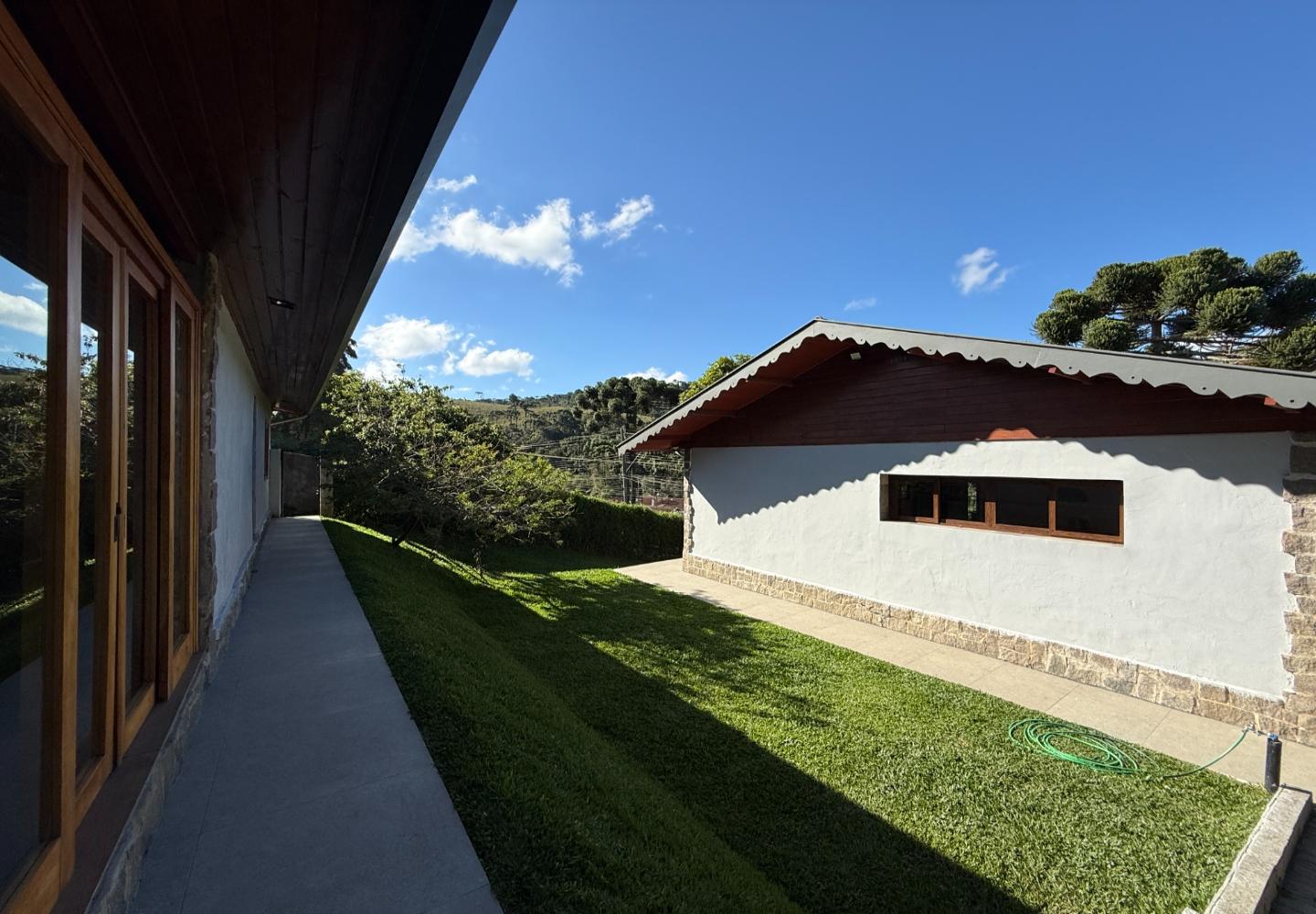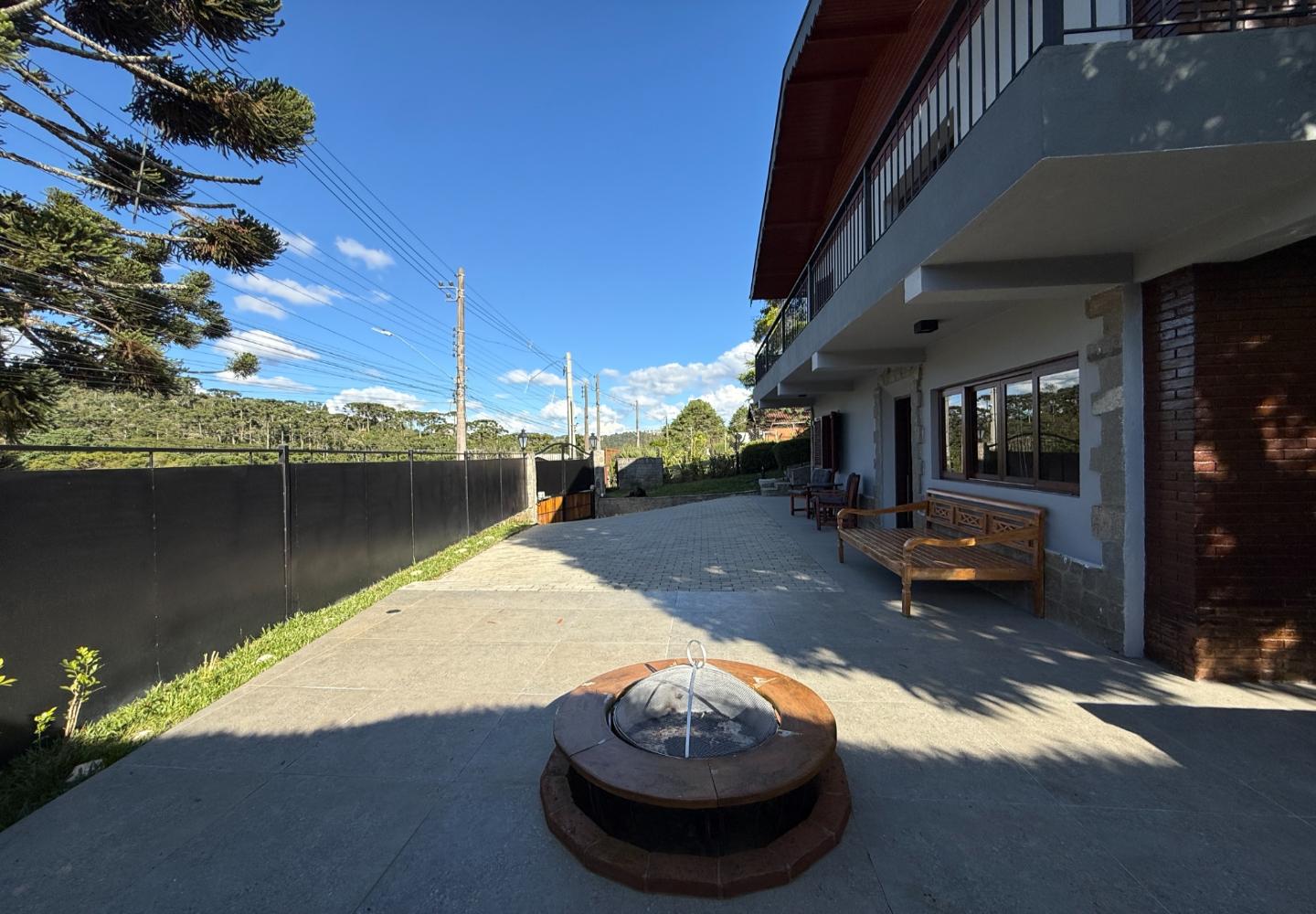 Um diferencial importante é a área gourmet independente e fechada, com churrasqueira e fogão a lenha, além de um pátio externo generoso. Nos fundos, a casa de caseiro tem entrada independente e, mais do que isso, hidráulica e elétrica separadas, permitindo contas individualizadas de água e luz — um ponto que valoriza bastante o imóvel.