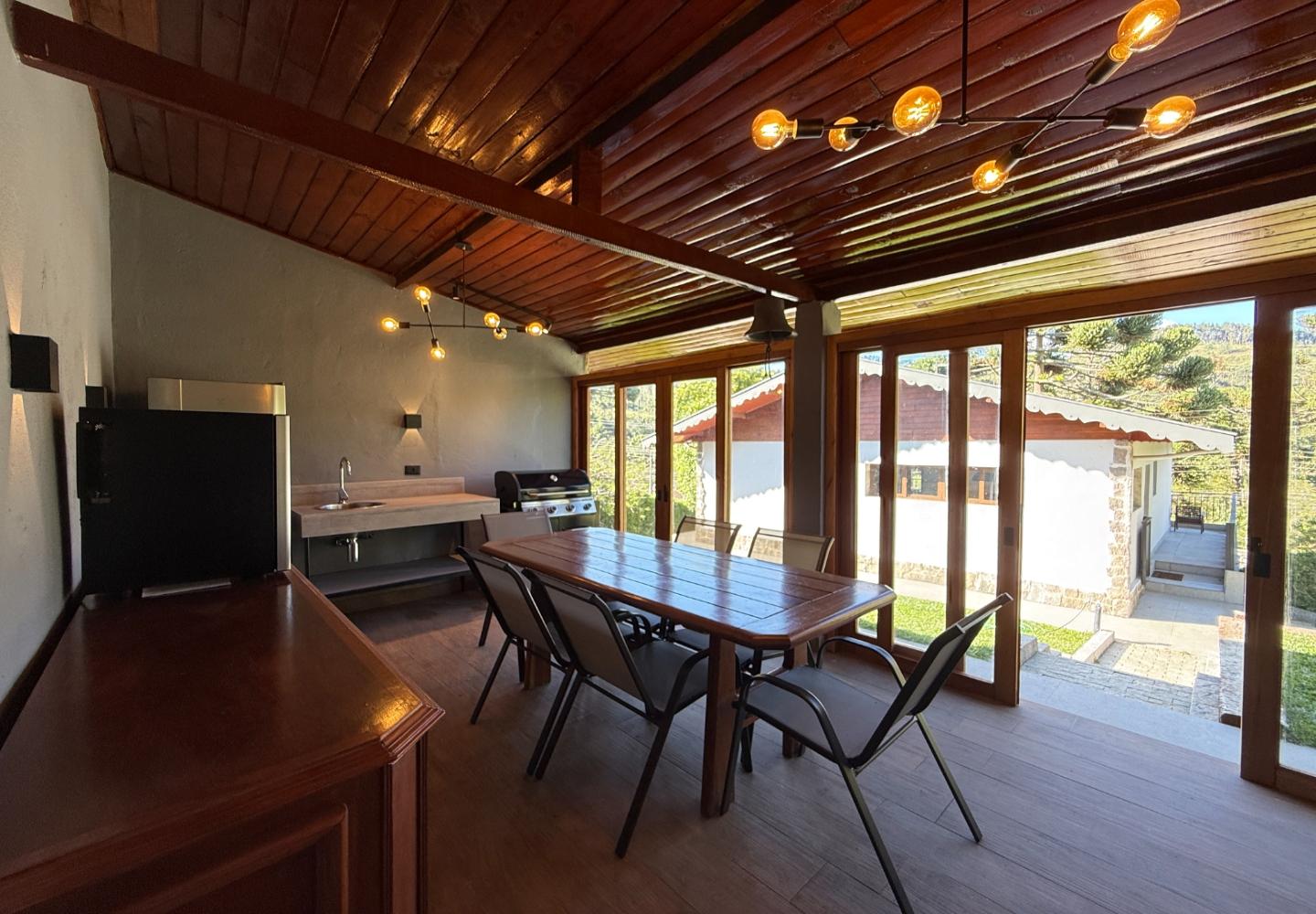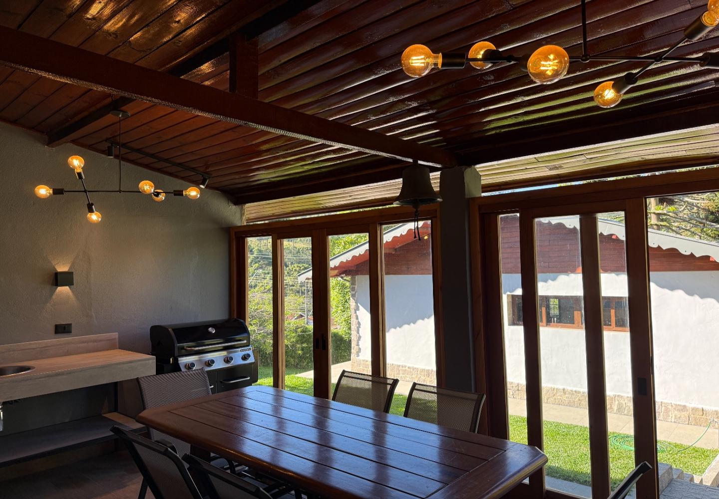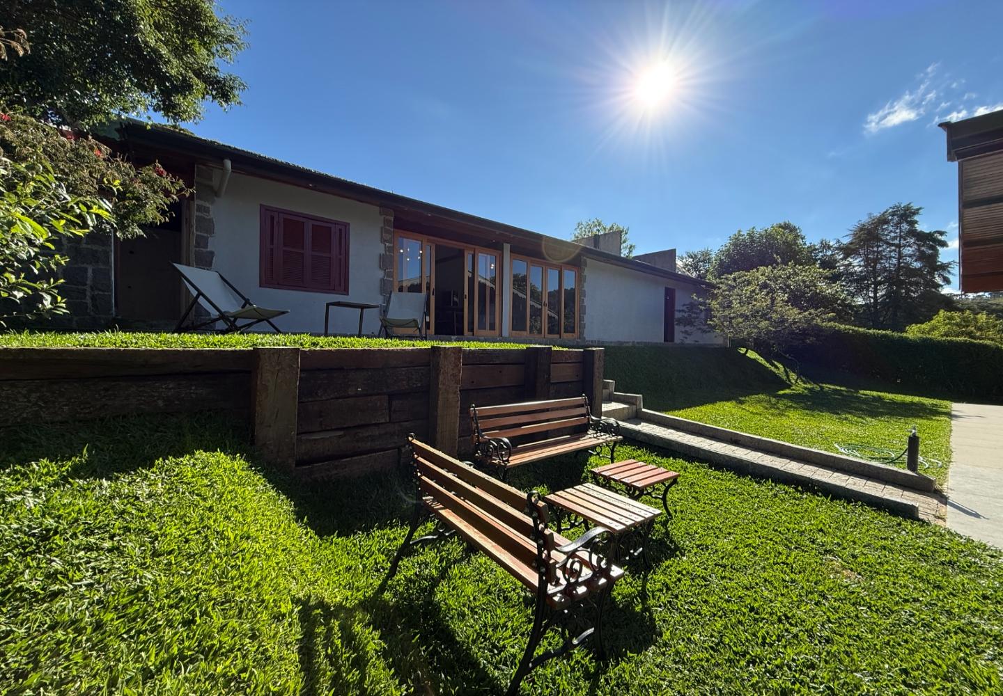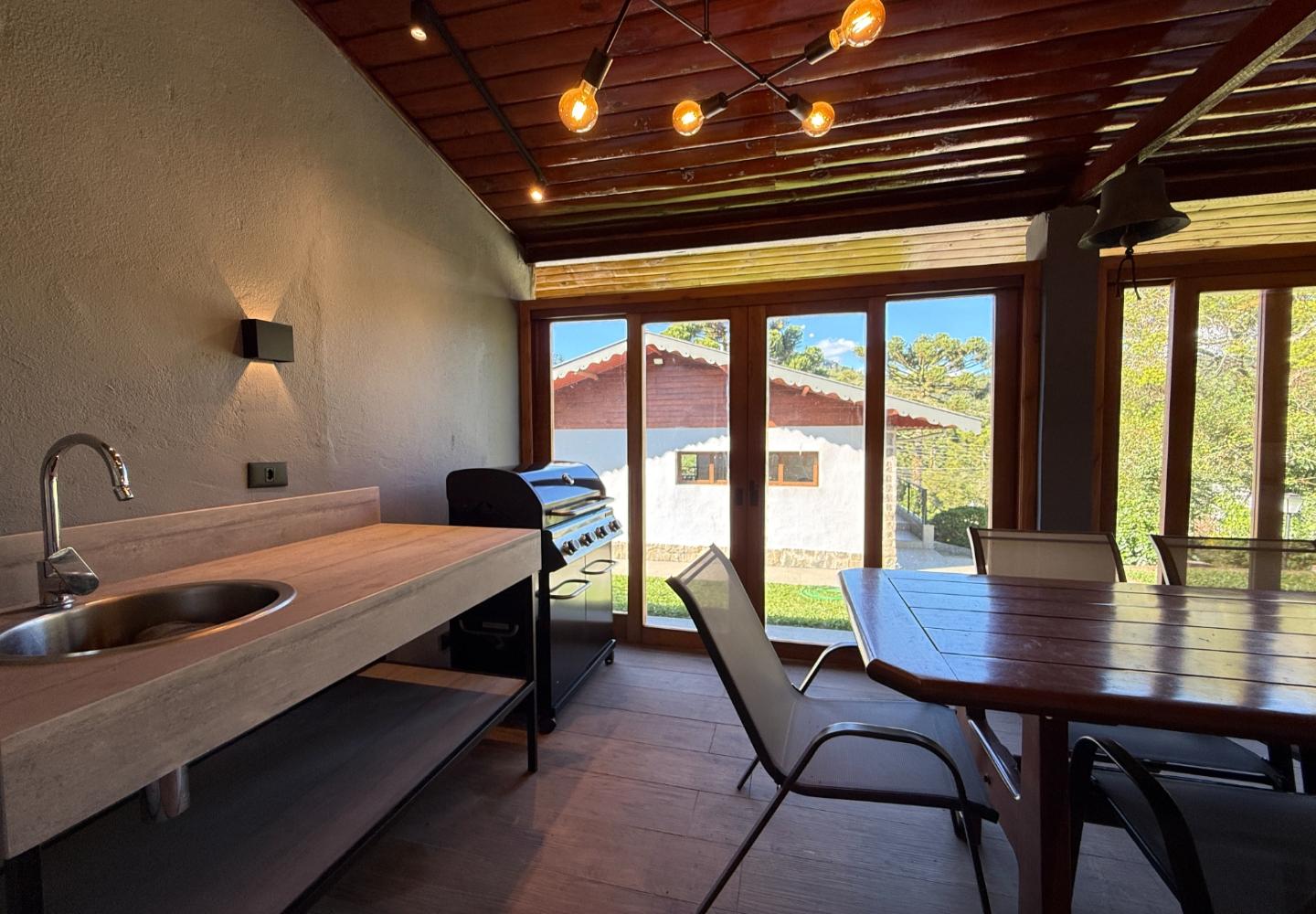 Um diferencial importante é a área gourmet independente e fechada, com churrasqueira e fogão a lenha, além de um pátio externo generoso. Nos fundos, a casa de caseiro tem entrada independente e, mais do que isso, hidráulica e elétrica separadas, permitindo contas individualizadas de água e luz — um ponto que valoriza bastante o imóvel.