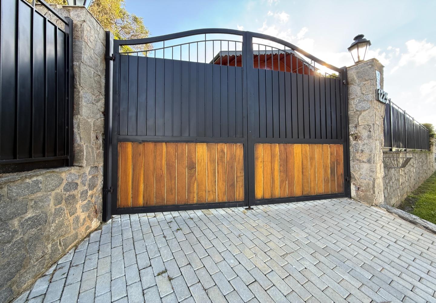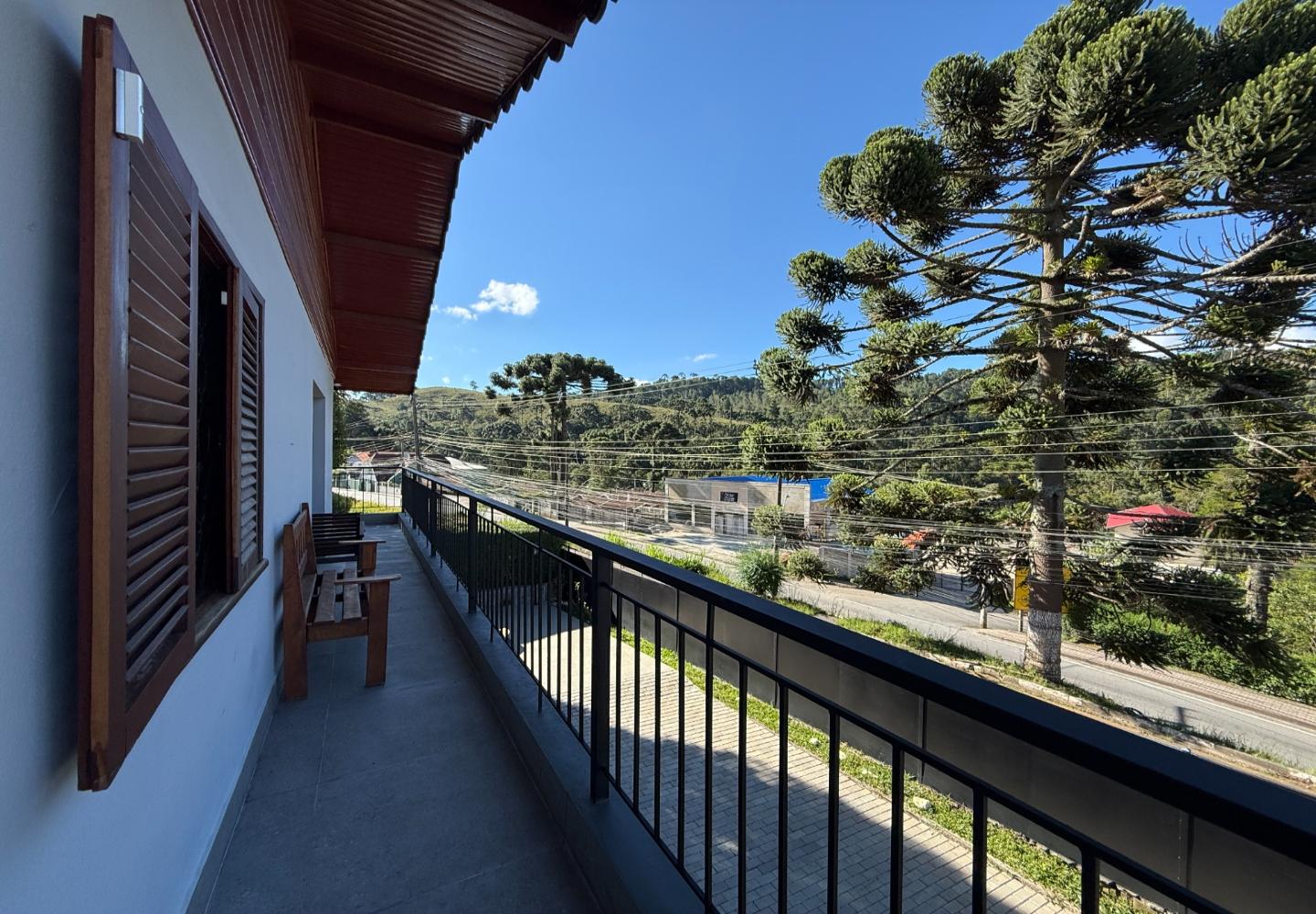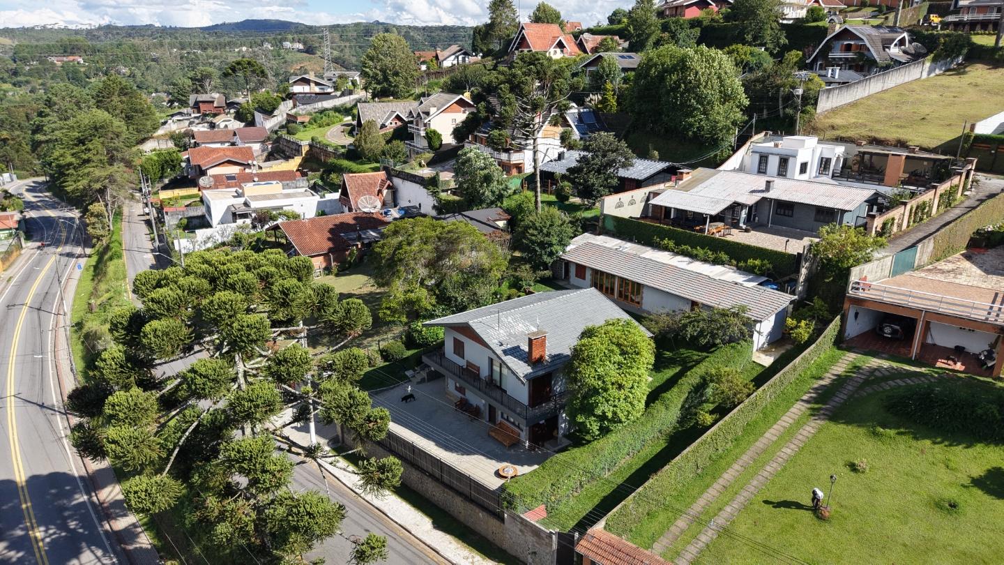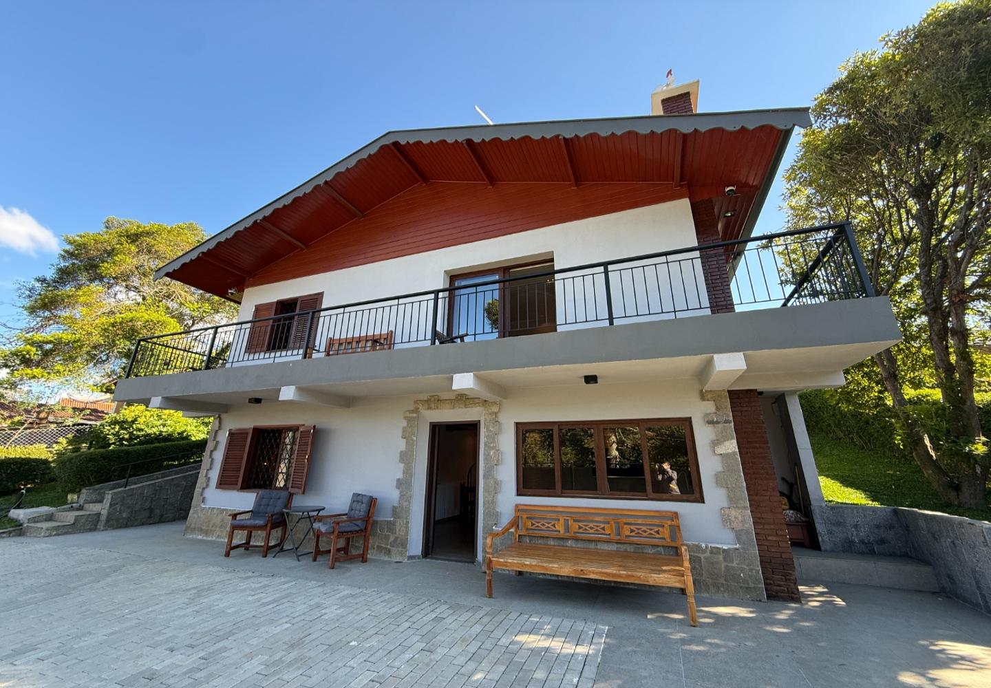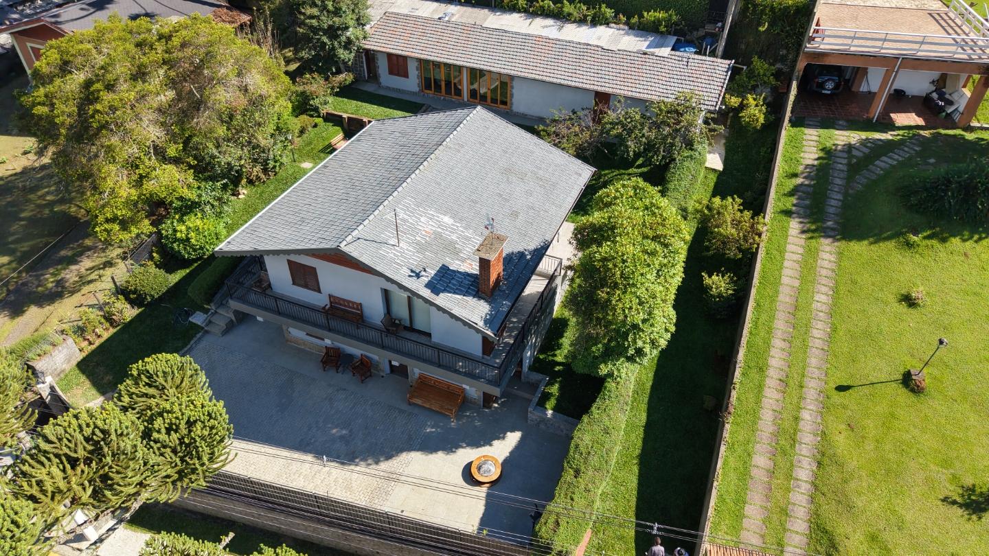 Um diferencial importante é a área gourmet independente e fechada, com churrasqueira e fogão a lenha, além de um pátio externo generoso. Nos fundos, a casa de caseiro tem entrada independente e, mais do que isso, hidráulica e elétrica separadas, permitindo contas individualizadas de água e luz — um ponto que valoriza bastante o imóvel.
