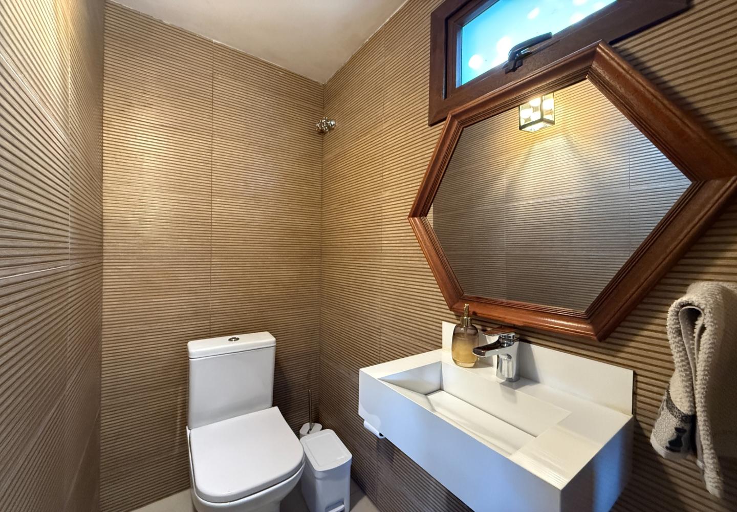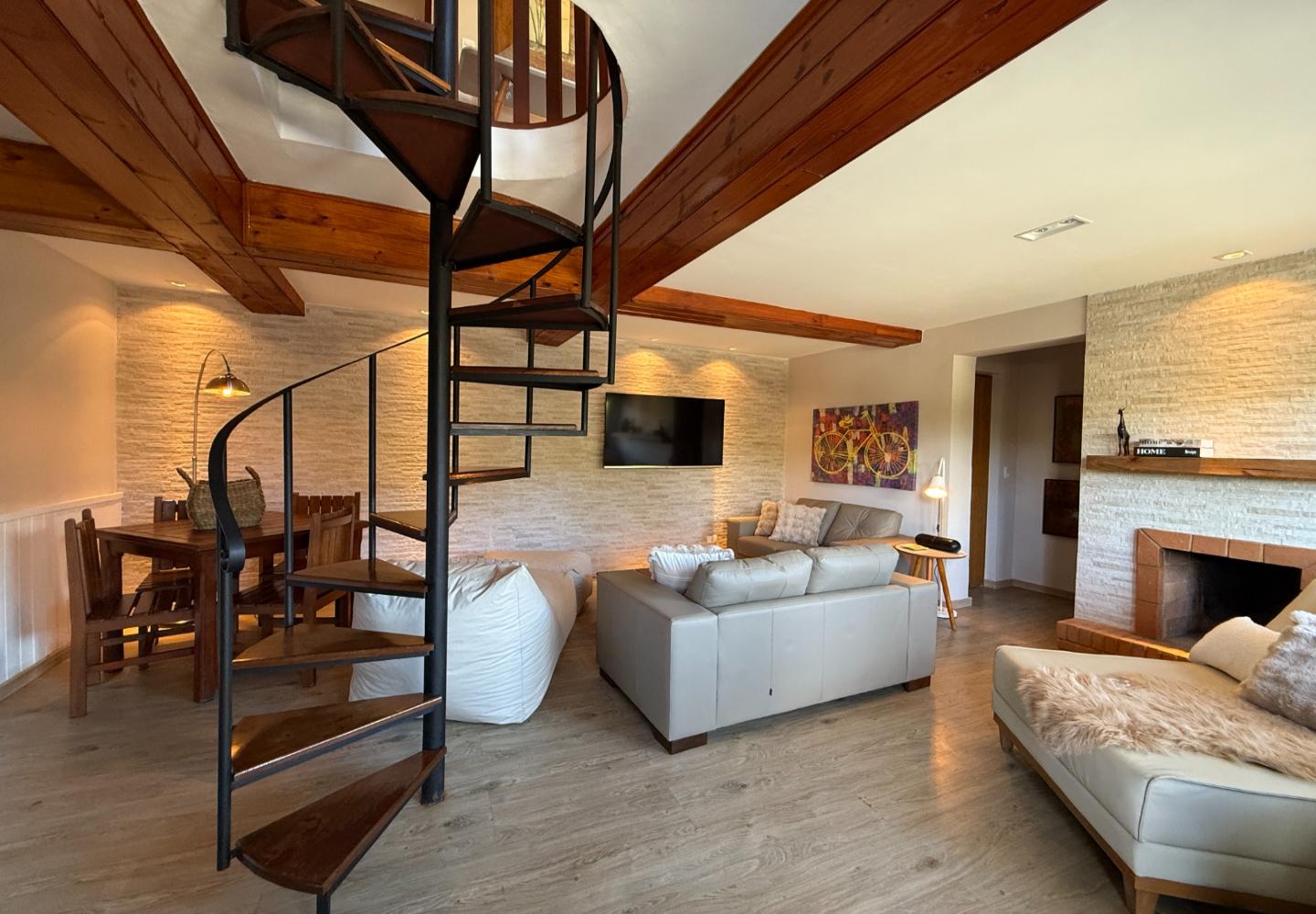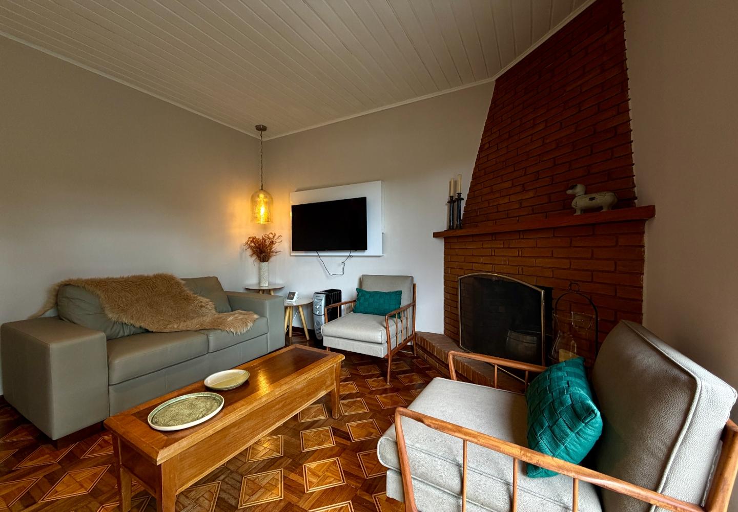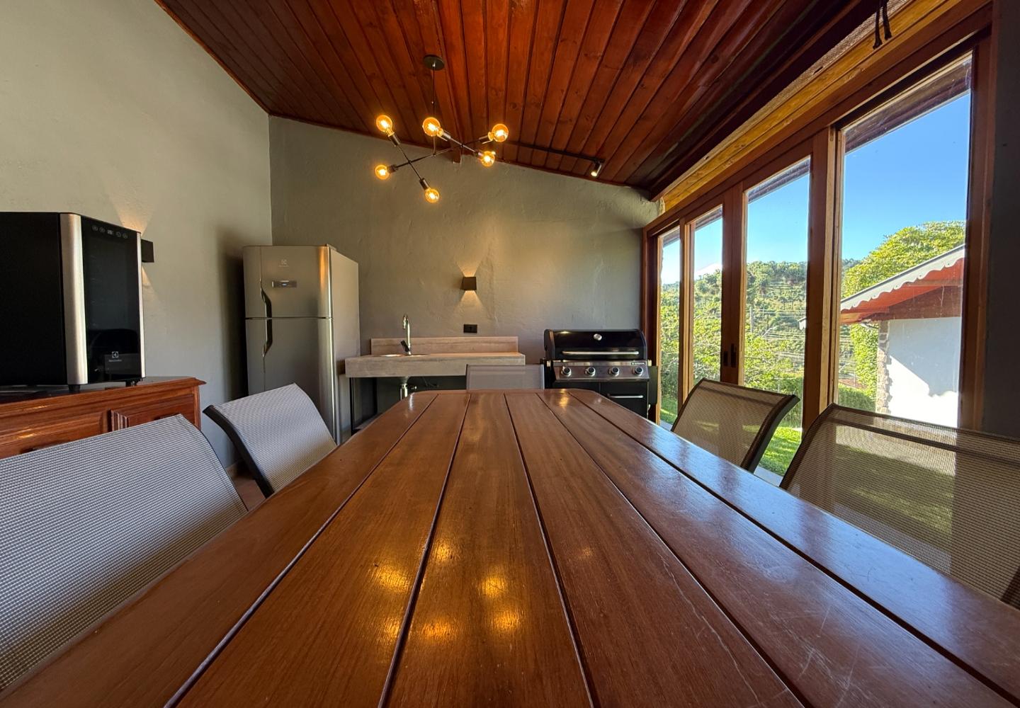 Um diferencial importante é a área gourmet independente e fechada, com churrasqueira e fogão a lenha, além de um pátio externo generoso. Nos fundos, a casa de caseiro tem entrada independente e, mais do que isso, hidráulica e elétrica separadas, permitindo contas individualizadas de água e luz — um ponto que valoriza bastante o imóvel.
