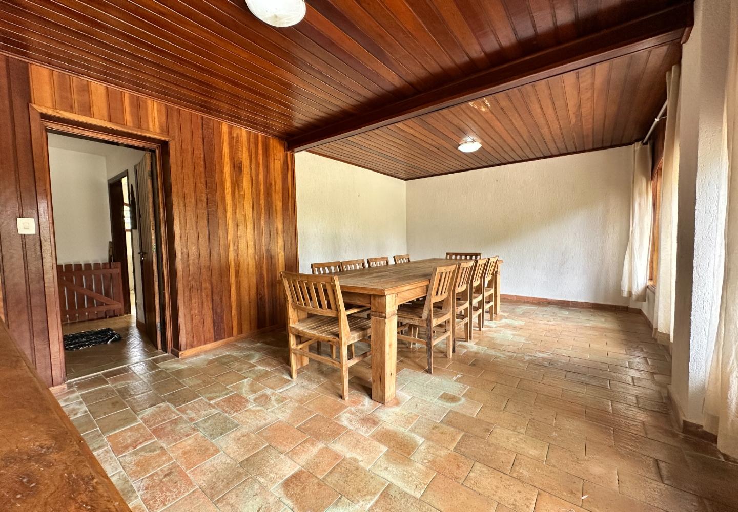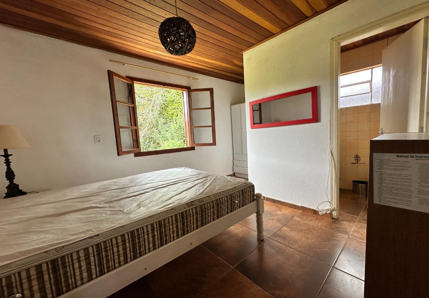 A casa principal conta com uma sala espaçosa dividida em ambientes de estar e TV, lareira, sala de jantar, varanda, lavabo e uma cozinha com copa e despensa. No piso superior, há uma suíte e dois dormitórios atendidos por banheiro social, todos com acesso à varanda e vista para o jardim.