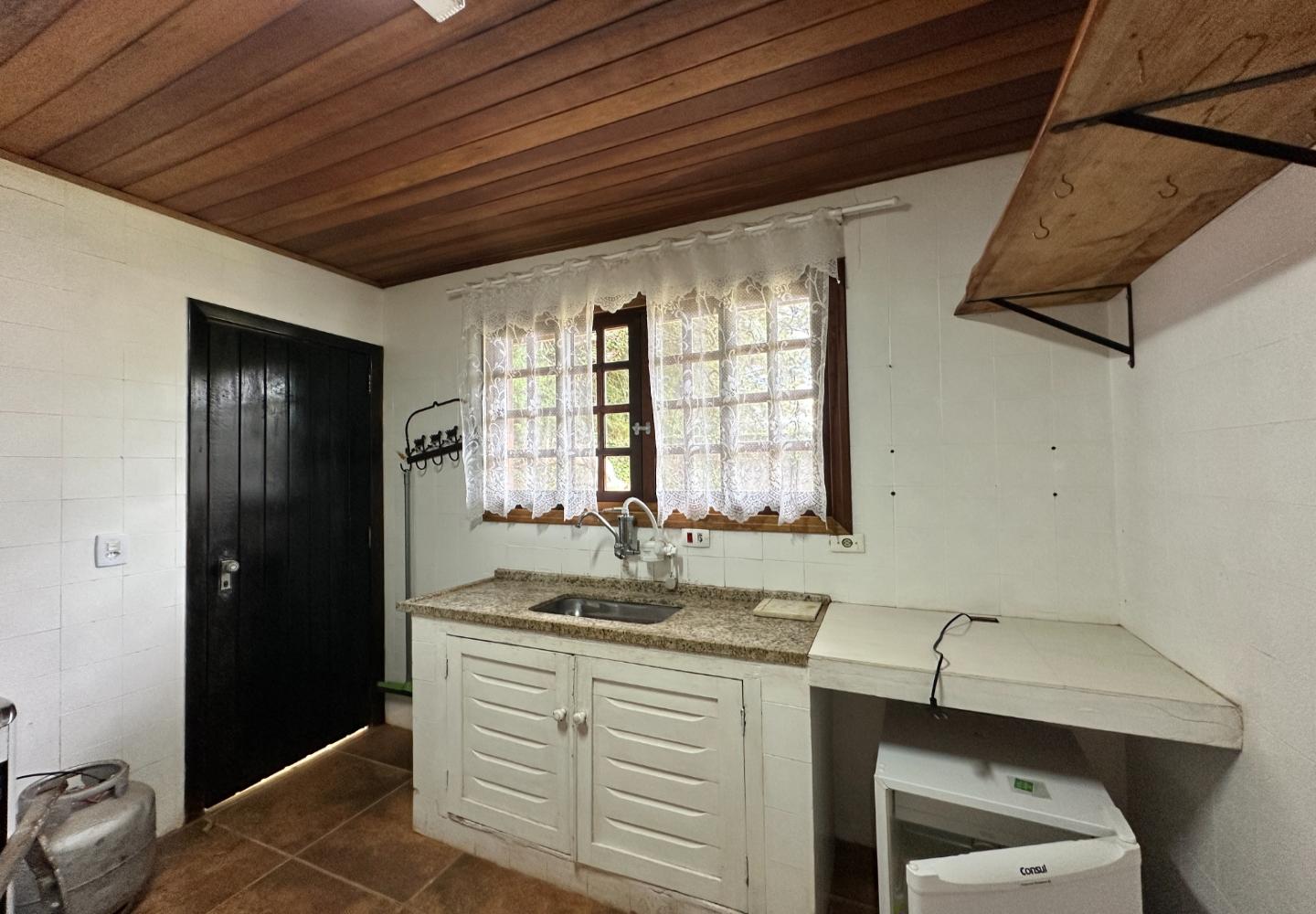 A casa de hóspedes possui sala com lareira, cozinha, uma suíte e um dormitório adicional com banheiro social.