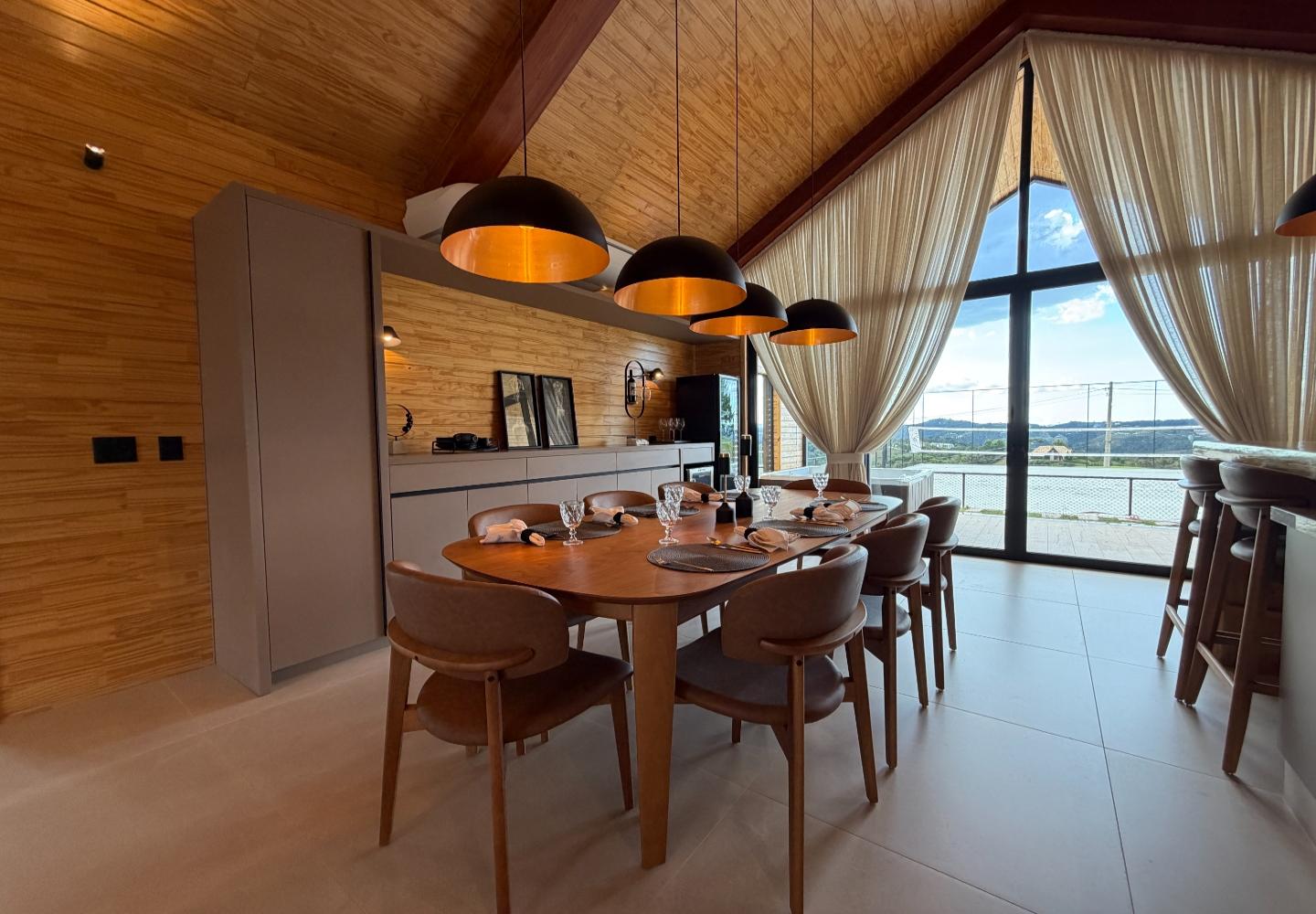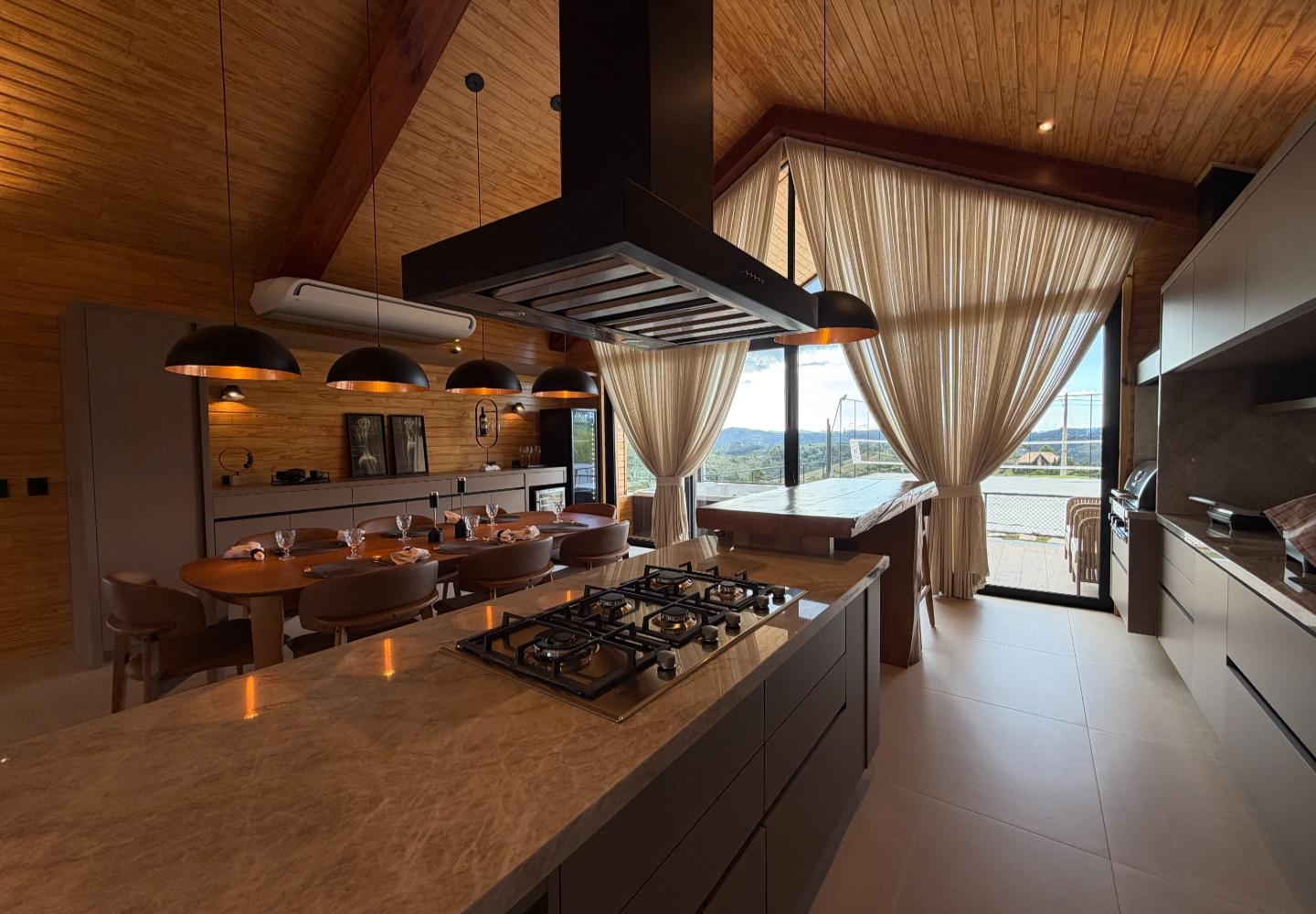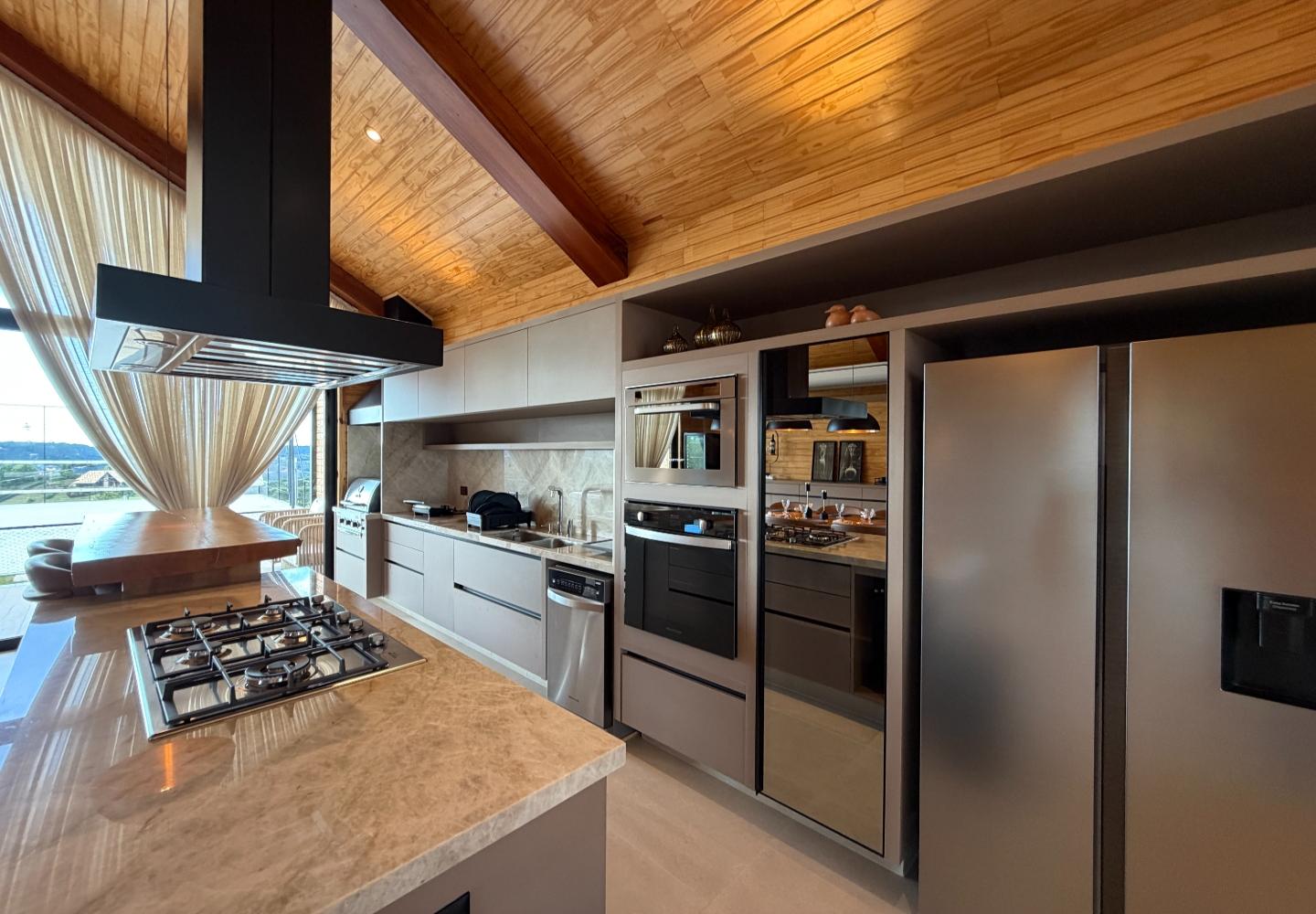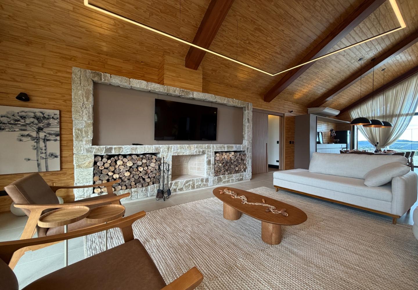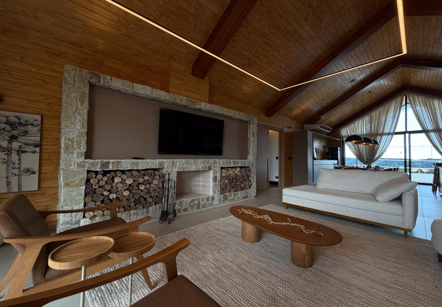 A área social é marcada por pé-direito elevado, grandes panos de vidro e lareira em pedra, criando uma conexão direta entre interior e exterior. Os ambientes se abrem para o deck e para a área externa, de onde a vista se torna parte do cotidiano. A casa conta com três suítes bem distribuídas, garantindo conforto e privacidade, além de acabamentos atuais e soluções funcionais no dia a dia.