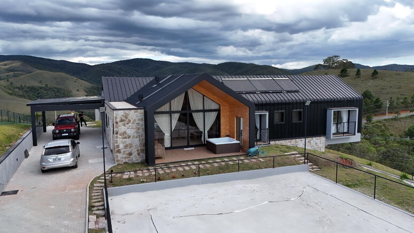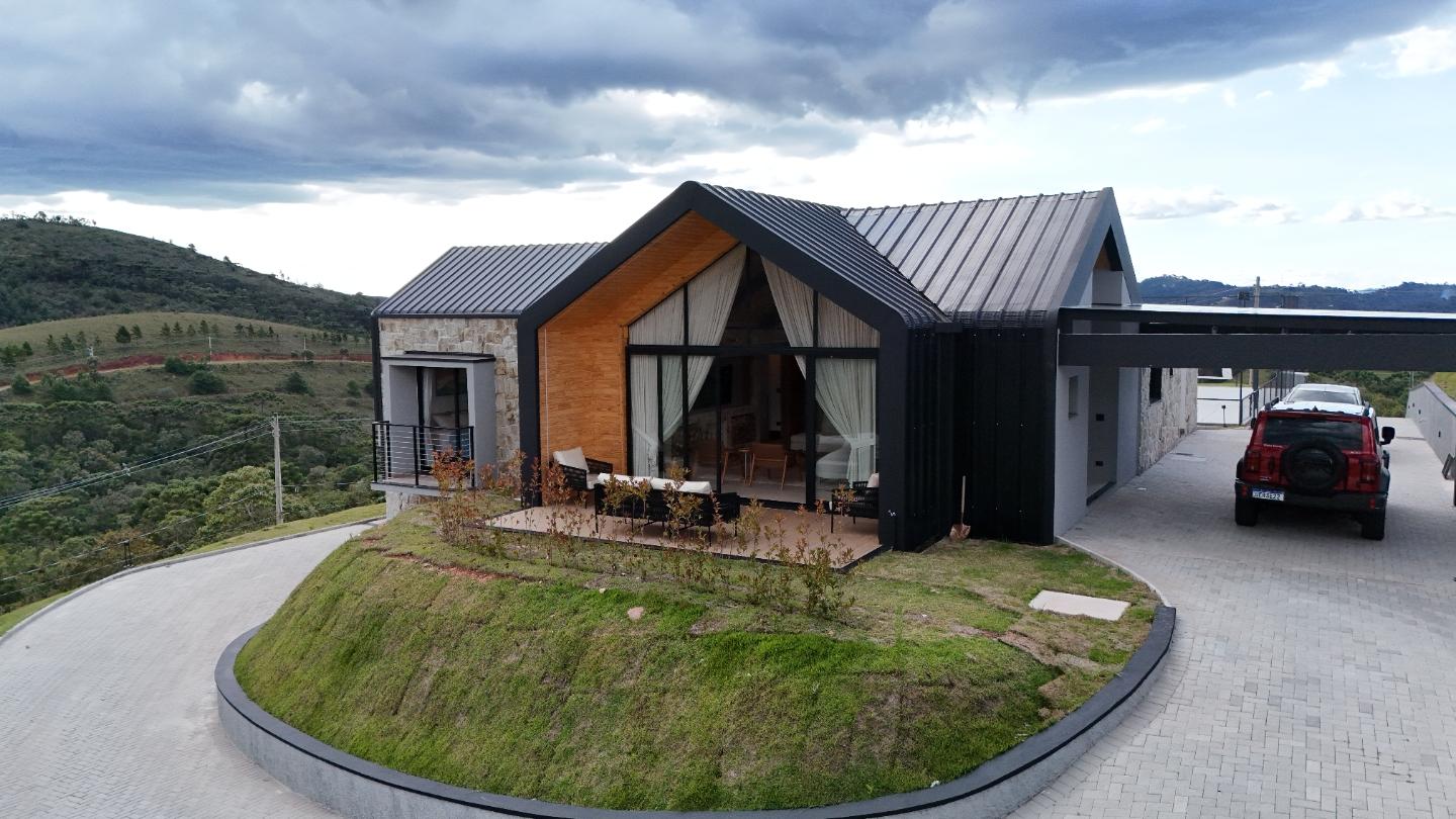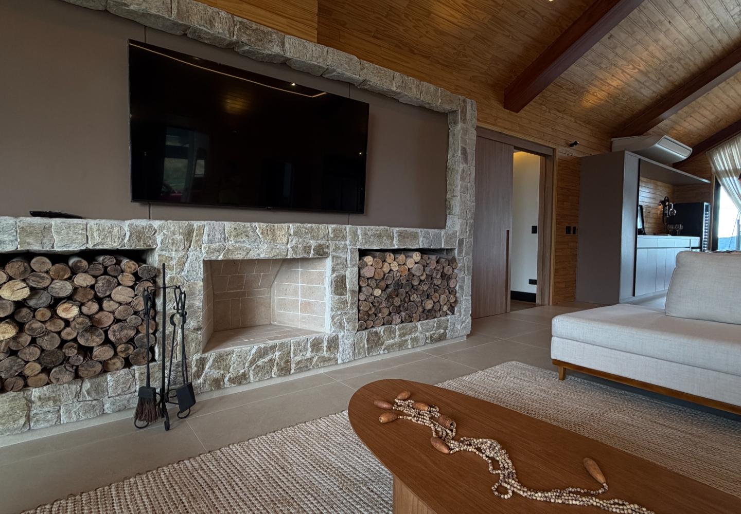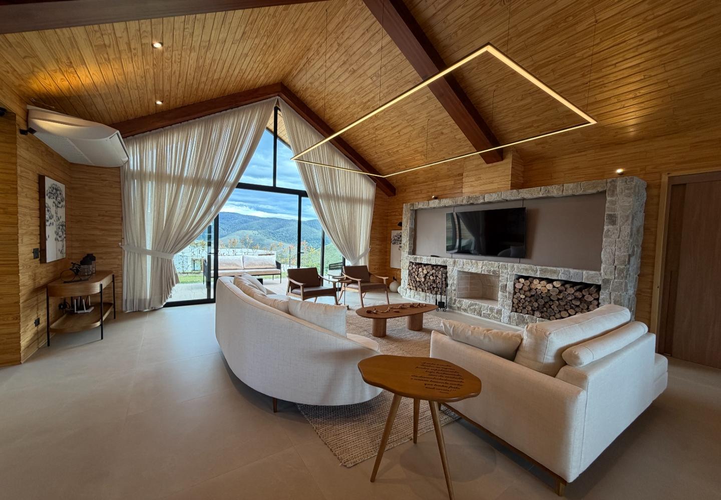 A área social é marcada por pé-direito elevado, grandes panos de vidro e lareira em pedra, criando uma conexão direta entre interior e exterior. Os ambientes se abrem para o deck e para a área externa, de onde a vista se torna parte do cotidiano. A casa conta com três suítes bem distribuídas, garantindo conforto e privacidade, além de acabamentos atuais e soluções funcionais no dia a dia.