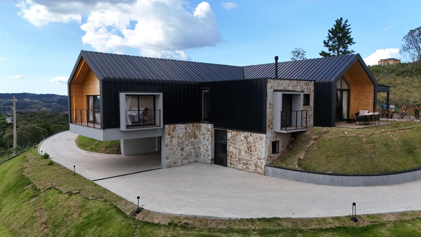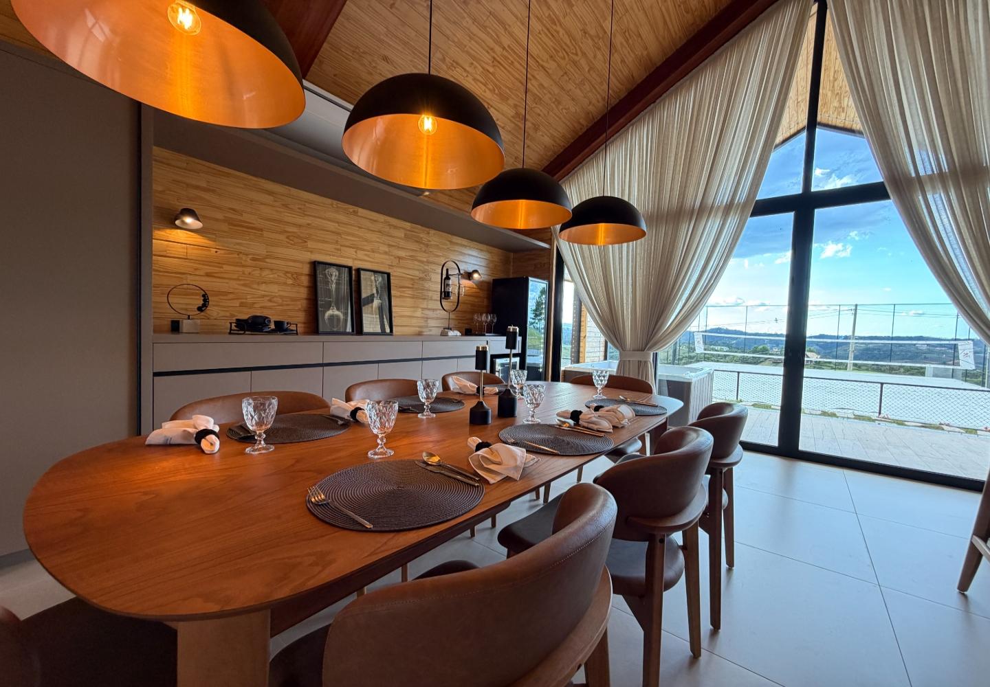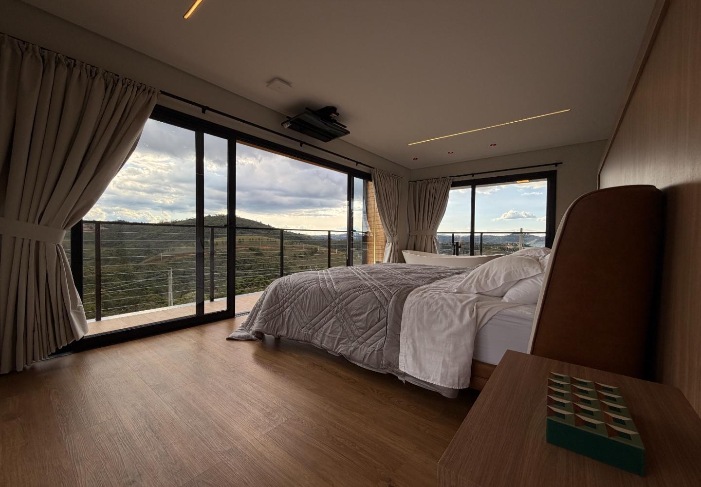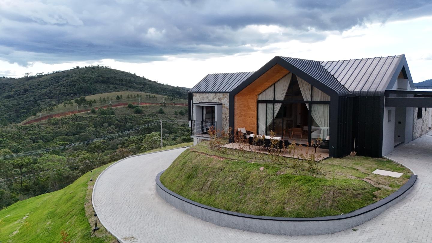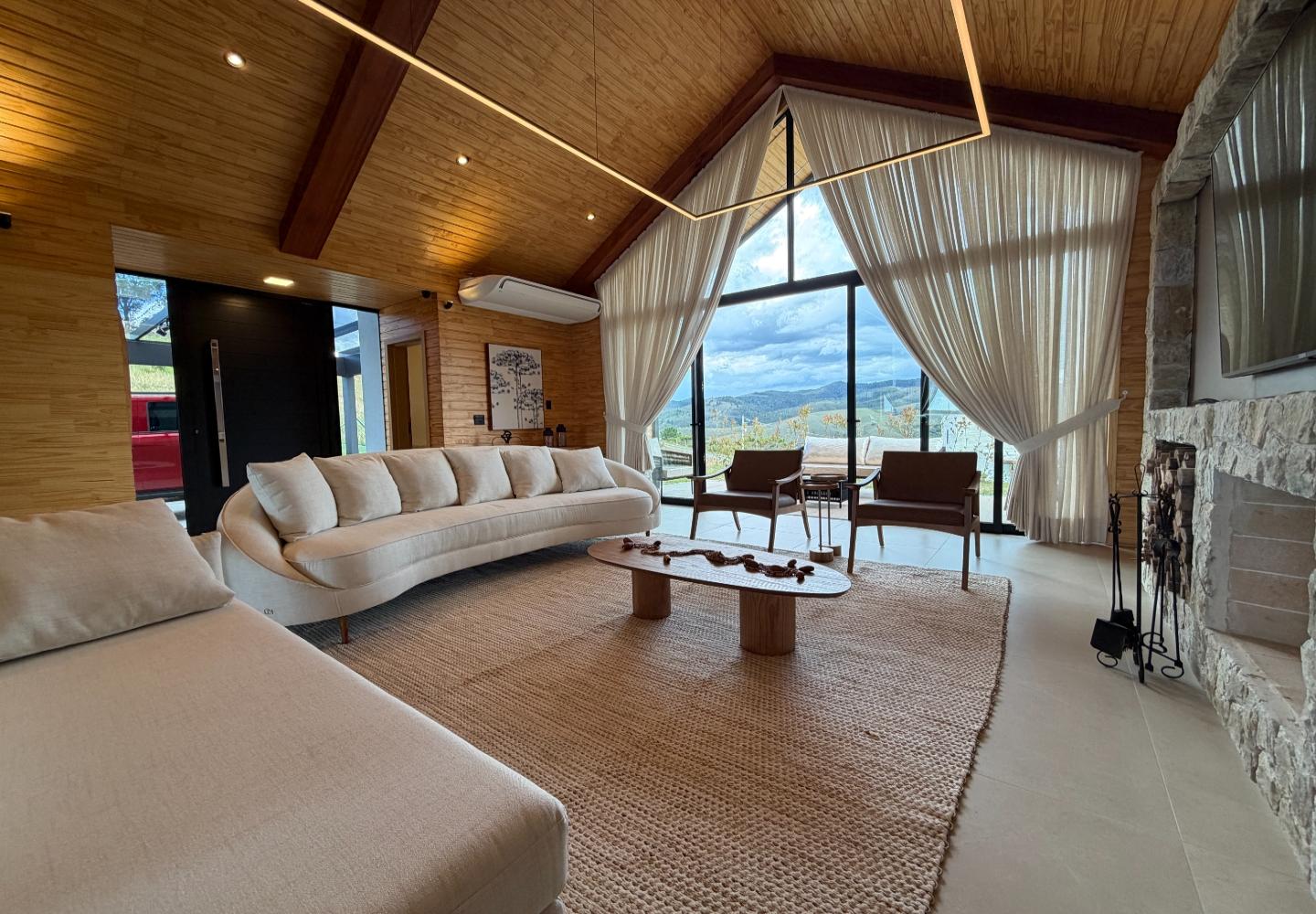 A área social é marcada por pé-direito elevado, grandes panos de vidro e lareira em pedra, criando uma conexão direta entre interior e exterior. Os ambientes se abrem para o deck e para a área externa, de onde a vista se torna parte do cotidiano. A casa conta com três suítes bem distribuídas, garantindo conforto e privacidade, além de acabamentos atuais e soluções funcionais no dia a dia.