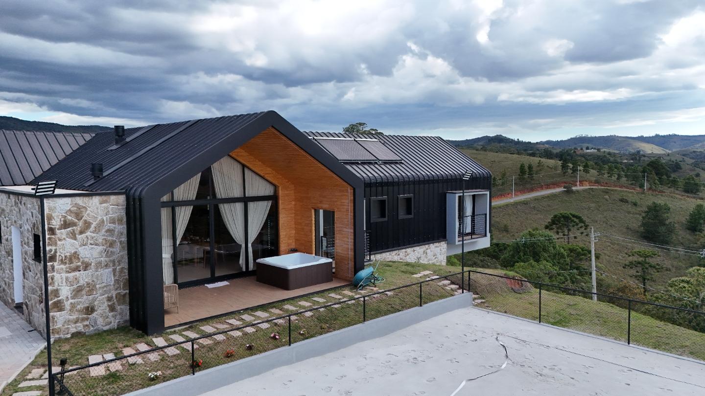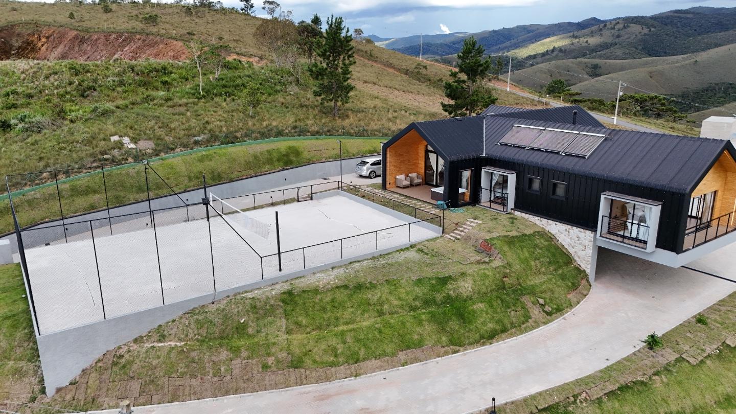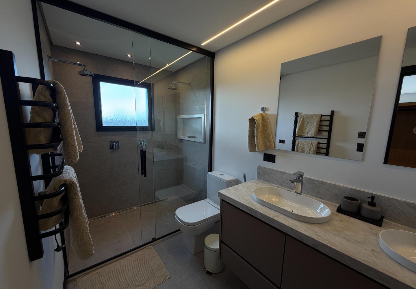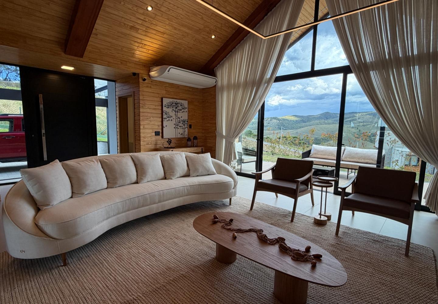 A área social é marcada por pé-direito elevado, grandes panos de vidro e lareira em pedra, criando uma conexão direta entre interior e exterior. Os ambientes se abrem para o deck e para a área externa, de onde a vista se torna parte do cotidiano. A casa conta com três suítes bem distribuídas, garantindo conforto e privacidade, além de acabamentos atuais e soluções funcionais no dia a dia.