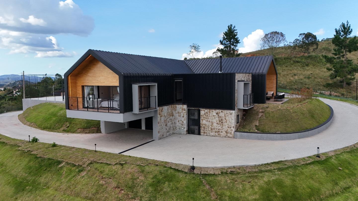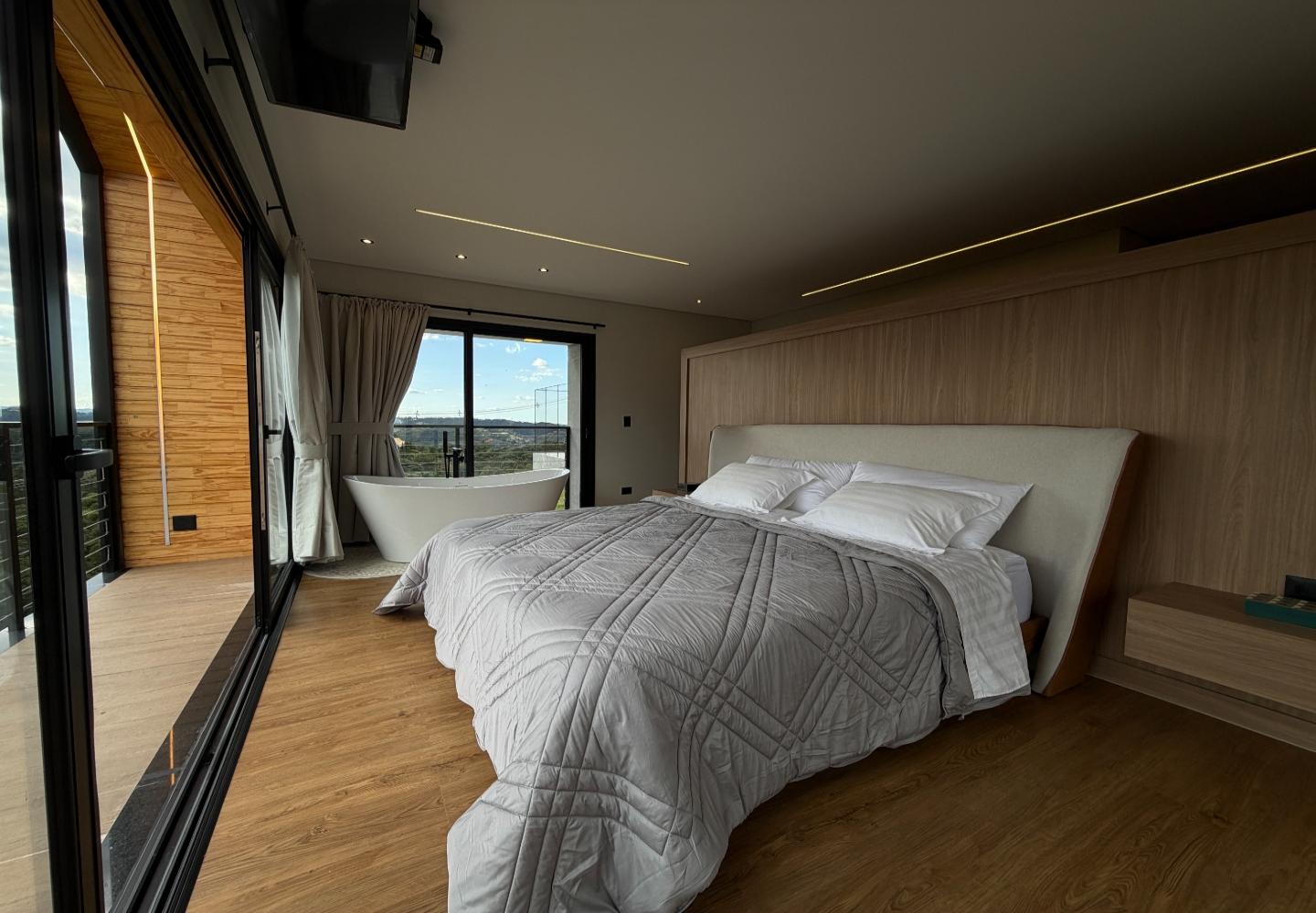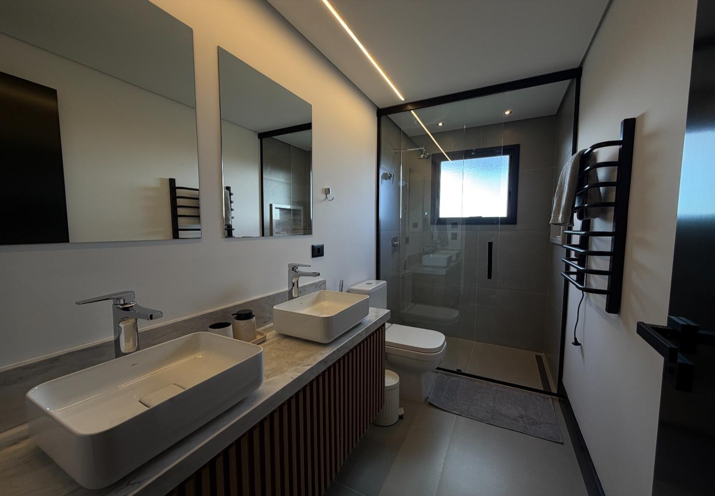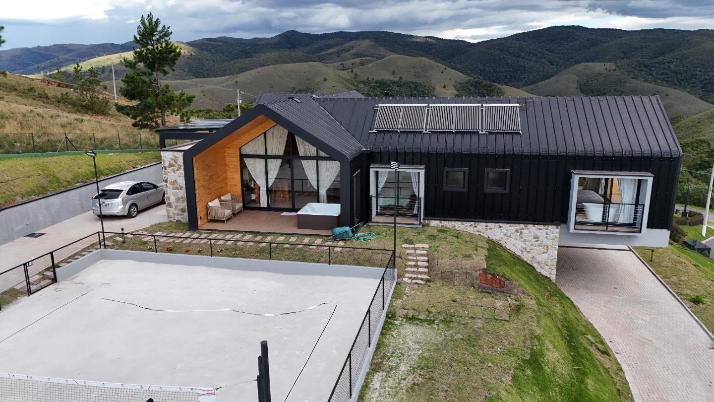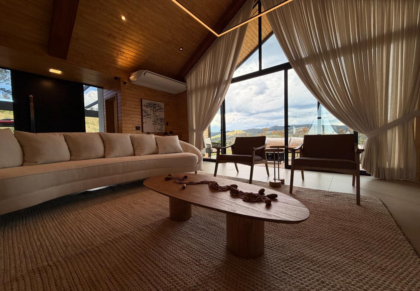 A área social é marcada por pé-direito elevado, grandes panos de vidro e lareira em pedra, criando uma conexão direta entre interior e exterior. Os ambientes se abrem para o deck e para a área externa, de onde a vista se torna parte do cotidiano. A casa conta com três suítes bem distribuídas, garantindo conforto e privacidade, além de acabamentos atuais e soluções funcionais no dia a dia.