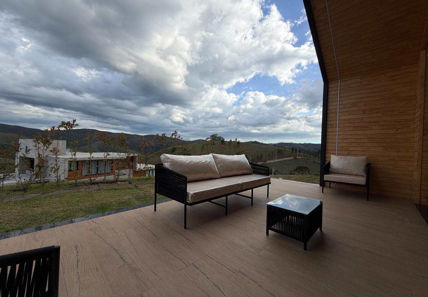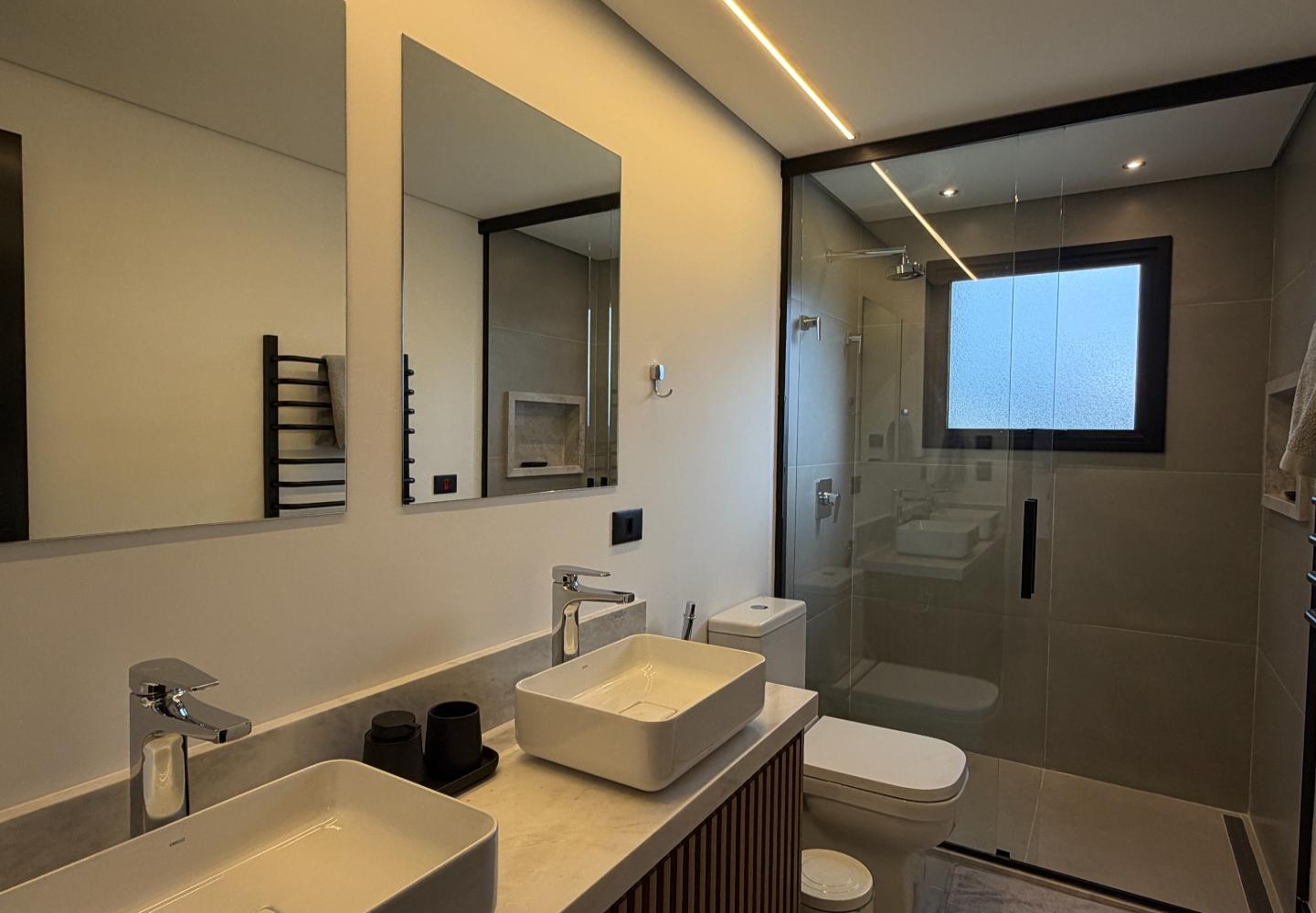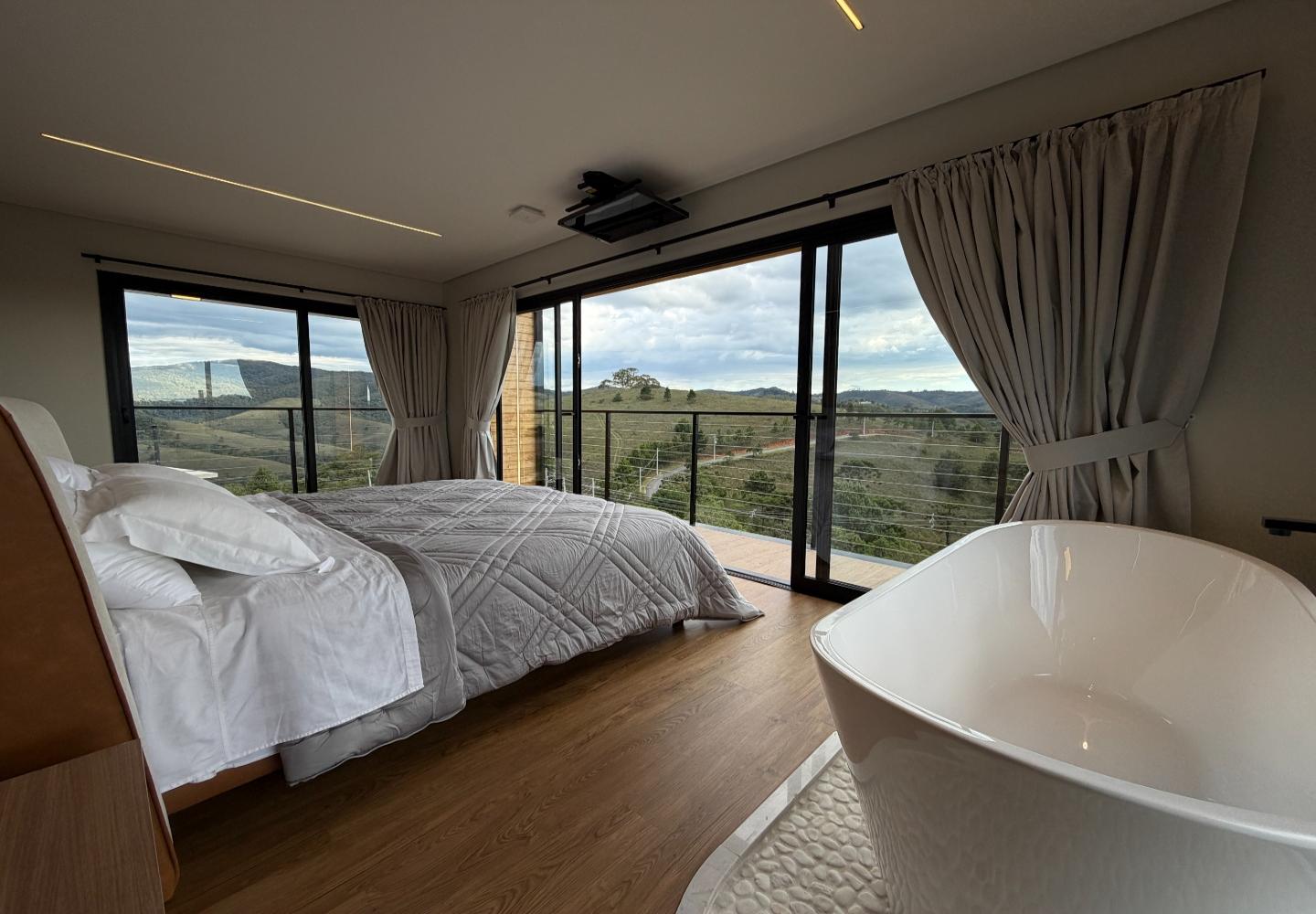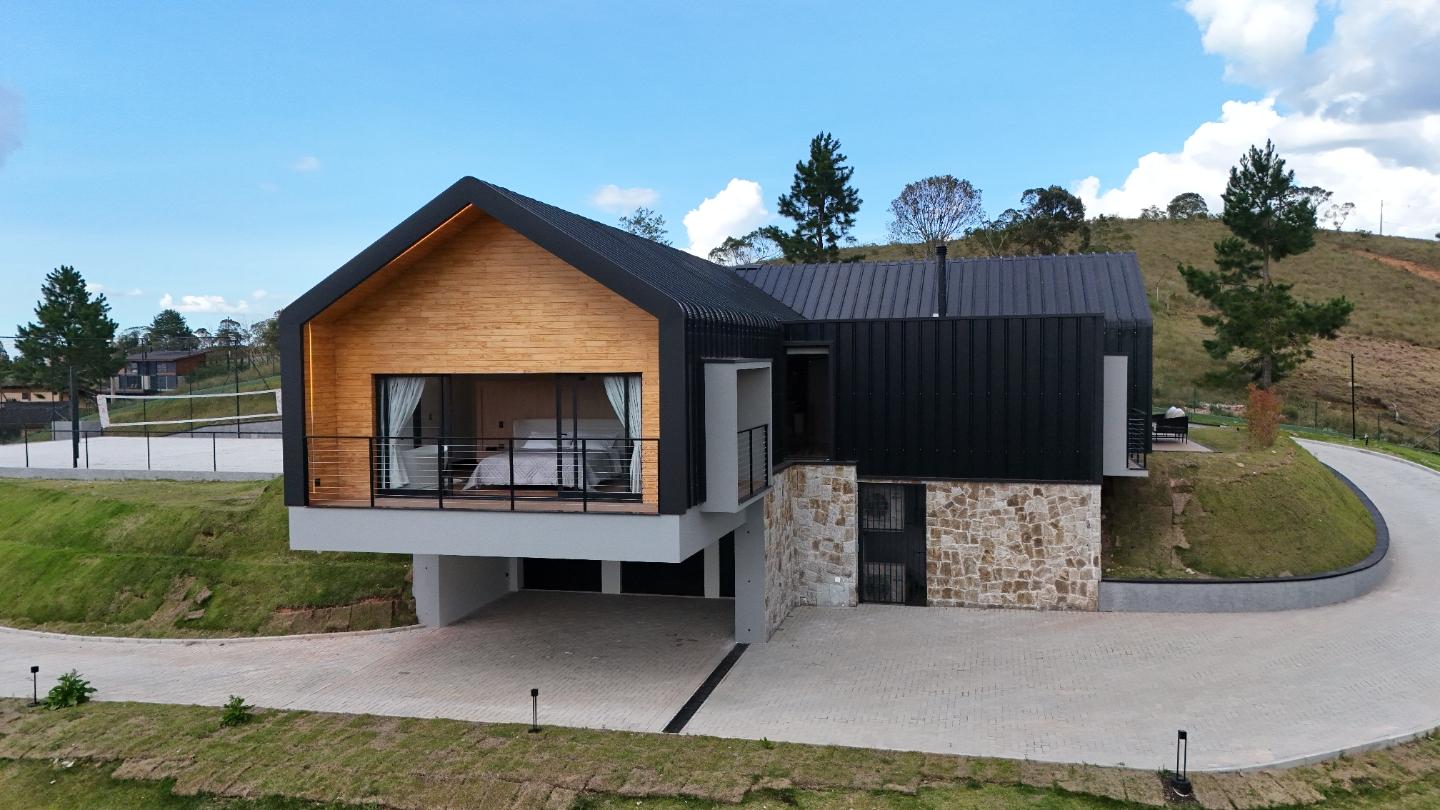 A área social é marcada por pé-direito elevado, grandes panos de vidro e lareira em pedra, criando uma conexão direta entre interior e exterior. Os ambientes se abrem para o deck e para a área externa, de onde a vista se torna parte do cotidiano. A casa conta com três suítes bem distribuídas, garantindo conforto e privacidade, além de acabamentos atuais e soluções funcionais no dia a dia.