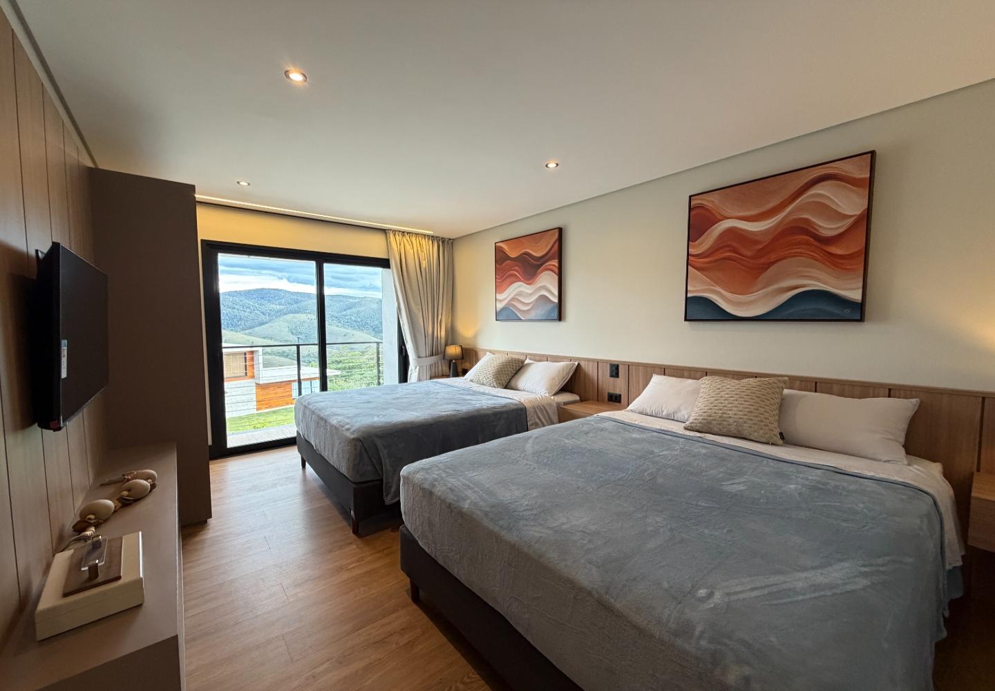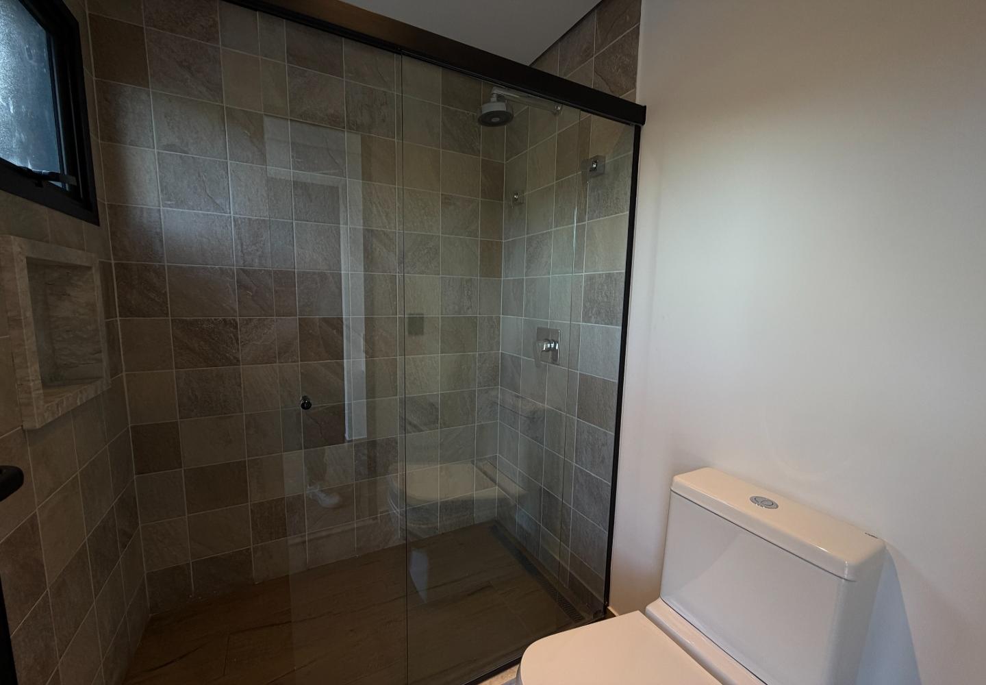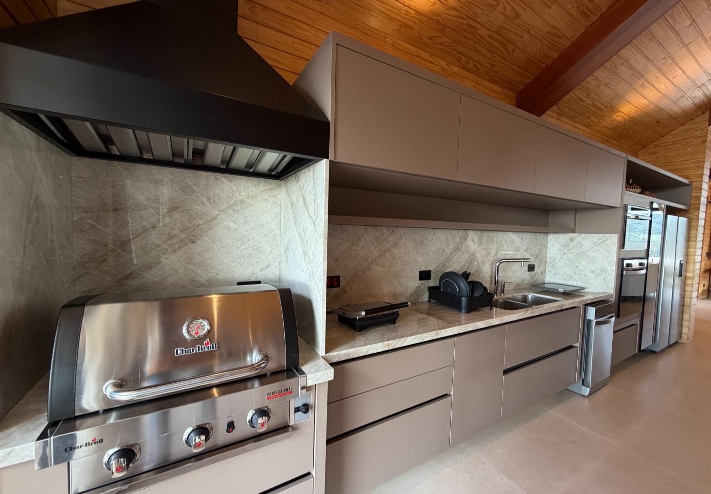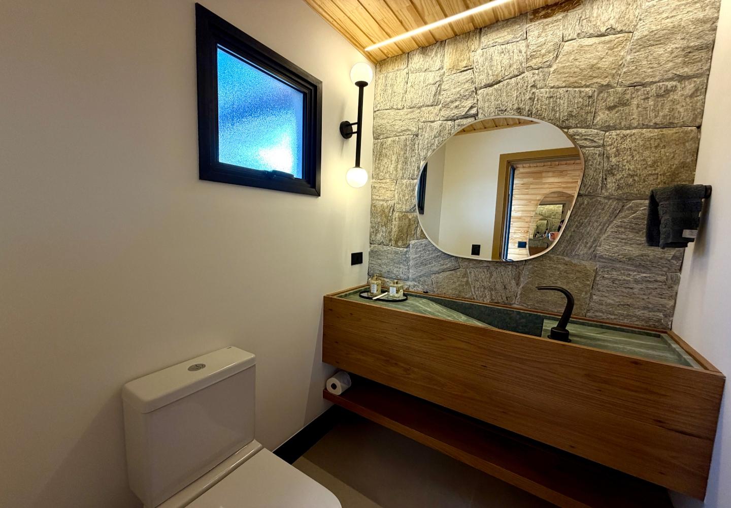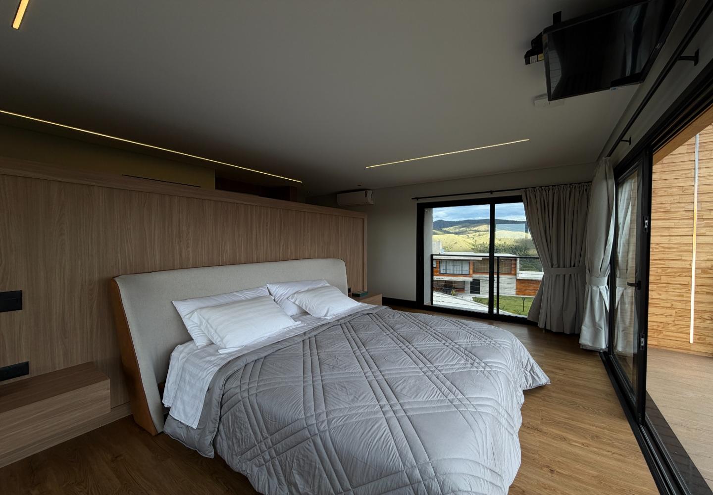A área social é marcada por pé-direito elevado, grandes panos de vidro e lareira em pedra, criando uma conexão direta entre interior e exterior. Os ambientes se abrem para o deck e para a área externa, de onde a vista se torna parte do cotidiano. A casa conta com três suítes bem distribuídas, garantindo conforto e privacidade, além de acabamentos atuais e soluções funcionais no dia a dia.