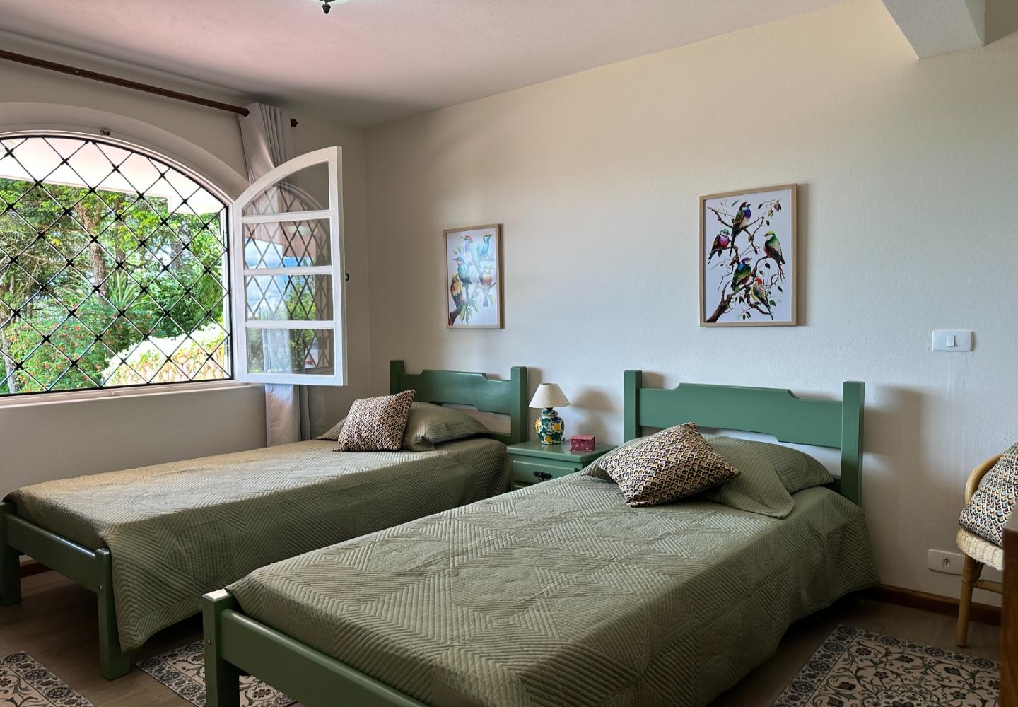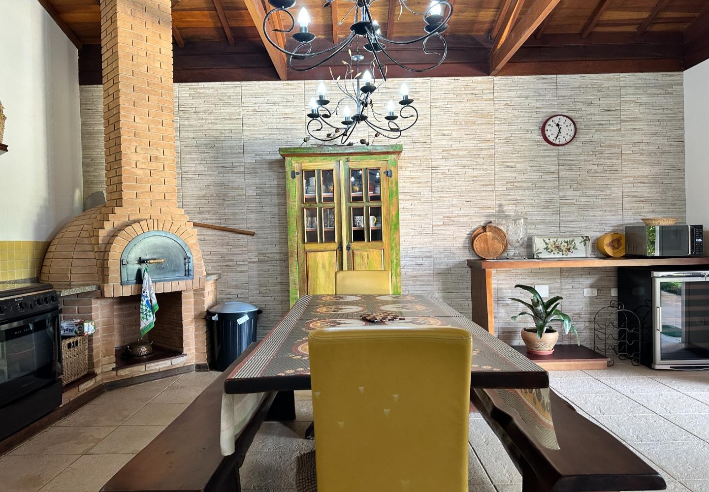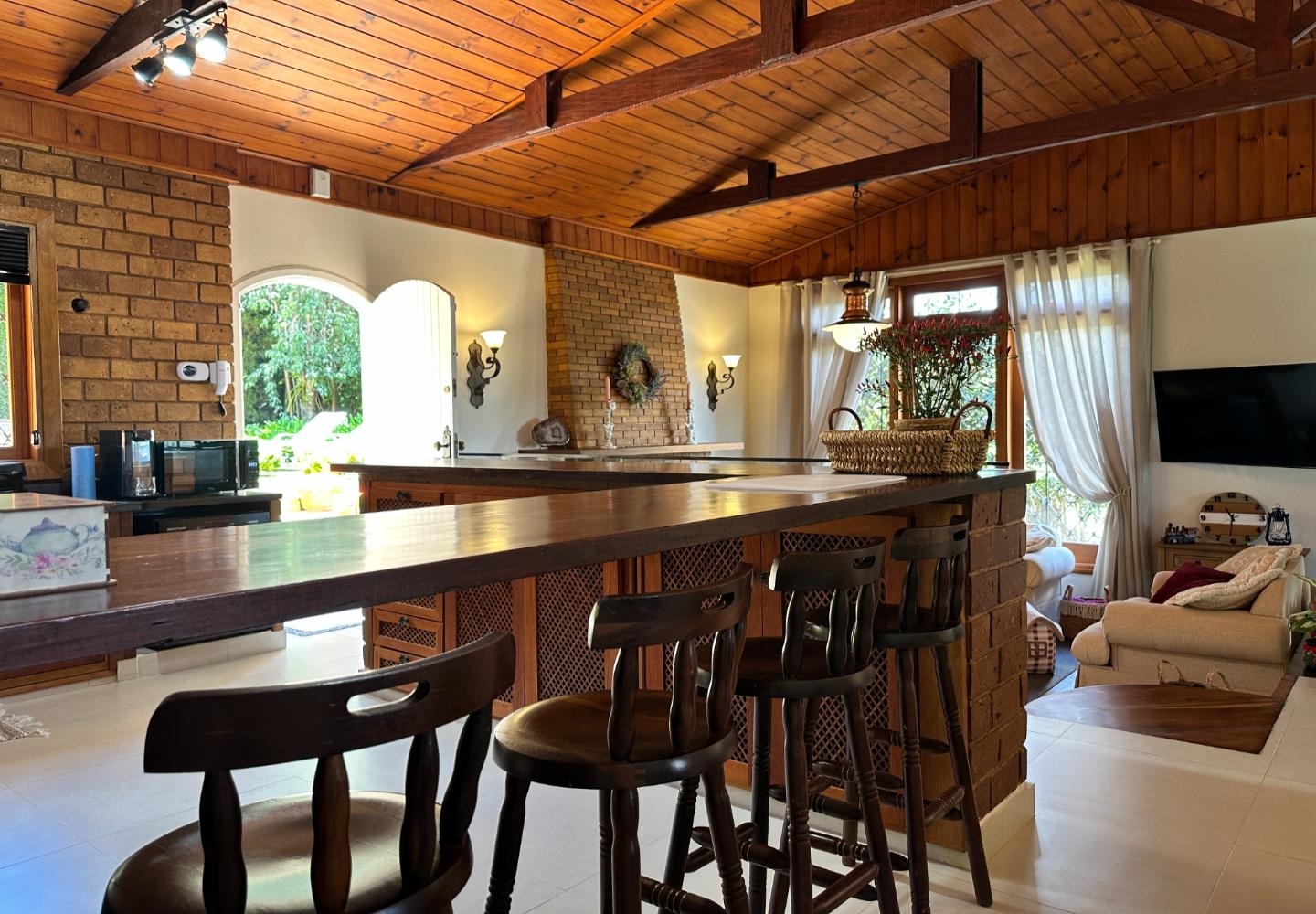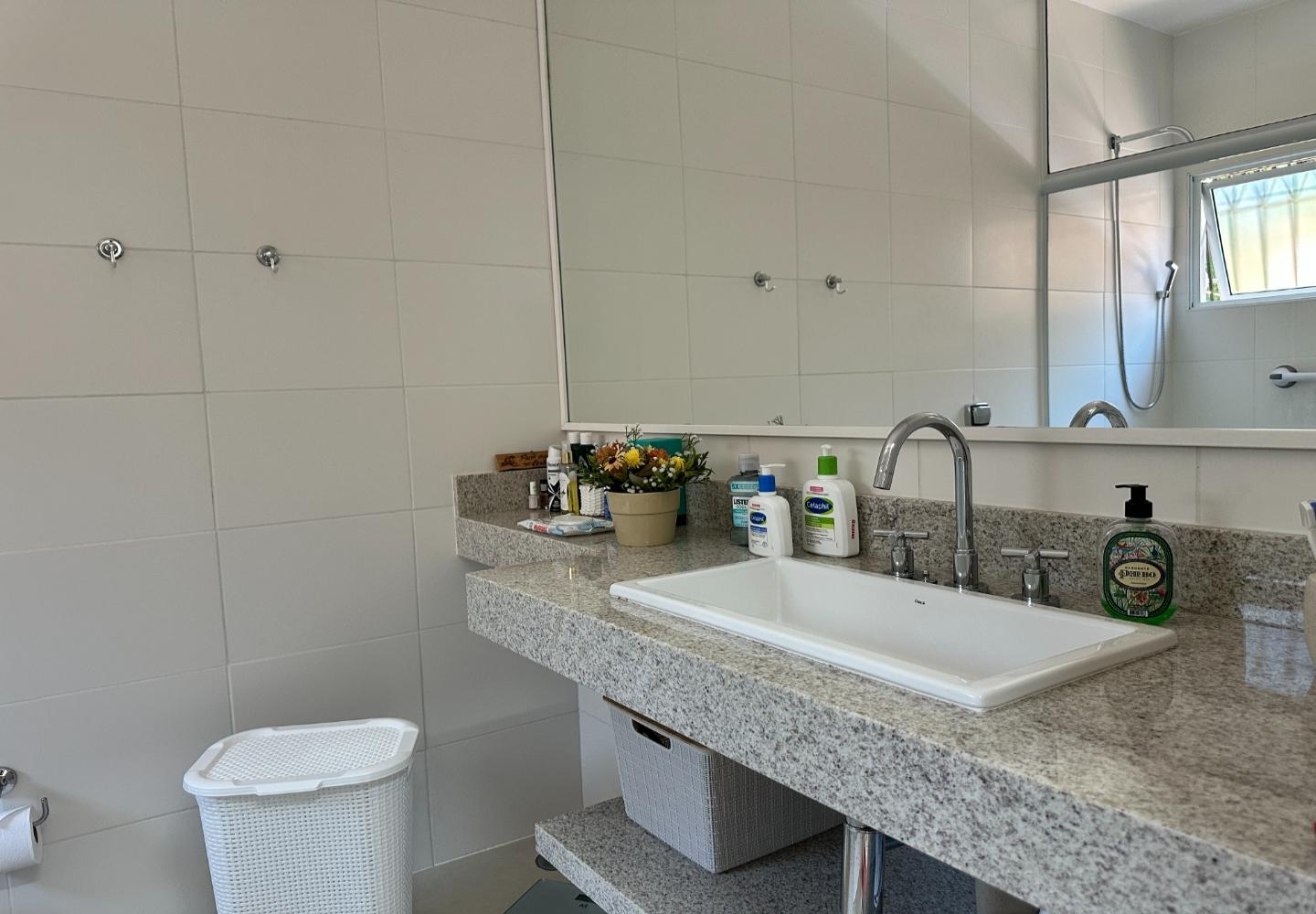 Ainda no piso principal ficam os outros três dormitórios, totalizando quatro no imóvel: dois atendidos por banheiro social e uma suíte master com closet, além de lavabo. Nos fundos, a área gourmet se conecta a um trecho mais reservado do jardim, onde estão a sauna e a hidromassagem. A casa de caseiros adiciona praticidade para apoio e manutenção, e o terreno oferece margem para atualizações pontuais que elevam ainda mais o padrão do conjunto.