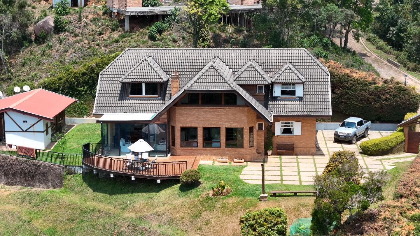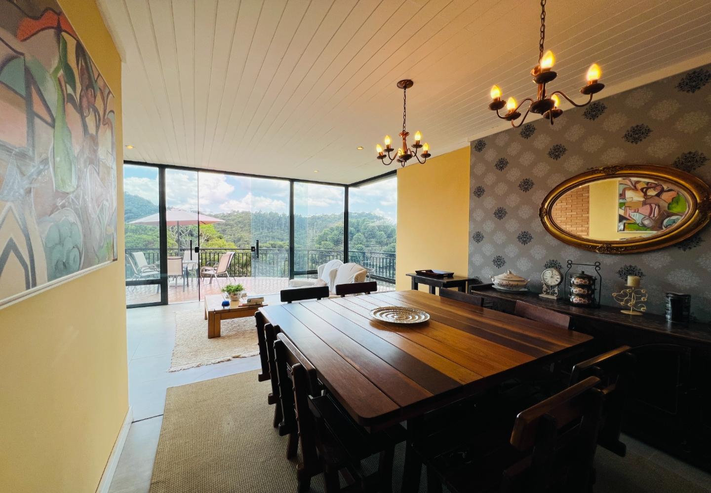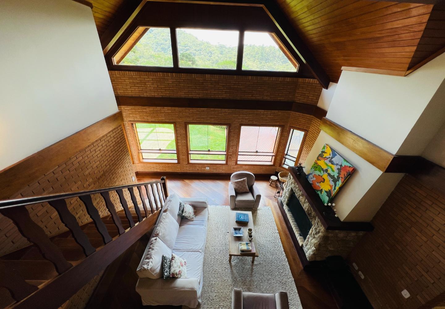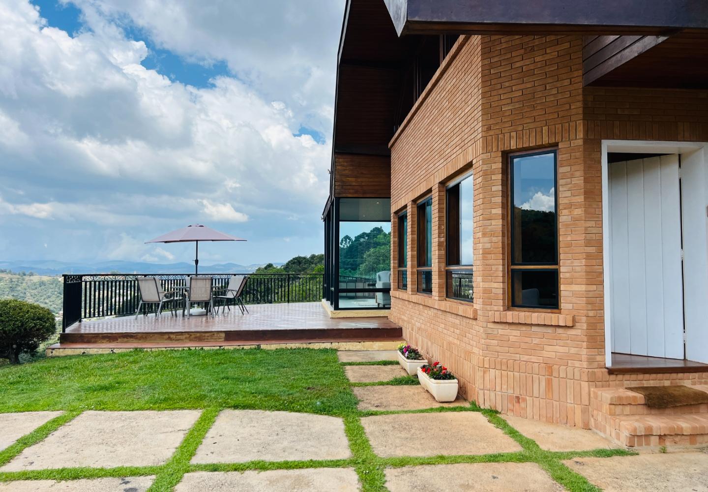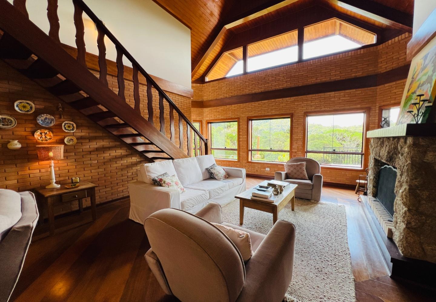 No piso superior, o mezanino dá acesso a duas suítes, uma sala íntima e um ateliê generoso, com excelente iluminação natural e ventilação. A área externa, implantada em terreno de 1.150 m², apresenta jardim gramado, bom aproveitamento do relevo e vista definitiva para as montanhas. Com 350 m² de área construída, esta casa se destaca pela qualidade estrutural, conforto térmico e localização privilegiada dentro do condomínio.