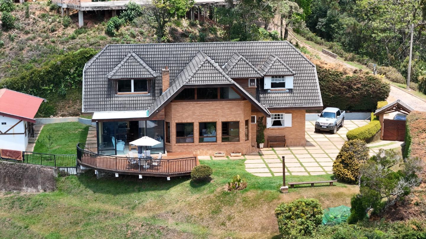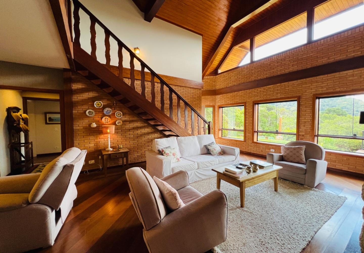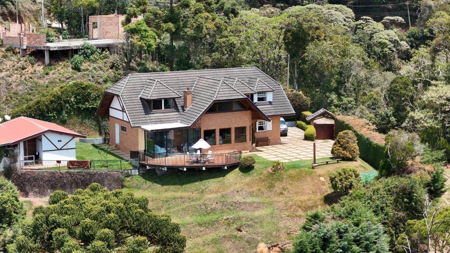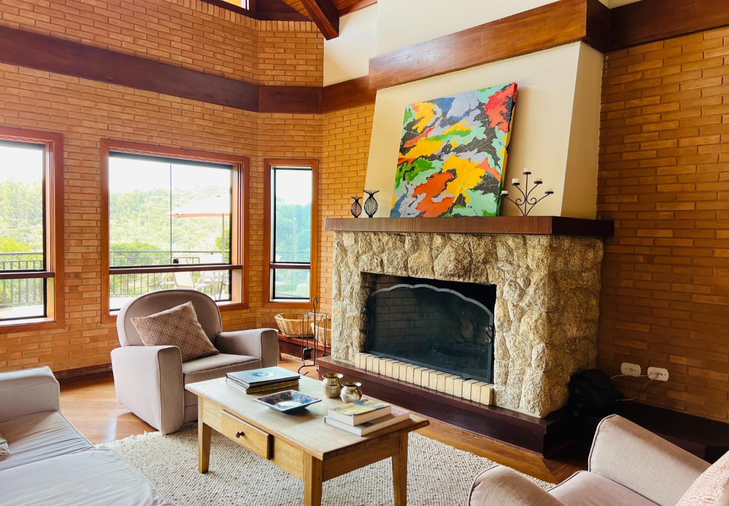 No piso superior, o mezanino dá acesso a duas suítes, uma sala íntima e um ateliê generoso, com excelente iluminação natural e ventilação. A área externa, implantada em terreno de 1.150 m², apresenta jardim gramado, bom aproveitamento do relevo e vista definitiva para as montanhas. Com 350 m² de área construída, esta casa se destaca pela qualidade estrutural, conforto térmico e localização privilegiada dentro do condomínio.