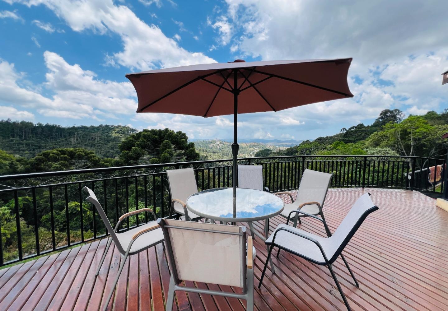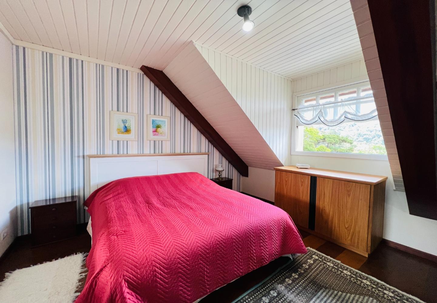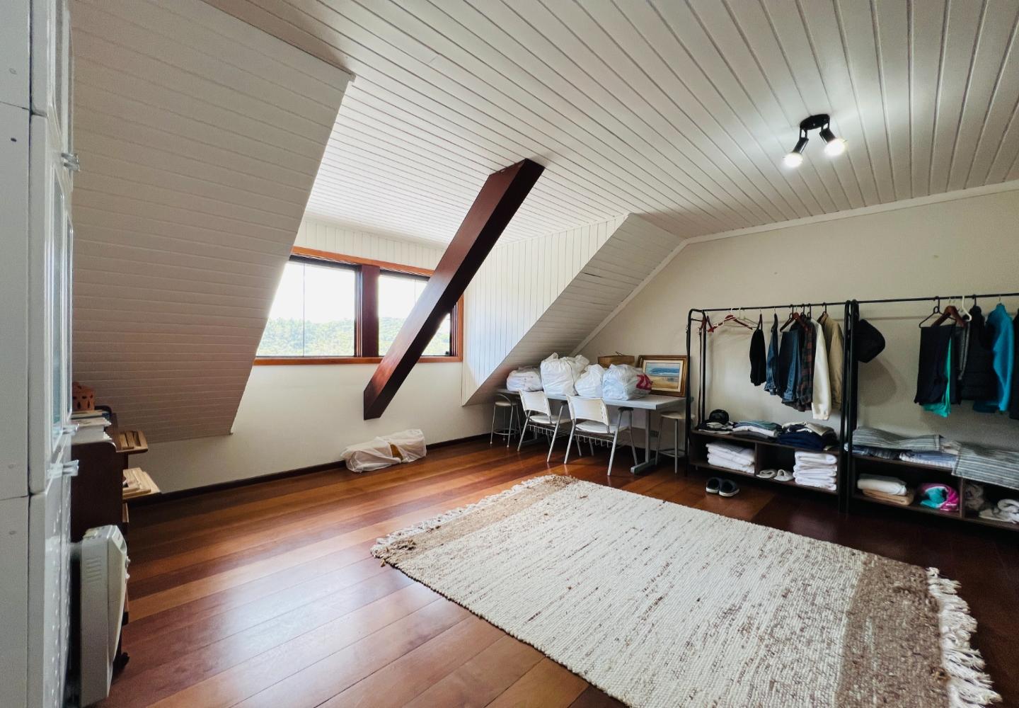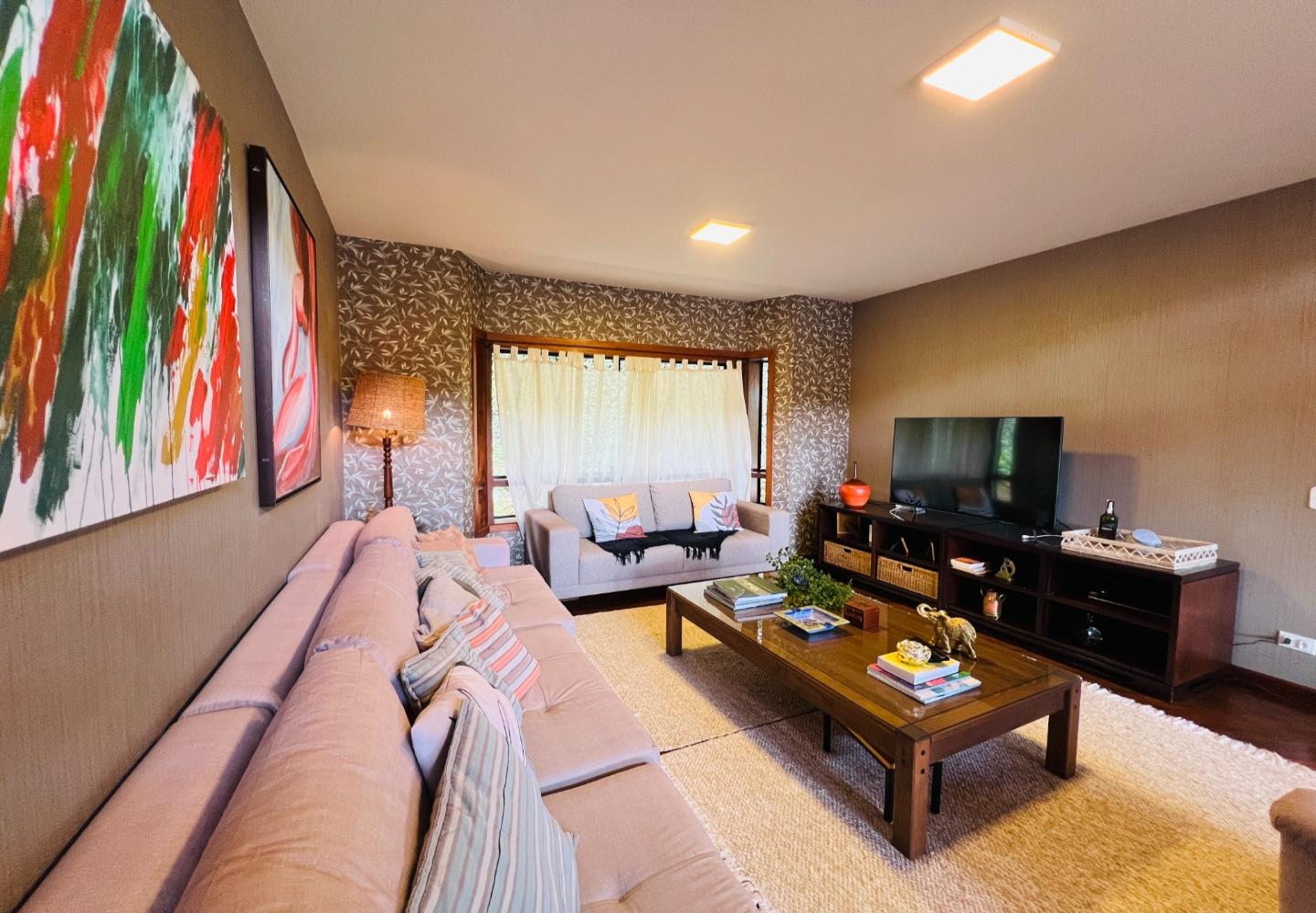 No piso superior, o mezanino dá acesso a duas suítes, uma sala íntima e um ateliê generoso, com excelente iluminação natural e ventilação. A área externa, implantada em terreno de 1.150 m², apresenta jardim gramado, bom aproveitamento do relevo e vista definitiva para as montanhas. Com 350 m² de área construída, esta casa se destaca pela qualidade estrutural, conforto térmico e localização privilegiada dentro do condomínio.
