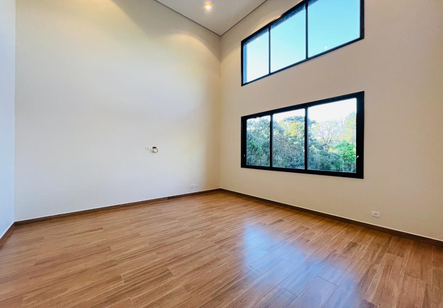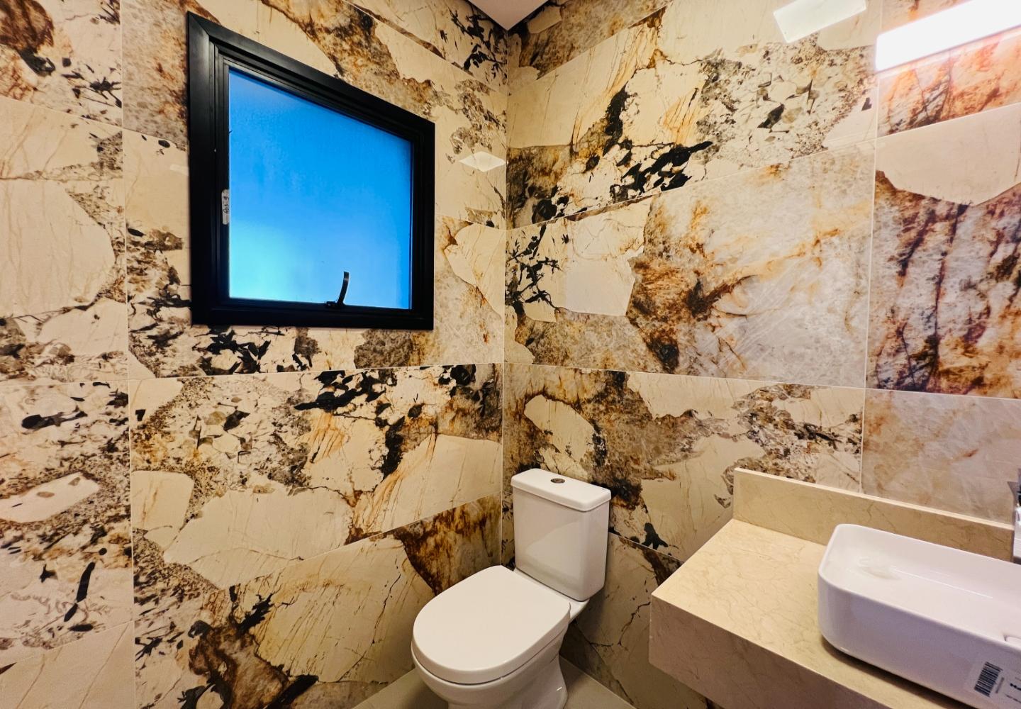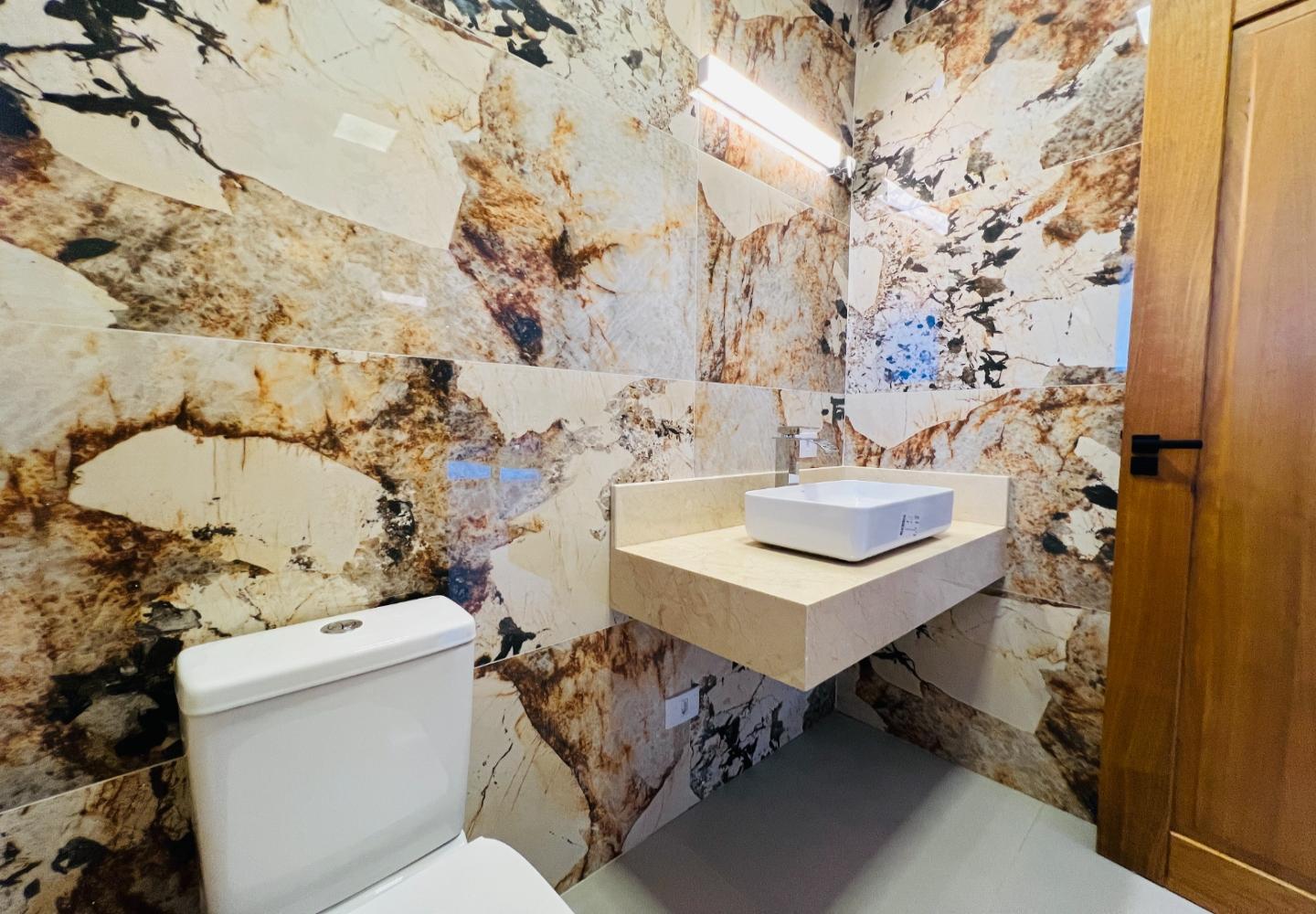O projeto valoriza iluminação natural e integração com a natureza, trazendo conforto e praticidade. São 5 dormitórios, sendo 3 suítes, além de amplas salas com piso em madeira, cozinha funcional com bancada em L e saídas diretas para o jardim.