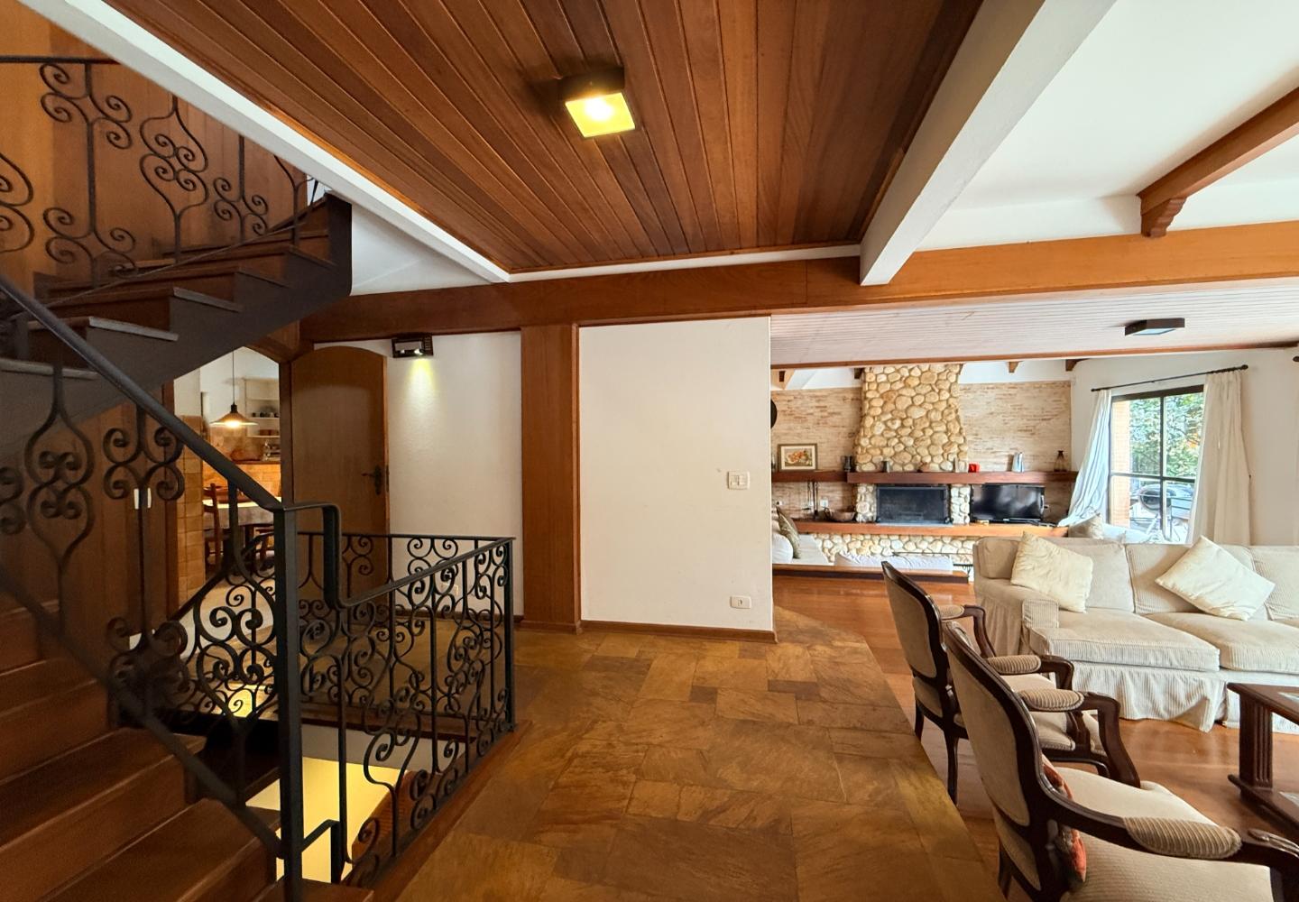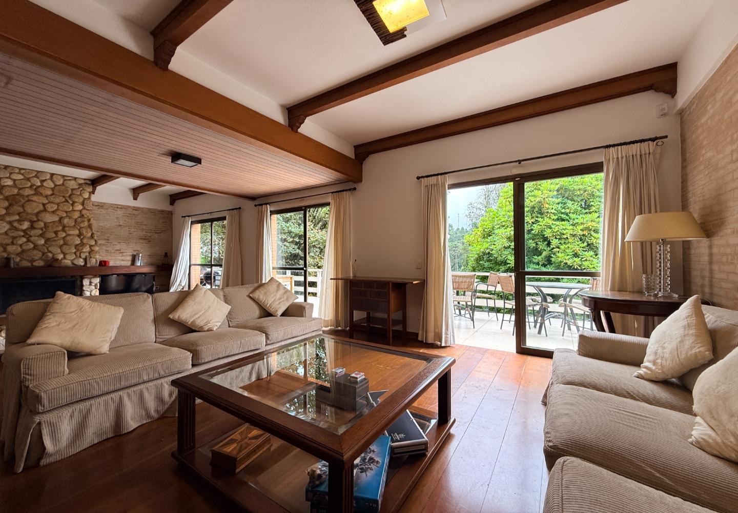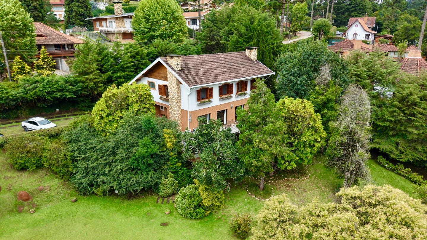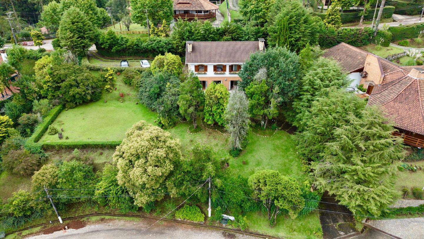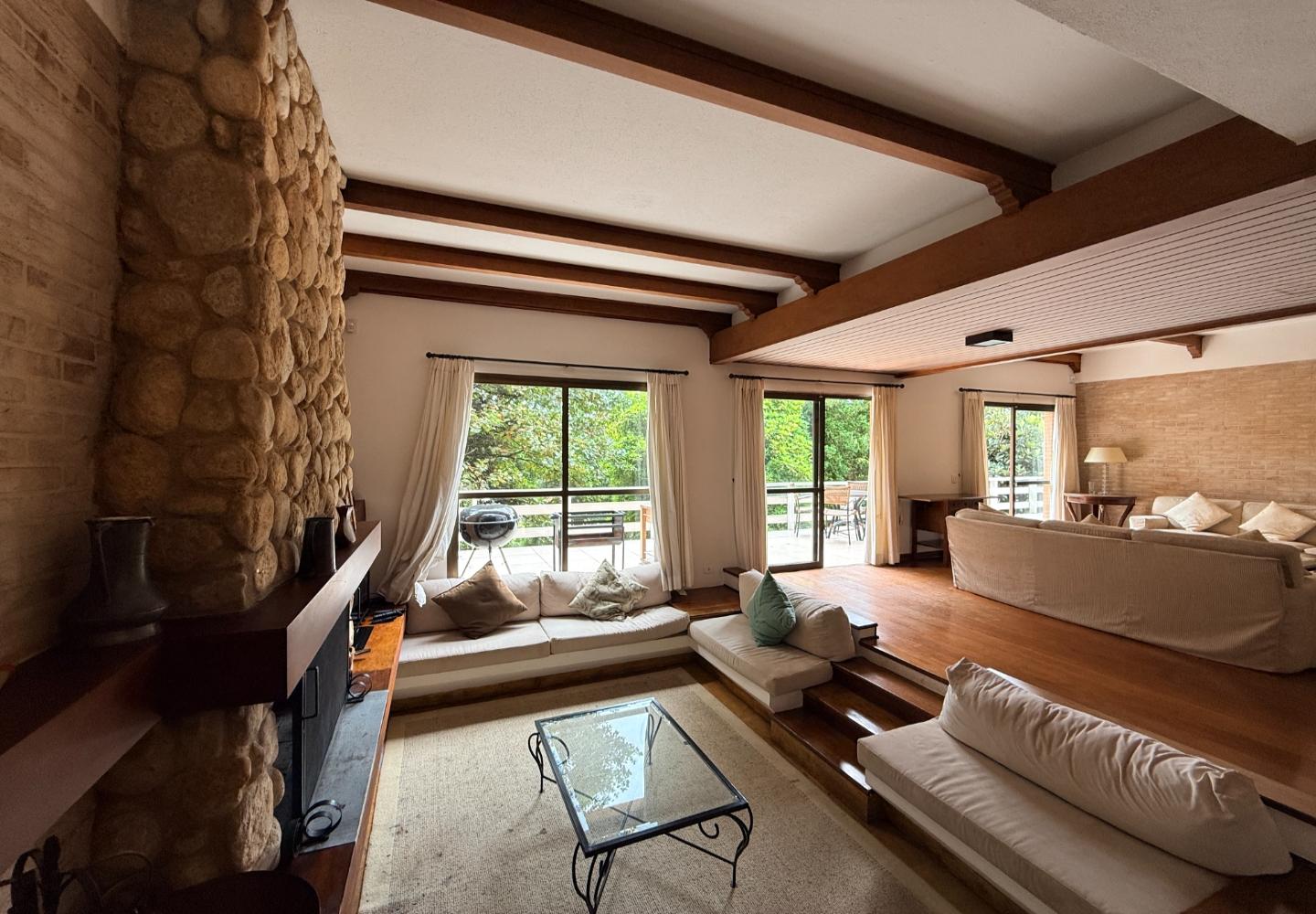 Localizada no Residencial Jardim Véu da Noiva, esta casa tem uma implantação muito bem resolvida, com 2.065 m² de terreno e 355 m² de área construída, valorizando o jardim amplo, a privacidade e a integração dos ambientes com o verde ao redor. Logo na entrada, o imóvel se organiza com um living de apoio para sala de TV e lavabo. Em seguida, a sala principal concentra a área social da casa, com sala de estar, sala de jantar, lareira em um nível rebaixado que deixa o ambiente mais agradável e acesso a um deck amplo voltado para o jardim. Ao lado da sala de jantar estão a cozinha, a despensa, a área de serviço e a dependência de funcionários com dormitório e banheiro. No pavimento superior fica a área íntima, com duas suítes, mais dois dormitórios atendidos por banheiro social, além de mezanino e sacada. Na parte inferior, a casa conta com mais um living com lareira, sauna seca, lavabo e duas vagas de garagem cobertas. É um imóvel com boa distribuição, ambientes espaçosos e uma relação muito forte com a área externa, em uma região tranquila e cercada por natureza.
