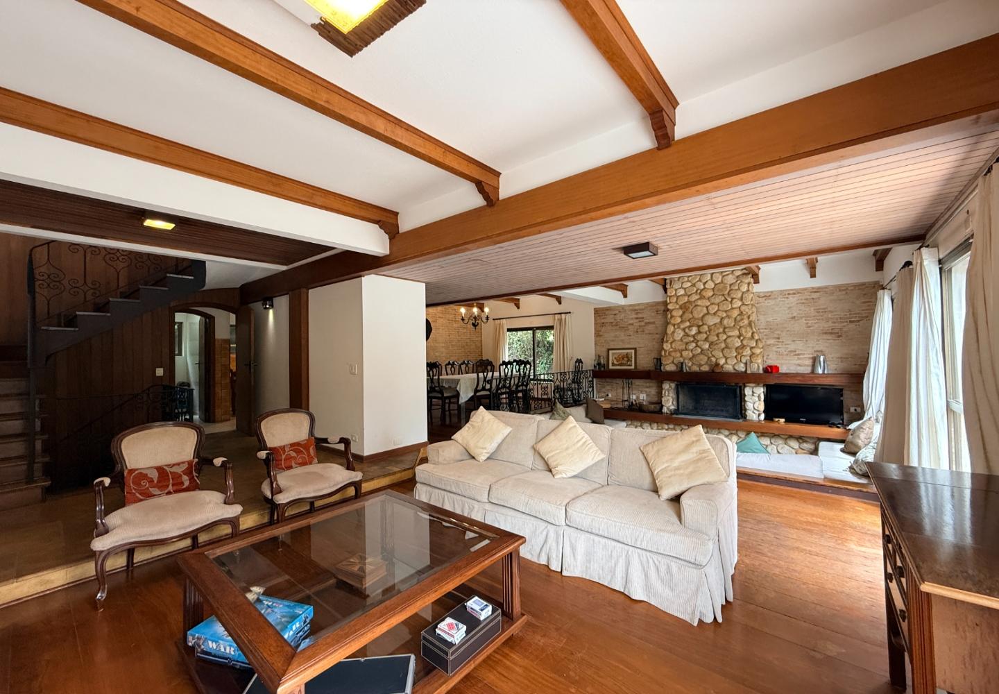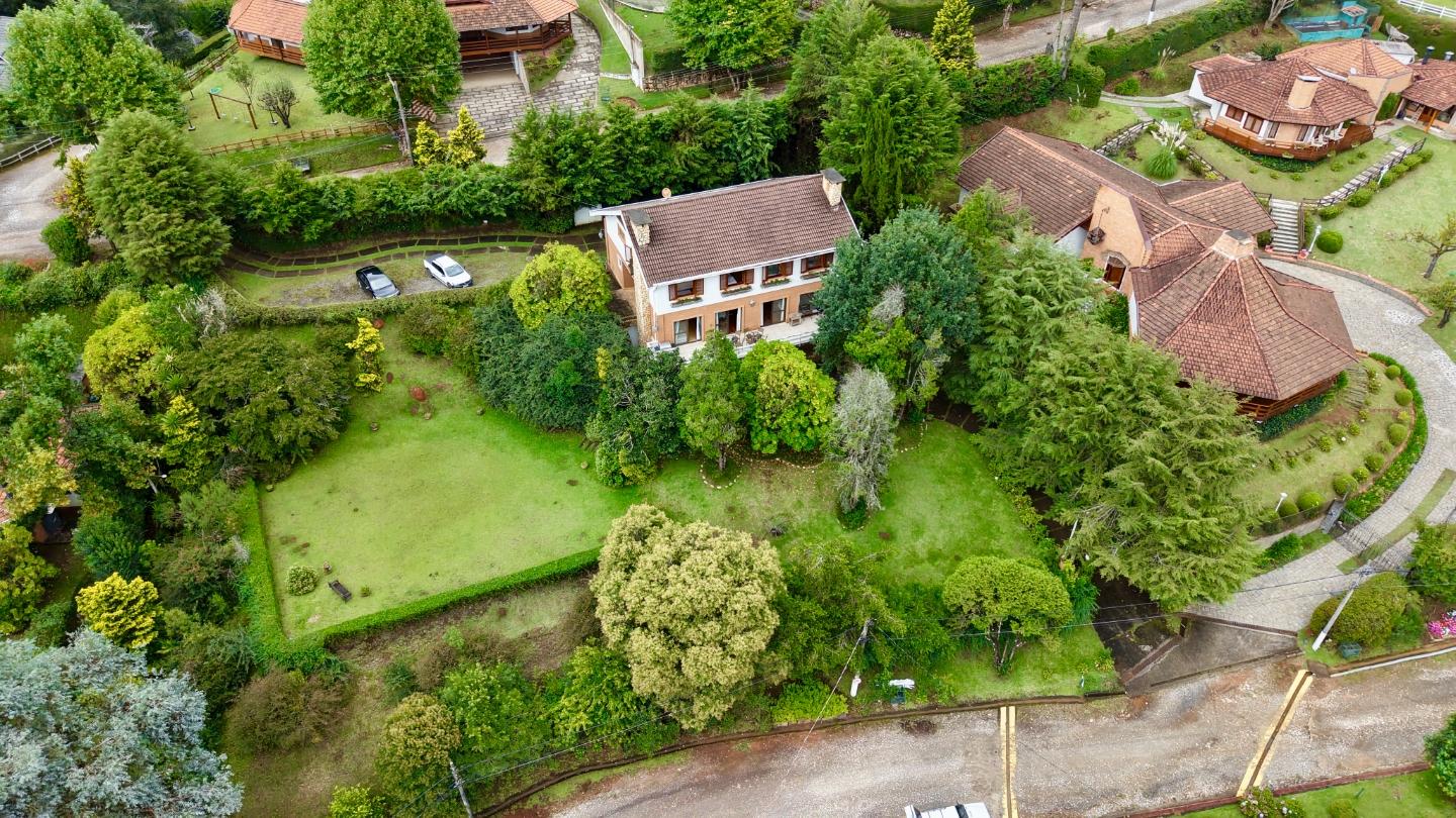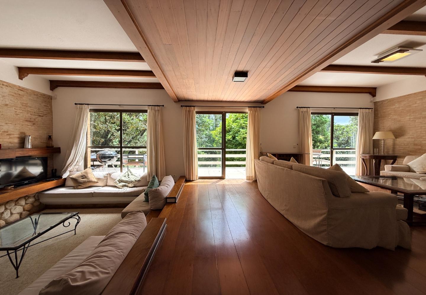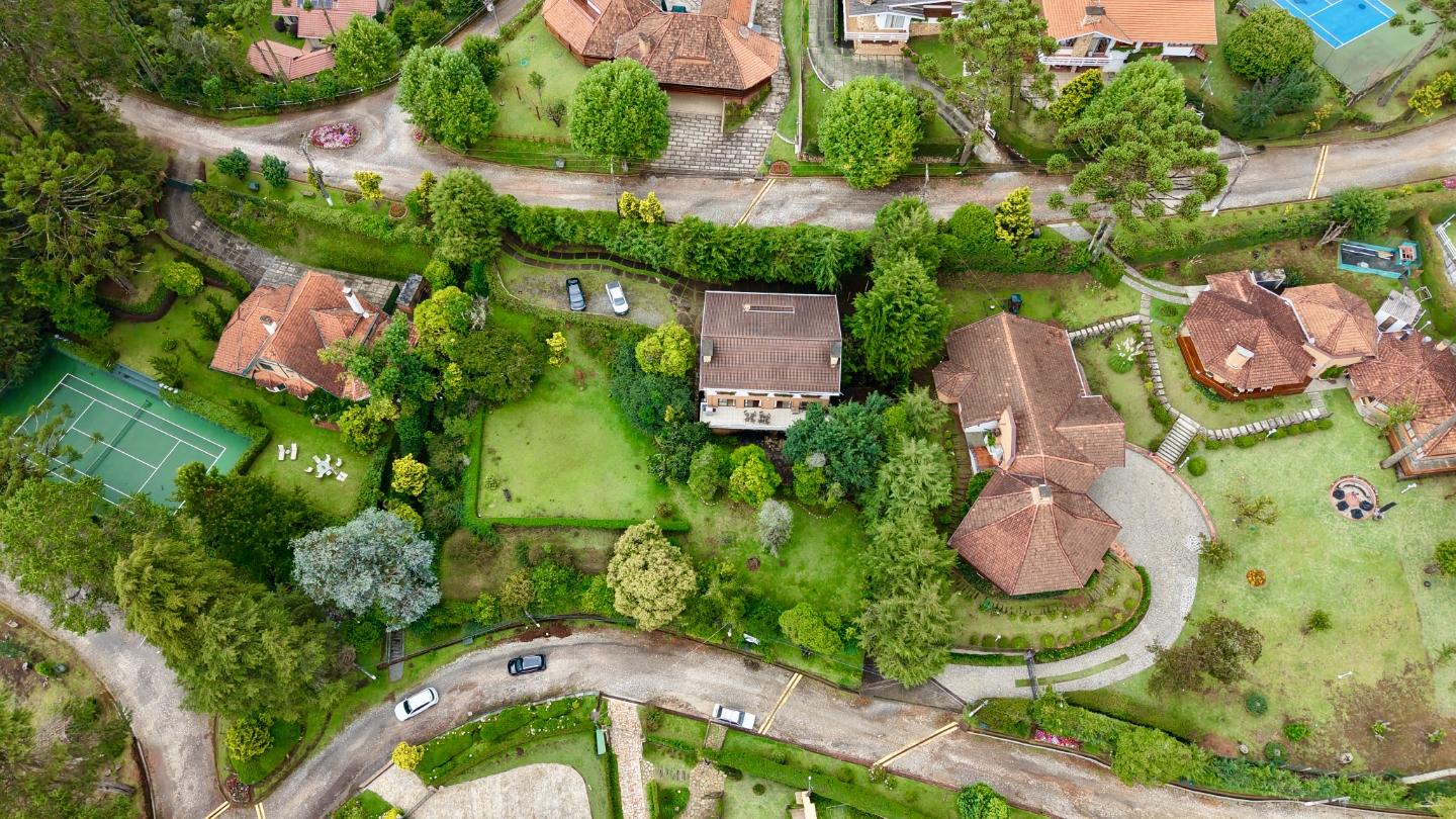 Localizada no Residencial Jardim Véu da Noiva, esta casa tem uma implantação muito bem resolvida, com 2.065 m² de terreno e 355 m² de área construída, valorizando o jardim amplo, a privacidade e a integração dos ambientes com o verde ao redor. Logo na entrada, o imóvel se organiza com um living de apoio para sala de TV e lavabo. Em seguida, a sala principal concentra a área social da casa, com sala de estar, sala de jantar, lareira em um nível rebaixado que deixa o ambiente mais agradável e acesso a um deck amplo voltado para o jardim. Ao lado da sala de jantar estão a cozinha, a despensa, a área de serviço e a dependência de funcionários com dormitório e banheiro. No pavimento superior fica a área íntima, com duas suítes, mais dois dormitórios atendidos por banheiro social, além de mezanino e sacada. Na parte inferior, a casa conta com mais um living com lareira, sauna seca, lavabo e duas vagas de garagem cobertas. É um imóvel com boa distribuição, ambientes espaçosos e uma relação muito forte com a área externa, em uma região tranquila e cercada por natureza.