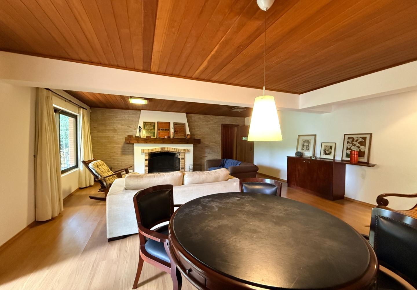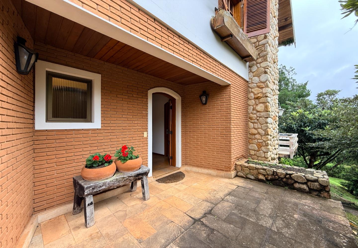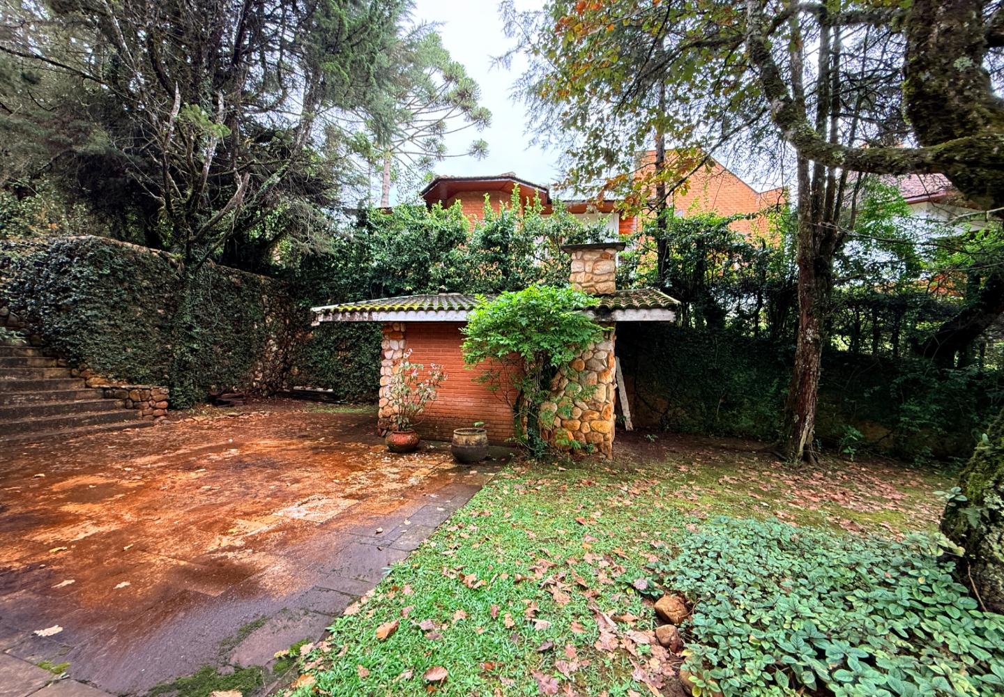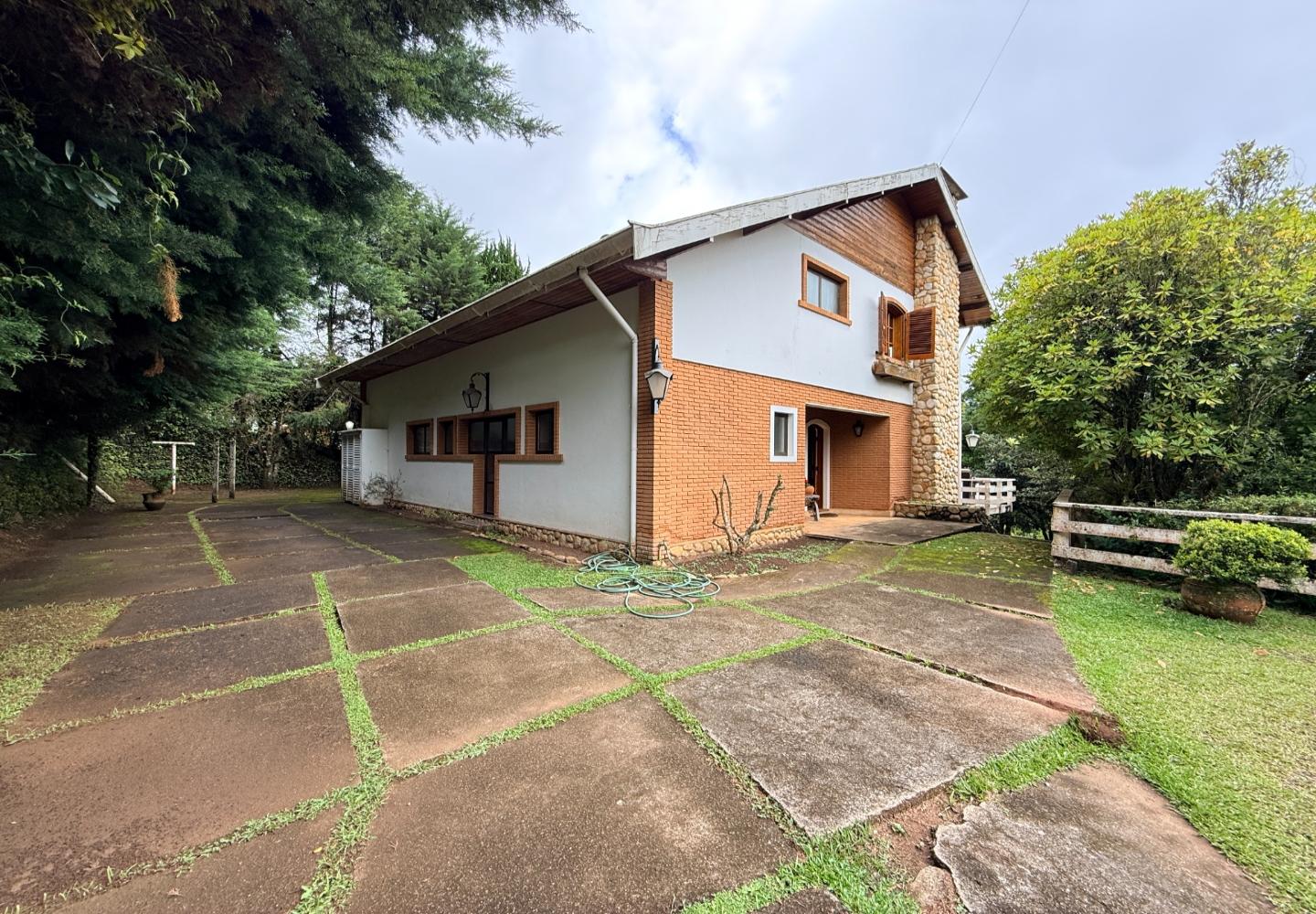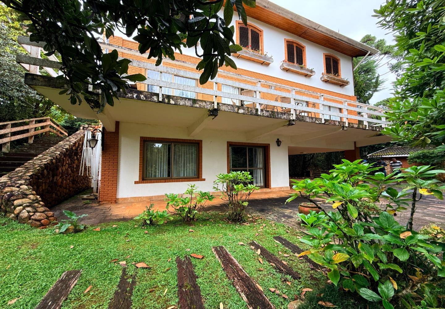 Localizada no Residencial Jardim Véu da Noiva, esta casa tem uma implantação muito bem resolvida, com 2.065 m² de terreno e 355 m² de área construída, valorizando o jardim amplo, a privacidade e a integração dos ambientes com o verde ao redor. Logo na entrada, o imóvel se organiza com um living de apoio para sala de TV e lavabo. Em seguida, a sala principal concentra a área social da casa, com sala de estar, sala de jantar, lareira em um nível rebaixado que deixa o ambiente mais agradável e acesso a um deck amplo voltado para o jardim. Ao lado da sala de jantar estão a cozinha, a despensa, a área de serviço e a dependência de funcionários com dormitório e banheiro. No pavimento superior fica a área íntima, com duas suítes, mais dois dormitórios atendidos por banheiro social, além de mezanino e sacada. Na parte inferior, a casa conta com mais um living com lareira, sauna seca, lavabo e duas vagas de garagem cobertas. É um imóvel com boa distribuição, ambientes espaçosos e uma relação muito forte com a área externa, em uma região tranquila e cercada por natureza.