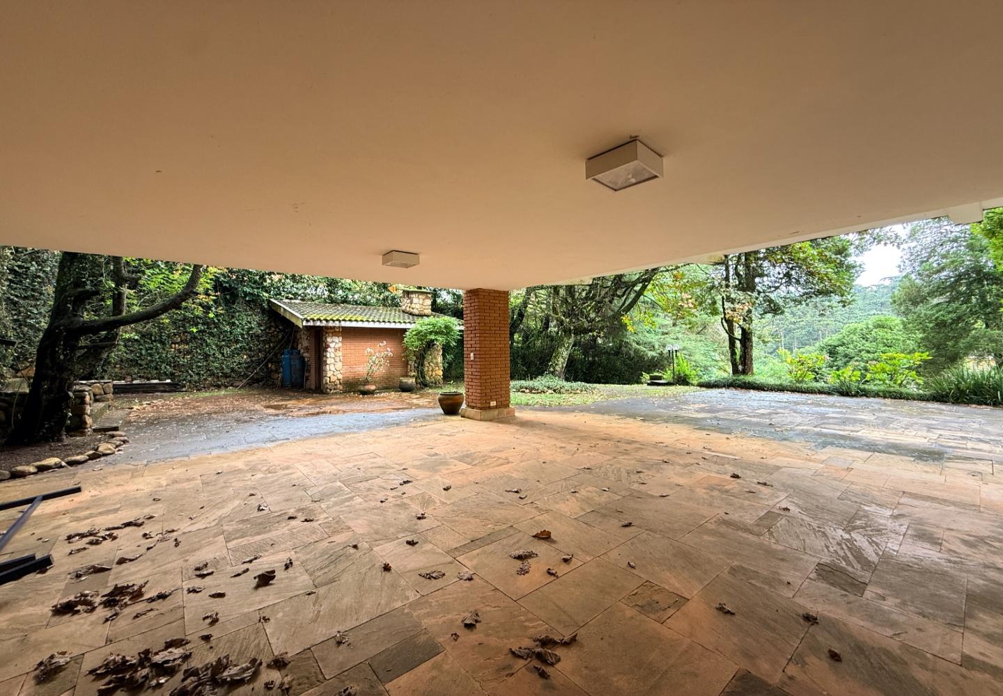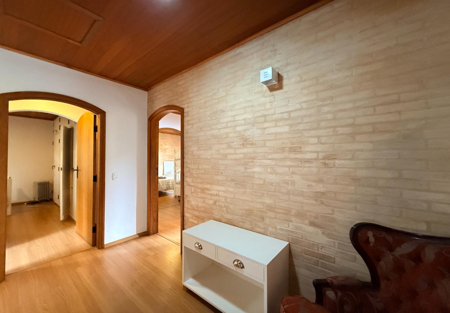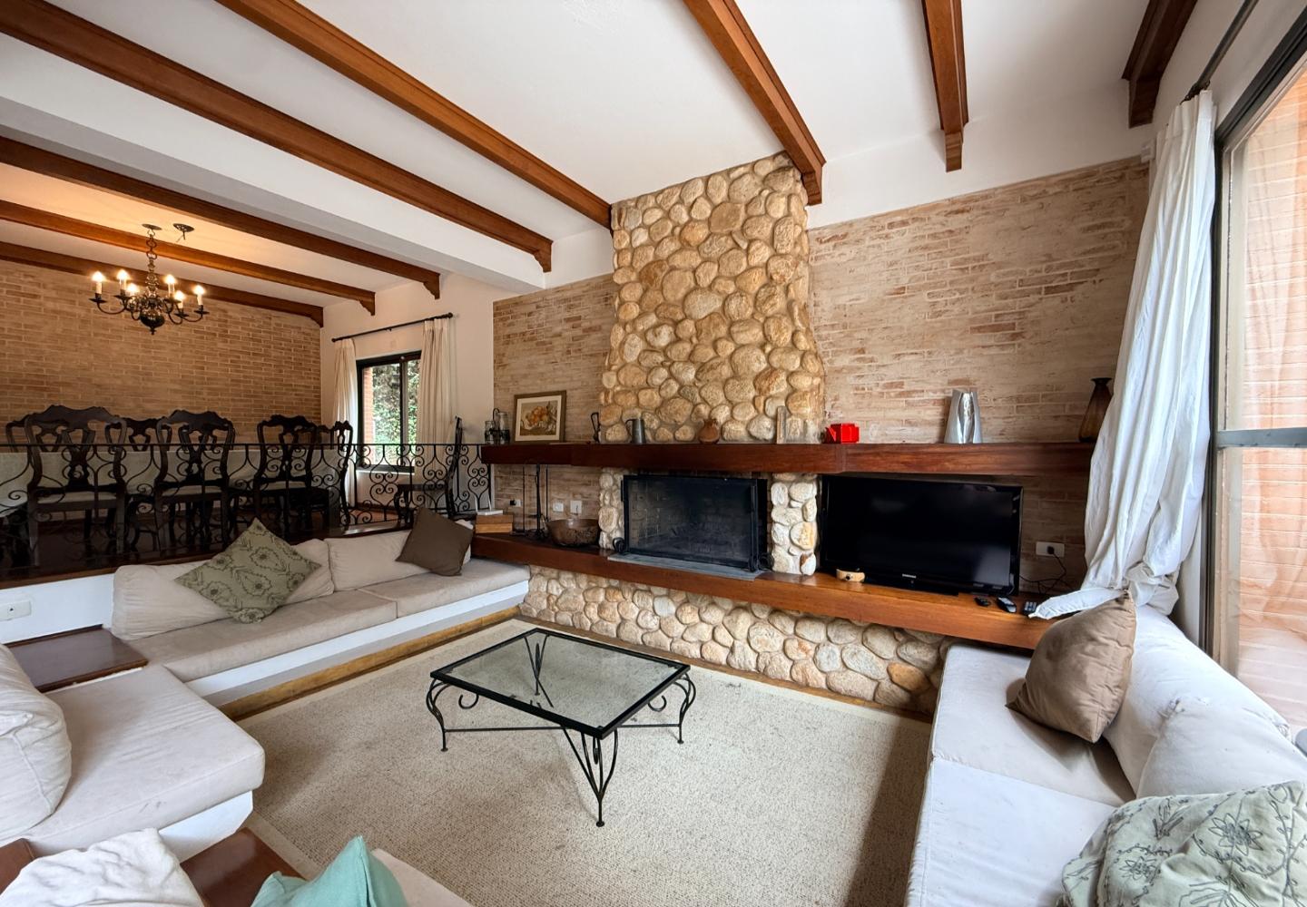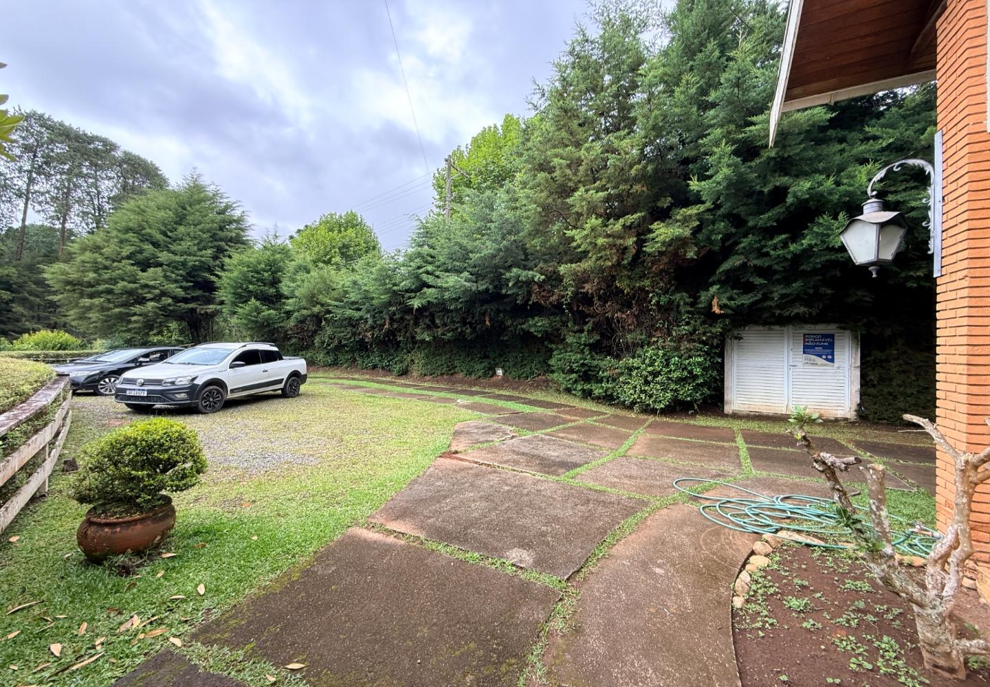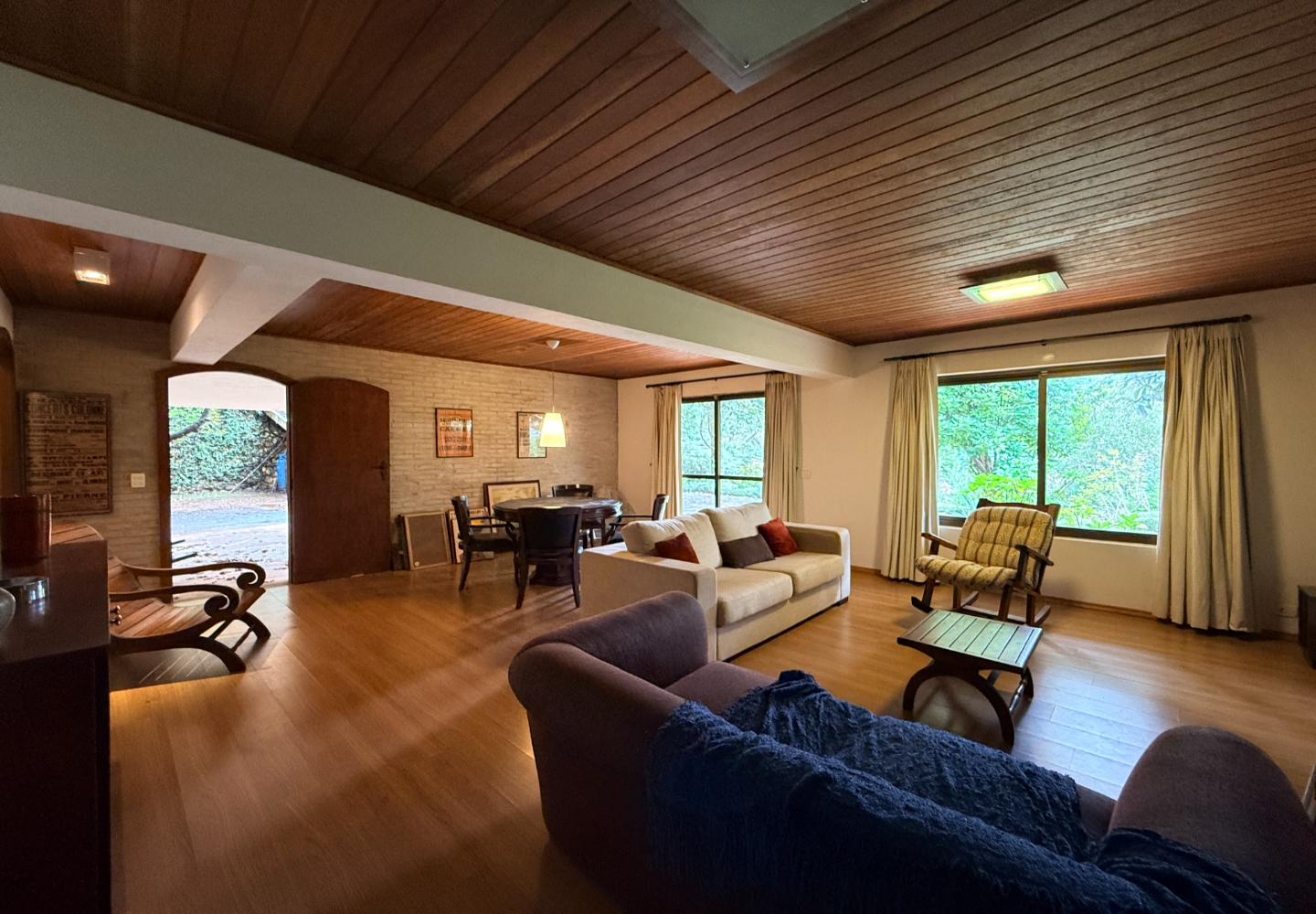 Localizada no Residencial Jardim Véu da Noiva, esta casa tem uma implantação muito bem resolvida, com 2.065 m² de terreno e 355 m² de área construída, valorizando o jardim amplo, a privacidade e a integração dos ambientes com o verde ao redor. Logo na entrada, o imóvel se organiza com um living de apoio para sala de TV e lavabo. Em seguida, a sala principal concentra a área social da casa, com sala de estar, sala de jantar, lareira em um nível rebaixado que deixa o ambiente mais agradável e acesso a um deck amplo voltado para o jardim. Ao lado da sala de jantar estão a cozinha, a despensa, a área de serviço e a dependência de funcionários com dormitório e banheiro. No pavimento superior fica a área íntima, com duas suítes, mais dois dormitórios atendidos por banheiro social, além de mezanino e sacada. Na parte inferior, a casa conta com mais um living com lareira, sauna seca, lavabo e duas vagas de garagem cobertas. É um imóvel com boa distribuição, ambientes espaçosos e uma relação muito forte com a área externa, em uma região tranquila e cercada por natureza.