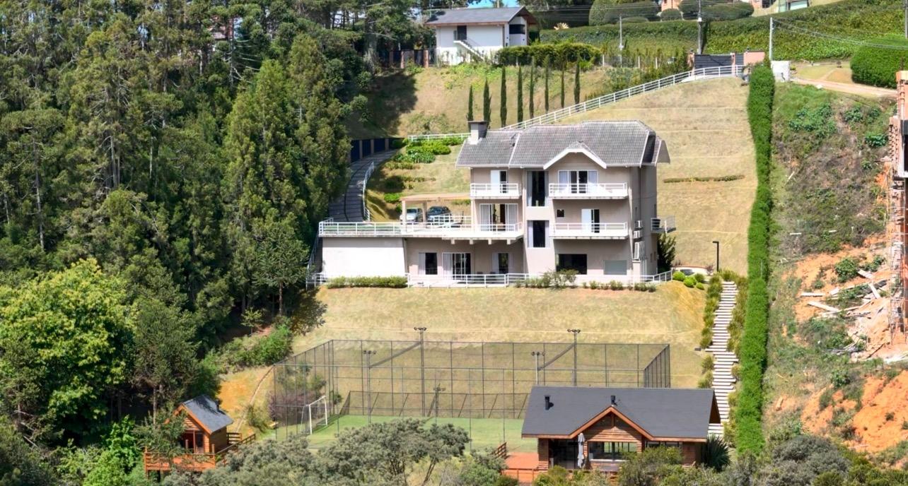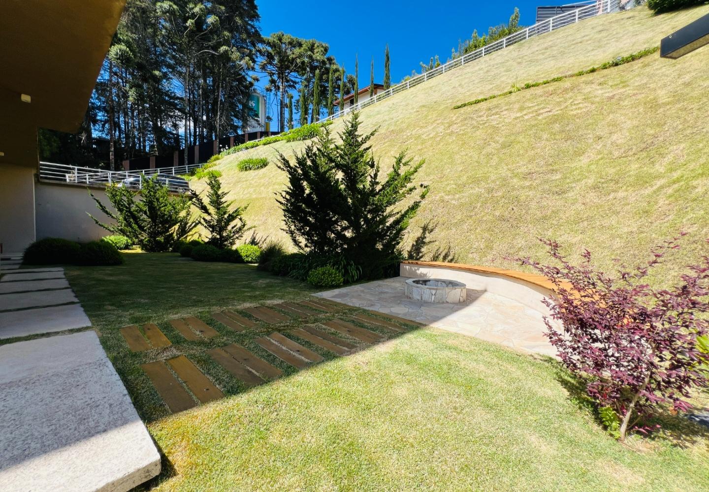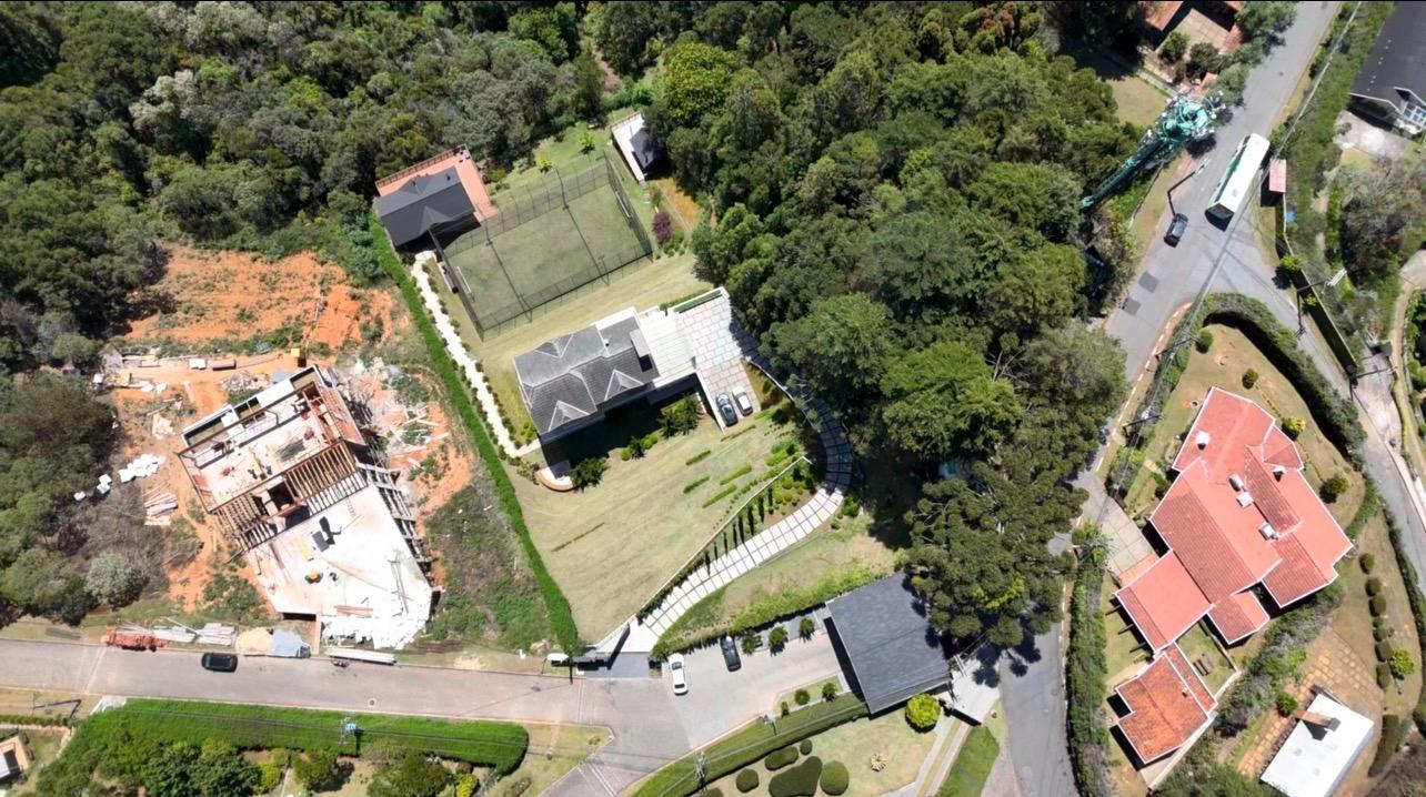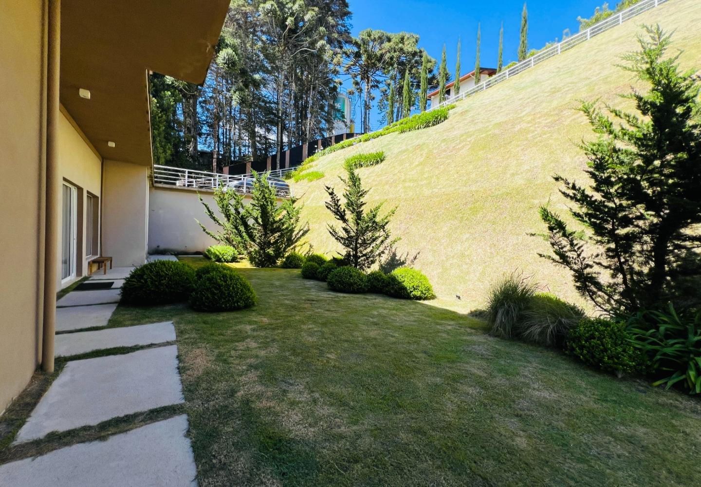 A parte externa acompanha o relevo com jardins bem cuidados, campo de futebol, cabana com redário e caminhos que ligam os espaços de lazer à casa principal. O acesso é prático e seguro, com portão automático, sistema de câmeras e garagem para cinco carros — duas vagas cobertas com ponto para carregamento de veículos elétricos.