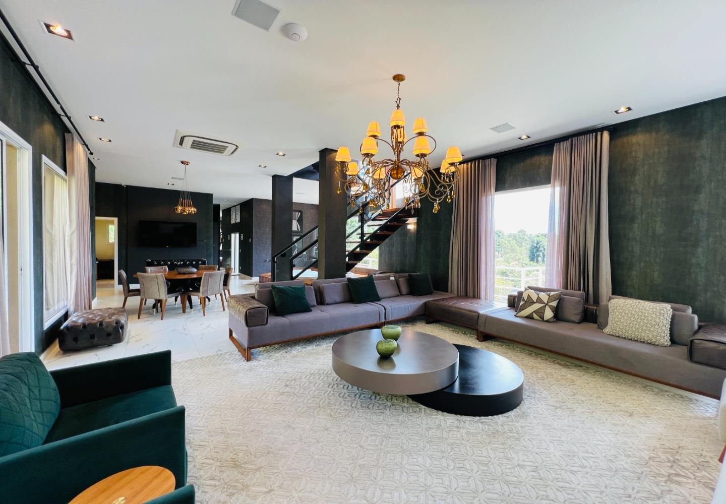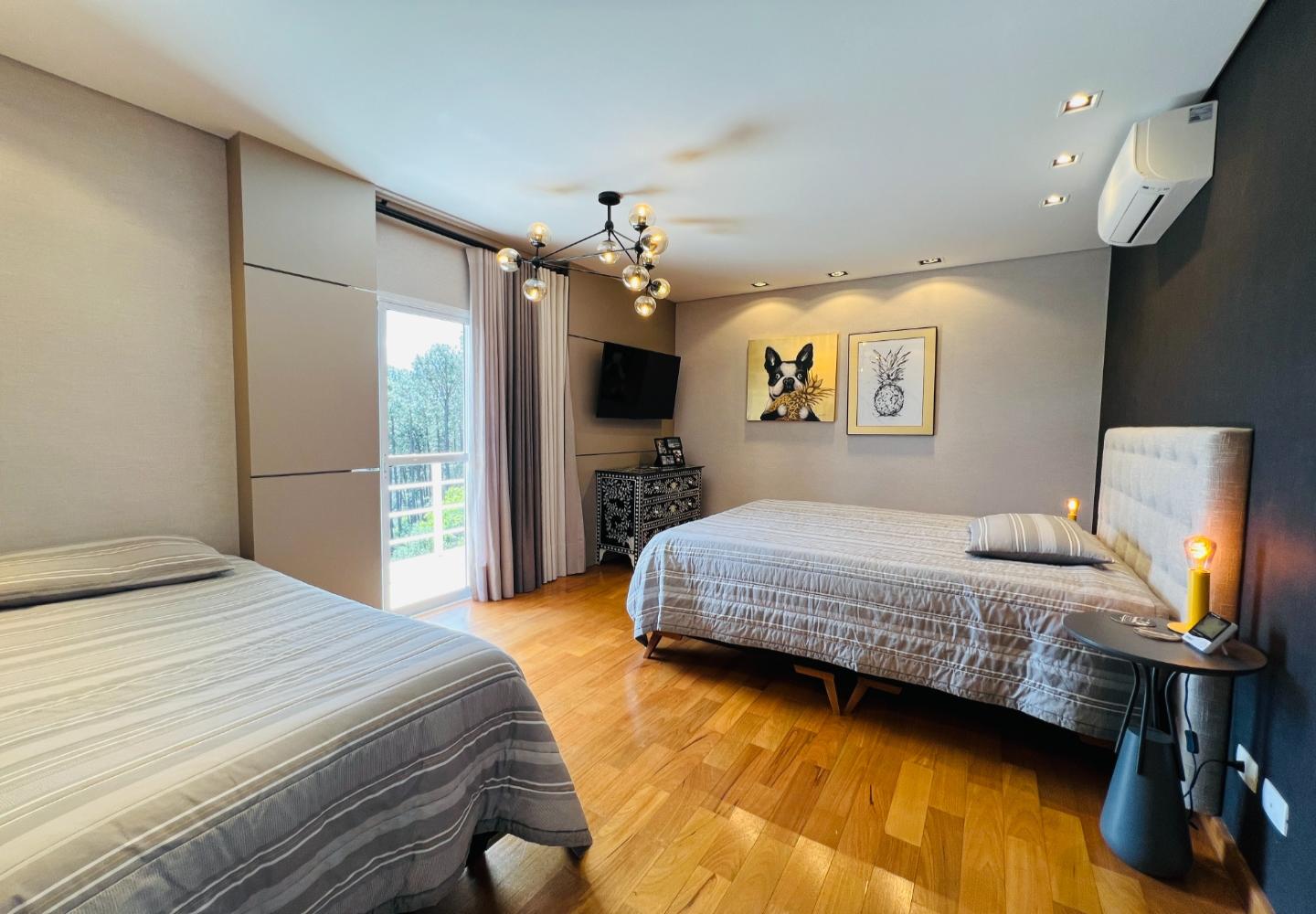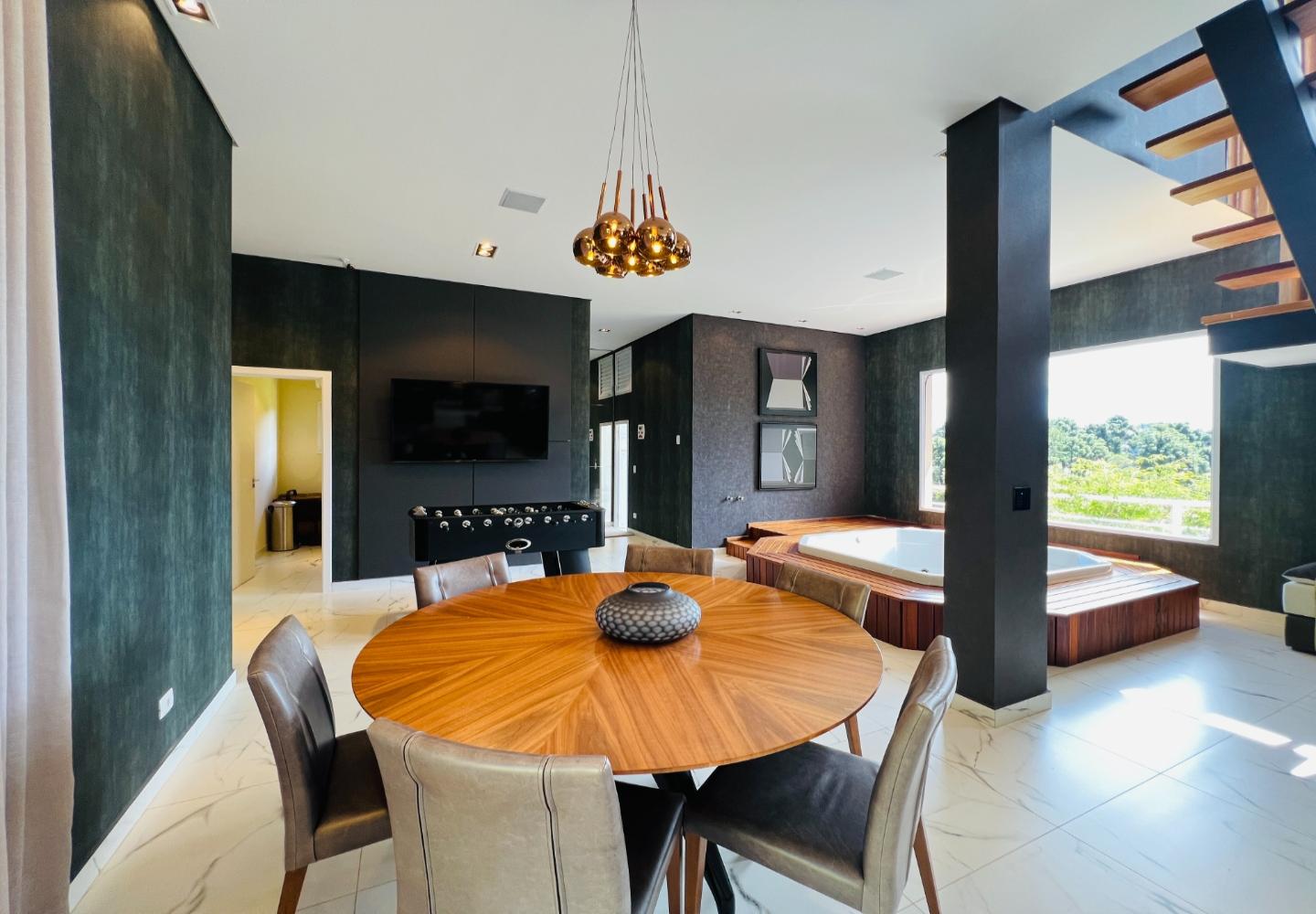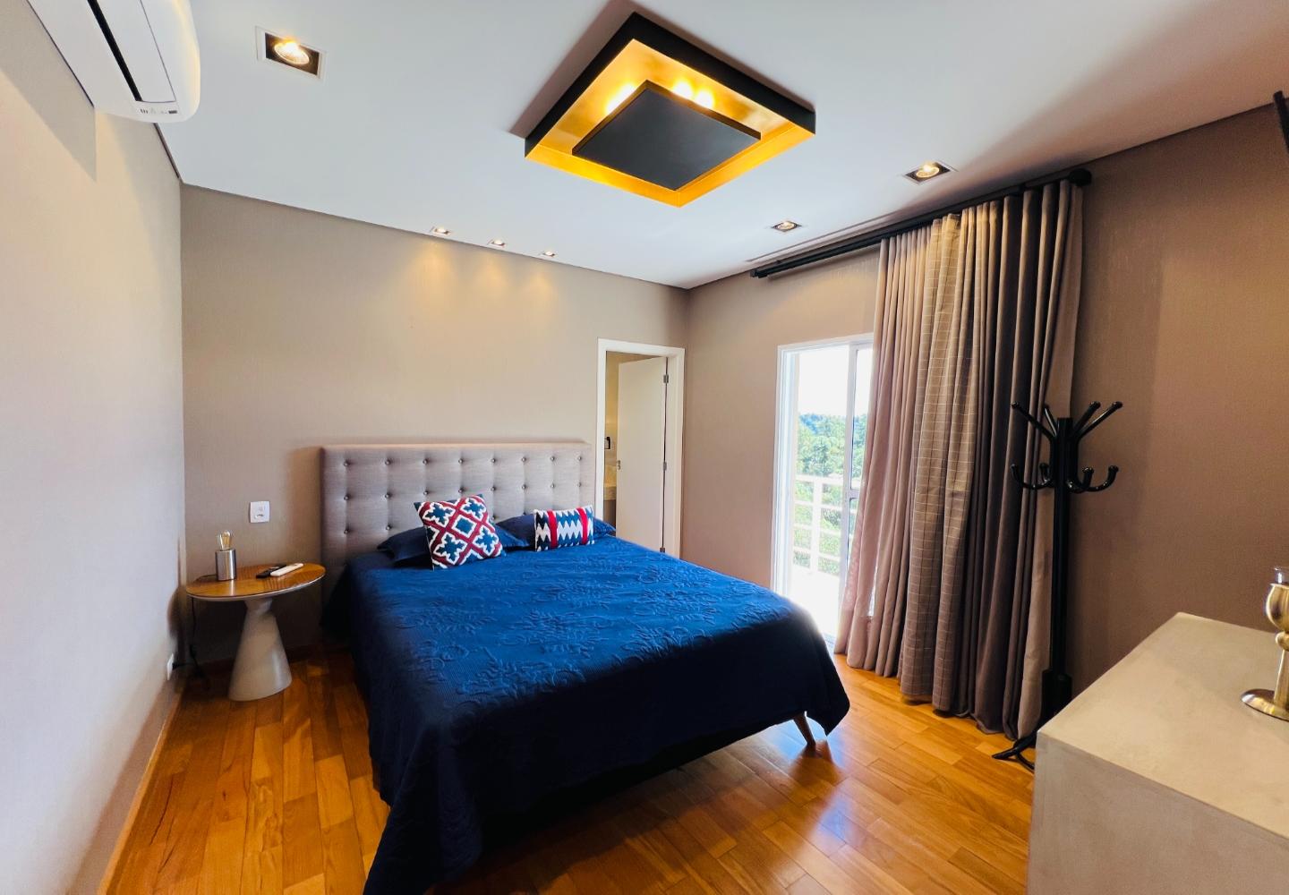 A parte externa acompanha o relevo com jardins bem cuidados, campo de futebol, cabana com redário e caminhos que ligam os espaços de lazer à casa principal. O acesso é prático e seguro, com portão automático, sistema de câmeras e garagem para cinco carros — duas vagas cobertas com ponto para carregamento de veículos elétricos.