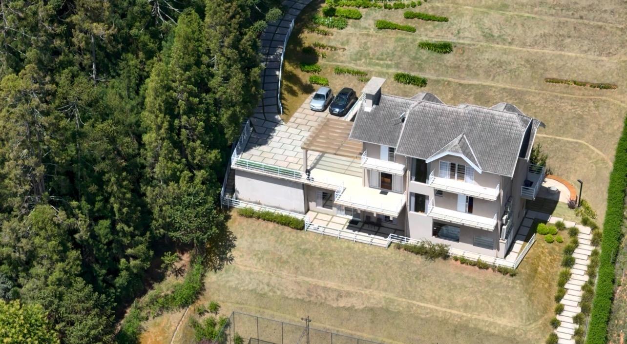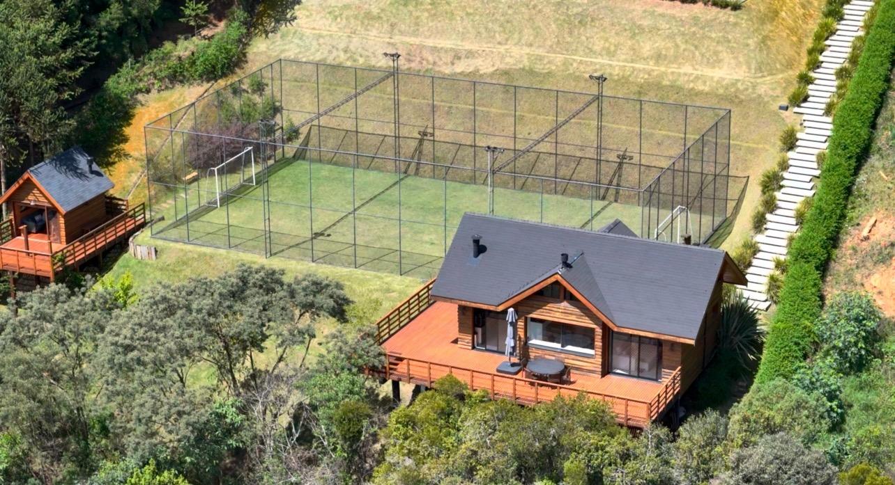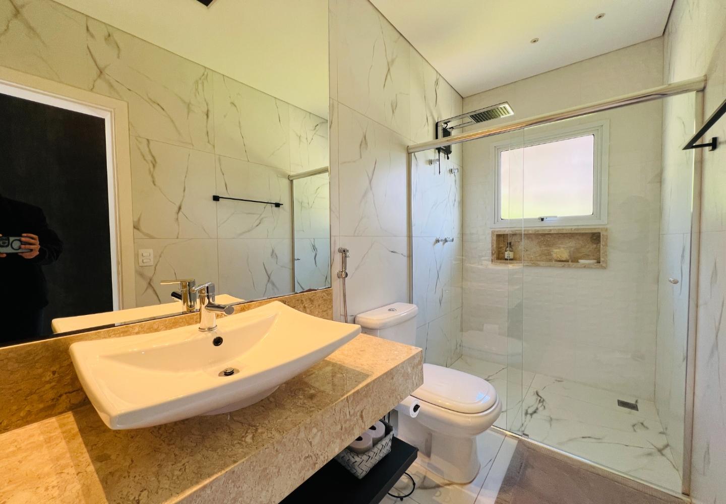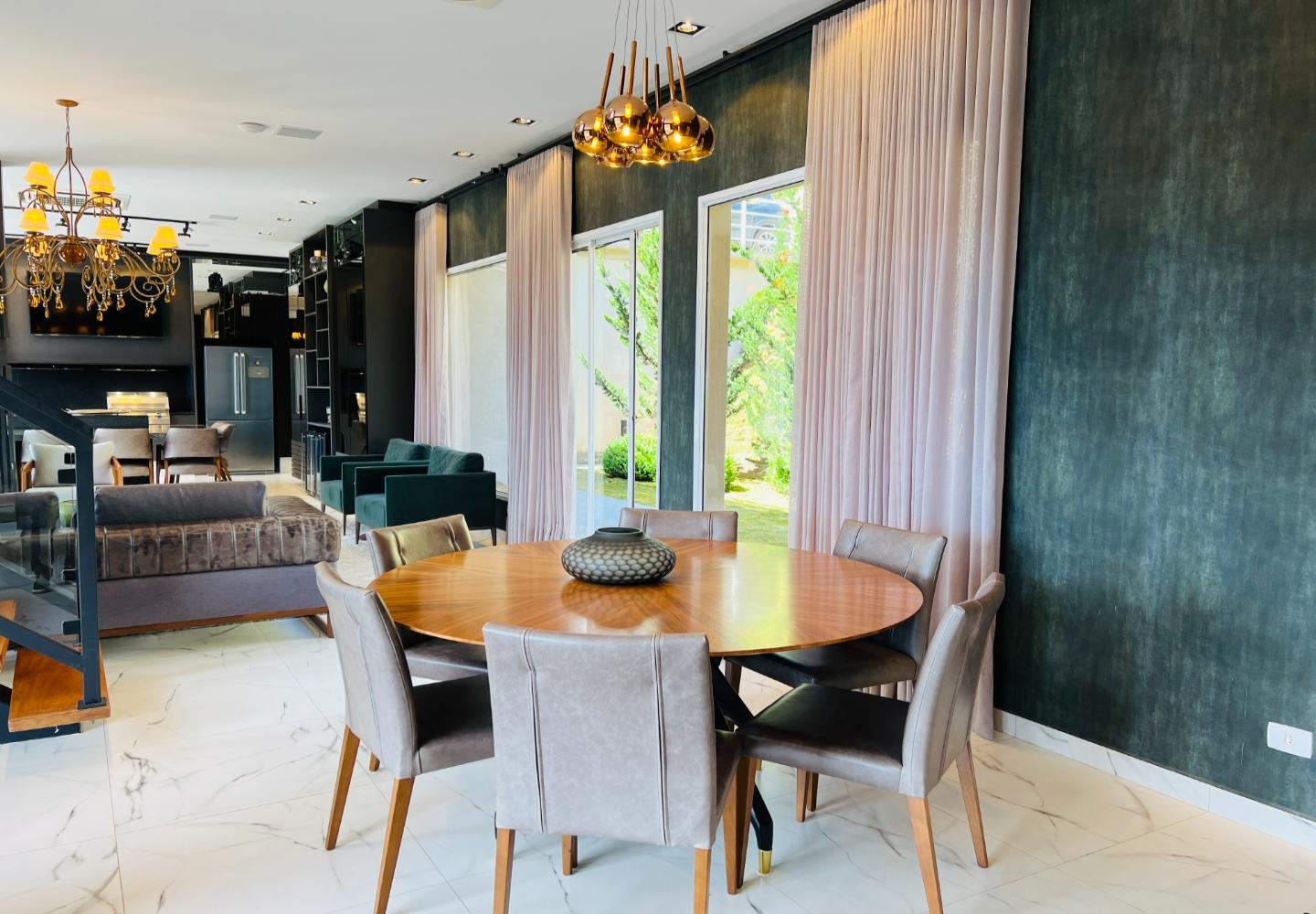 A parte externa acompanha o relevo com jardins bem cuidados, campo de futebol, cabana com redário e caminhos que ligam os espaços de lazer à casa principal. O acesso é prático e seguro, com portão automático, sistema de câmeras e garagem para cinco carros — duas vagas cobertas com ponto para carregamento de veículos elétricos.