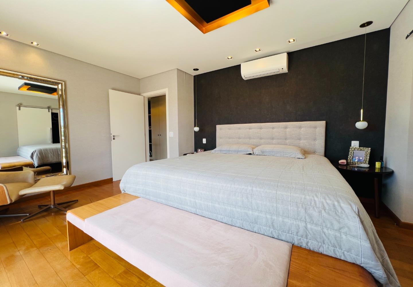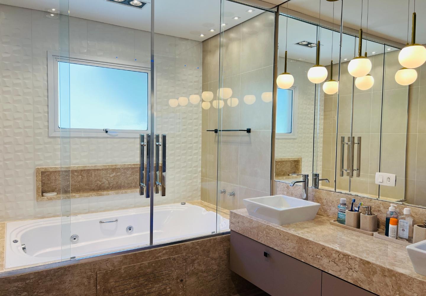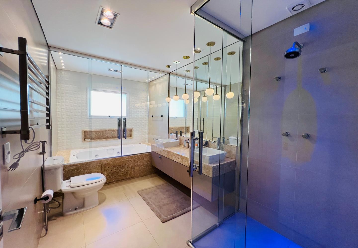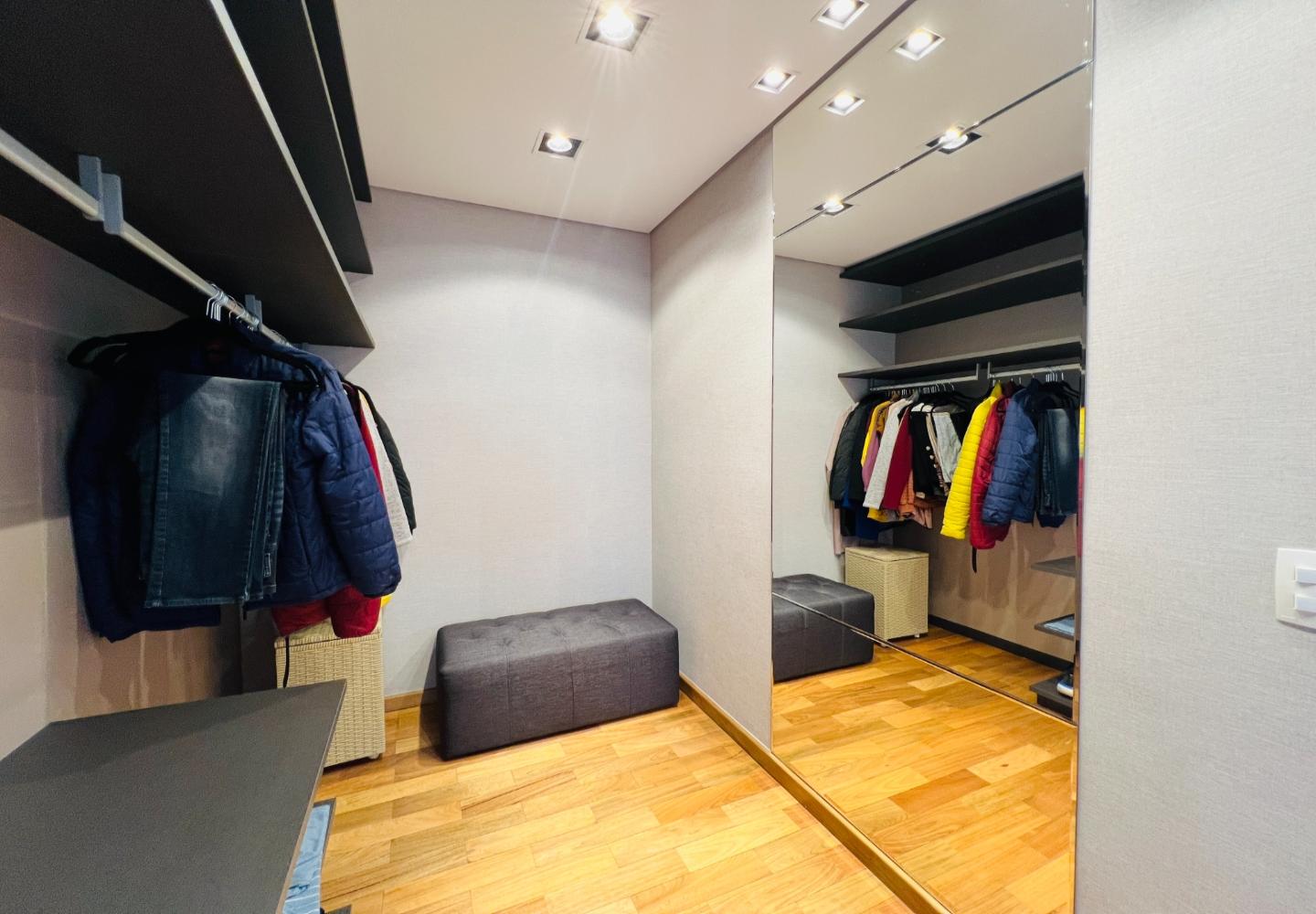 São cinco dormitórios no total, quatro deles suítes com piso aquecido e toalheiros térmicos. A suíte principal tem closet e banheira dupla.