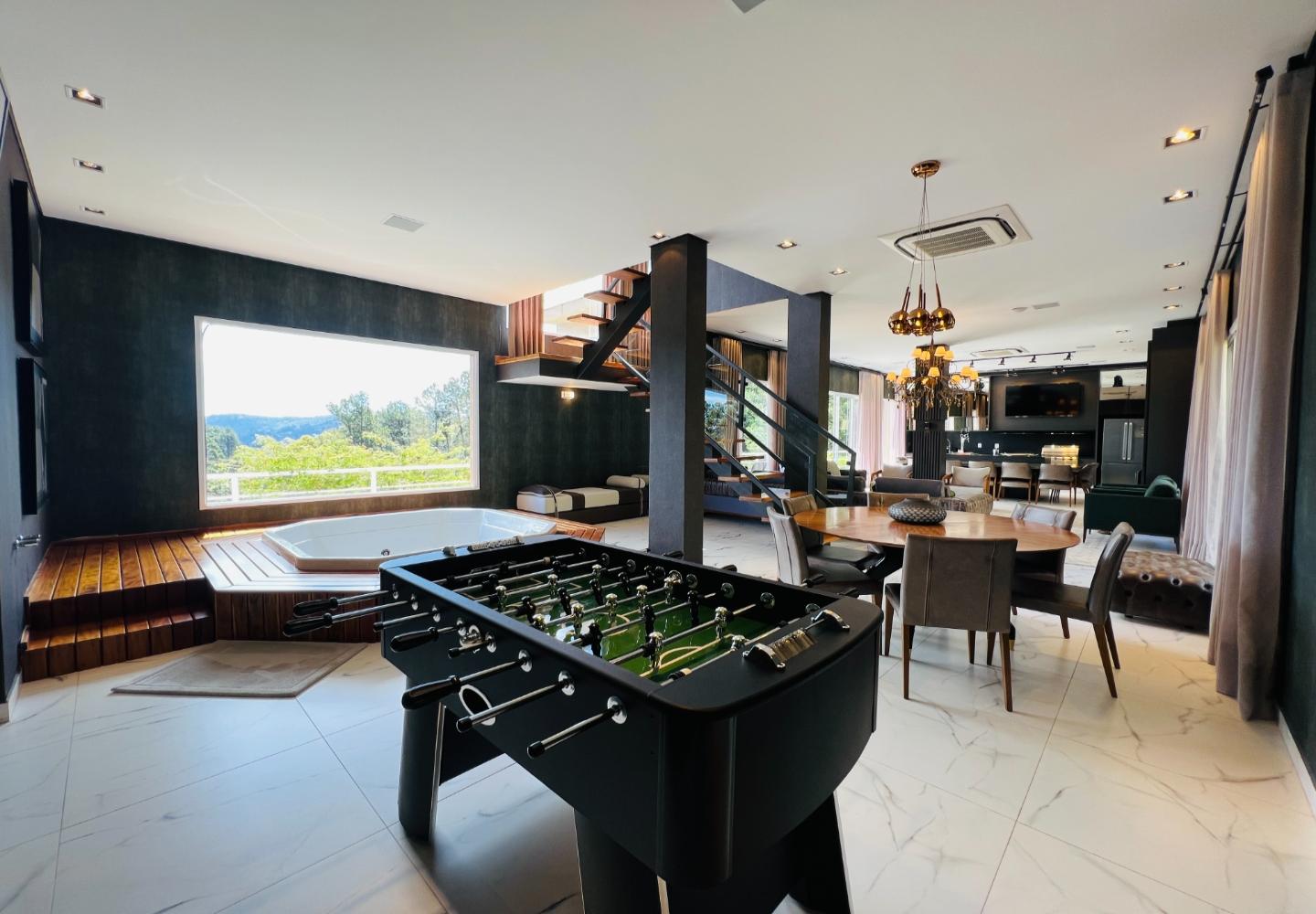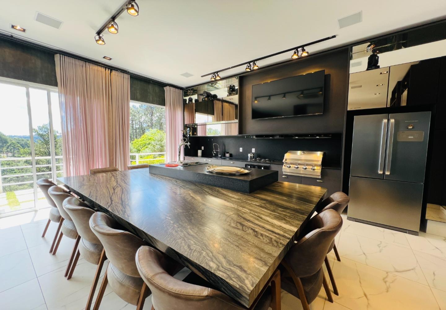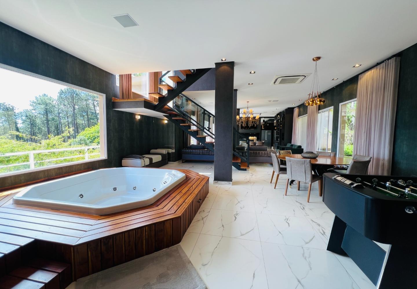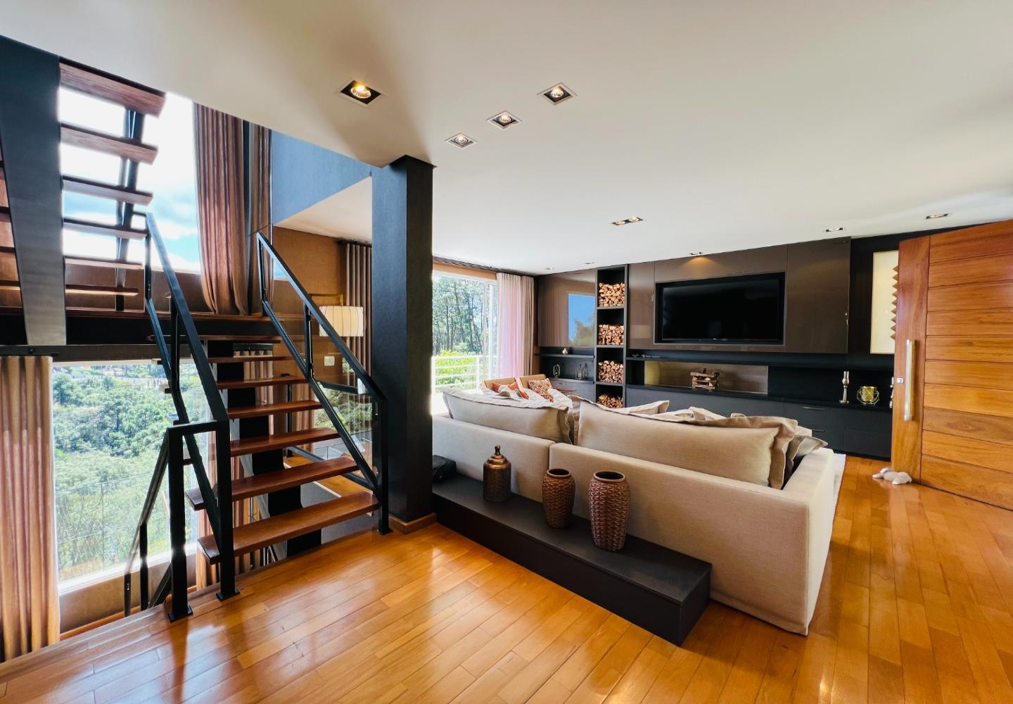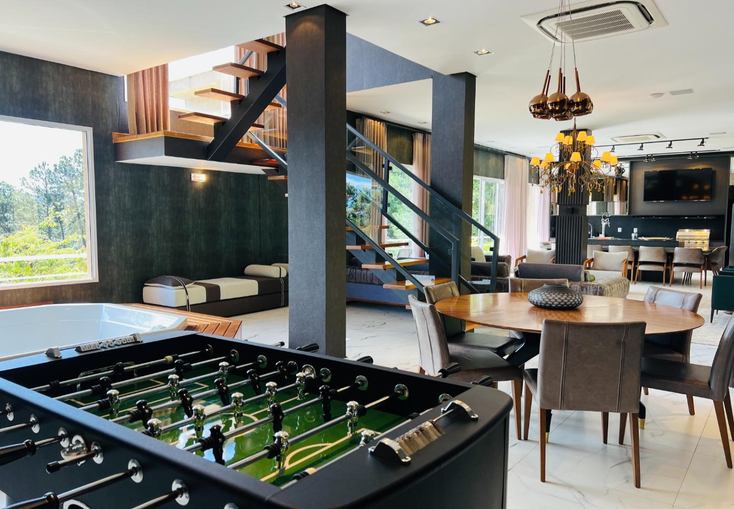 A área social chama atenção pelo espaço e pela harmonia dos materiais. O living é amplo e se conecta a uma jacuzzi voltada para o verde, lareira e um espaço gourmet completo, com churrasqueira a gás e a carvão, chopeira com refrigeração e um grande deck para aproveitar o ar da serra.