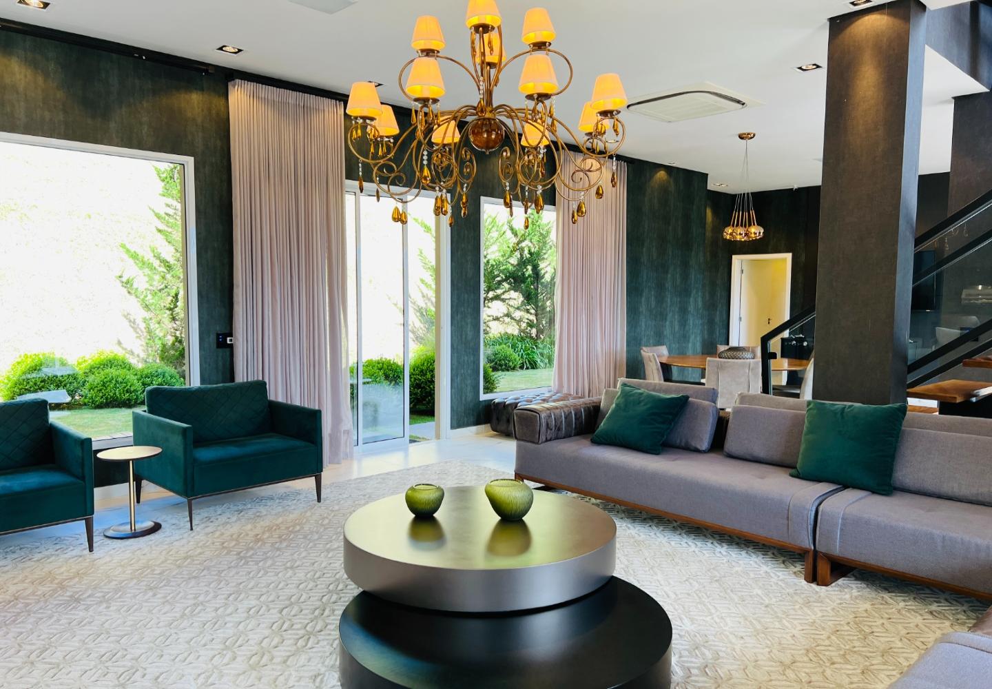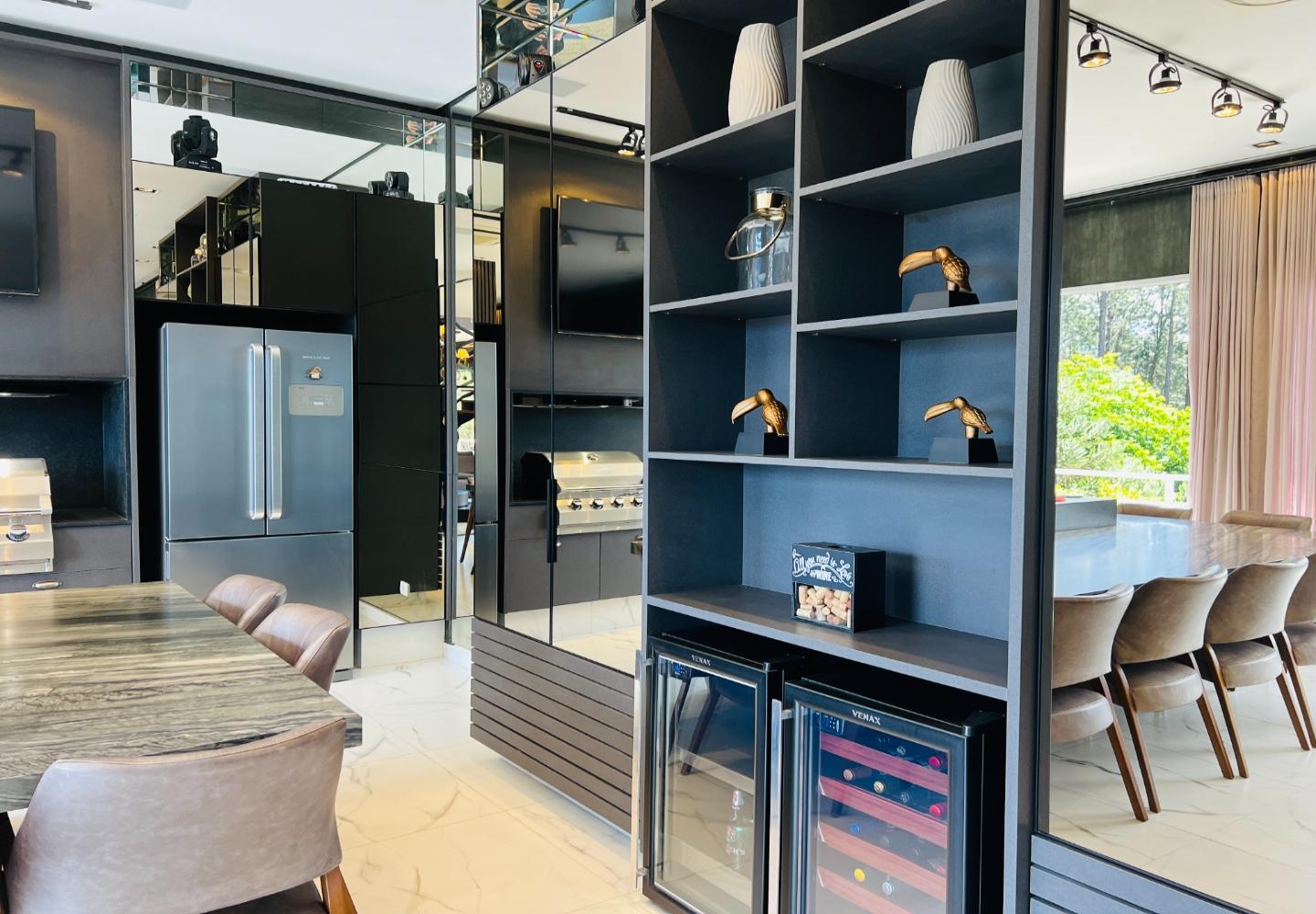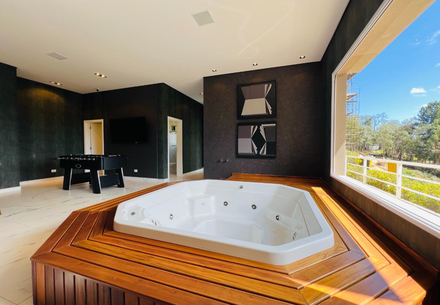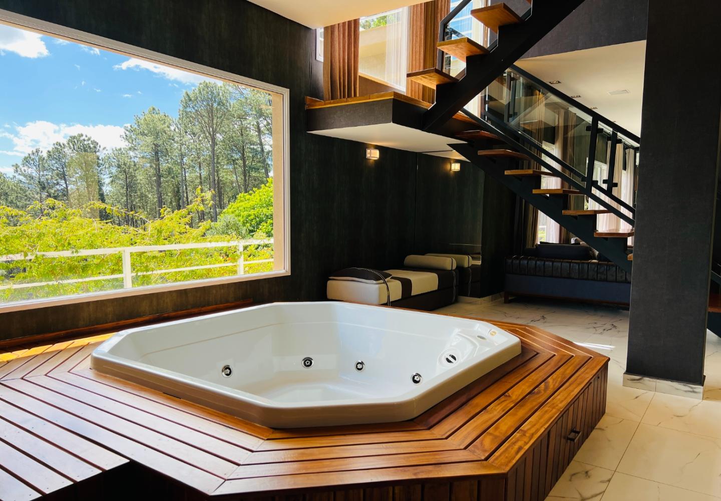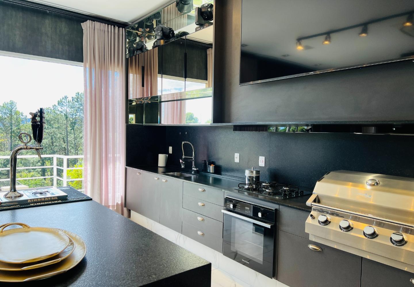 A área social chama atenção pelo espaço e pela harmonia dos materiais. O living é amplo e se conecta a uma jacuzzi voltada para o verde, lareira e um espaço gourmet completo, com churrasqueira a gás e a carvão, chopeira com refrigeração e um grande deck para aproveitar o ar da serra.