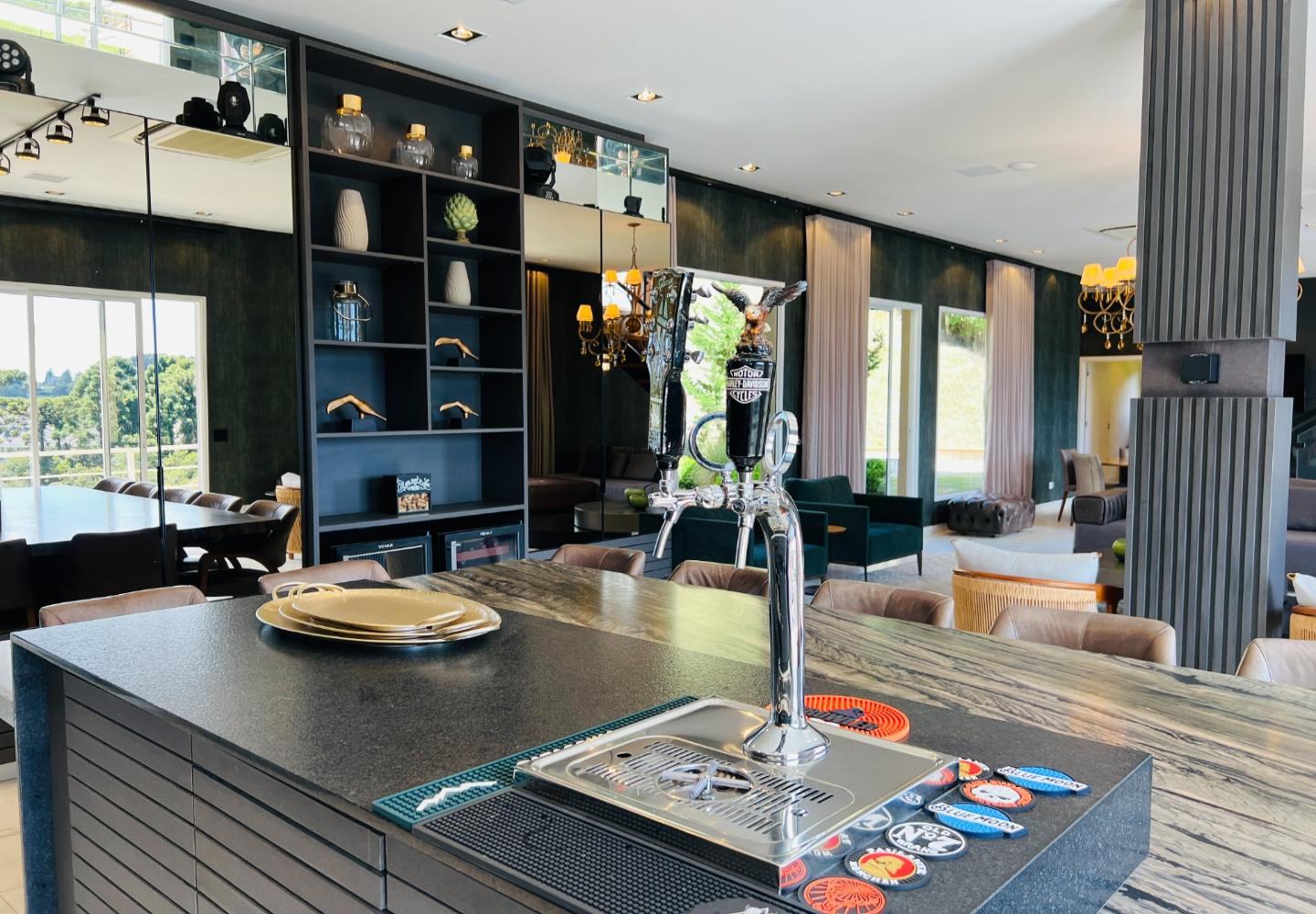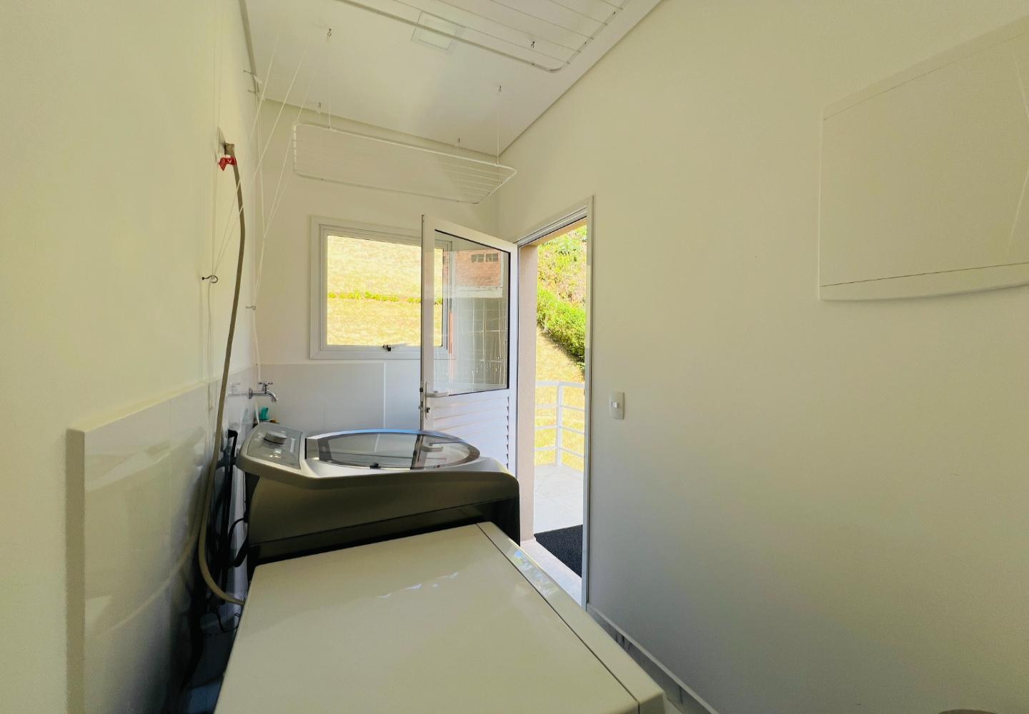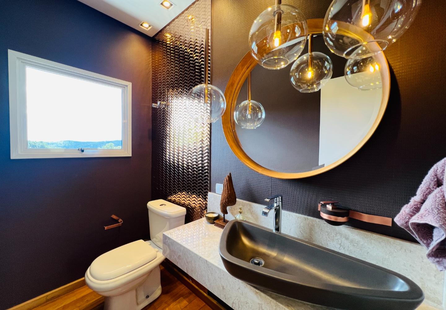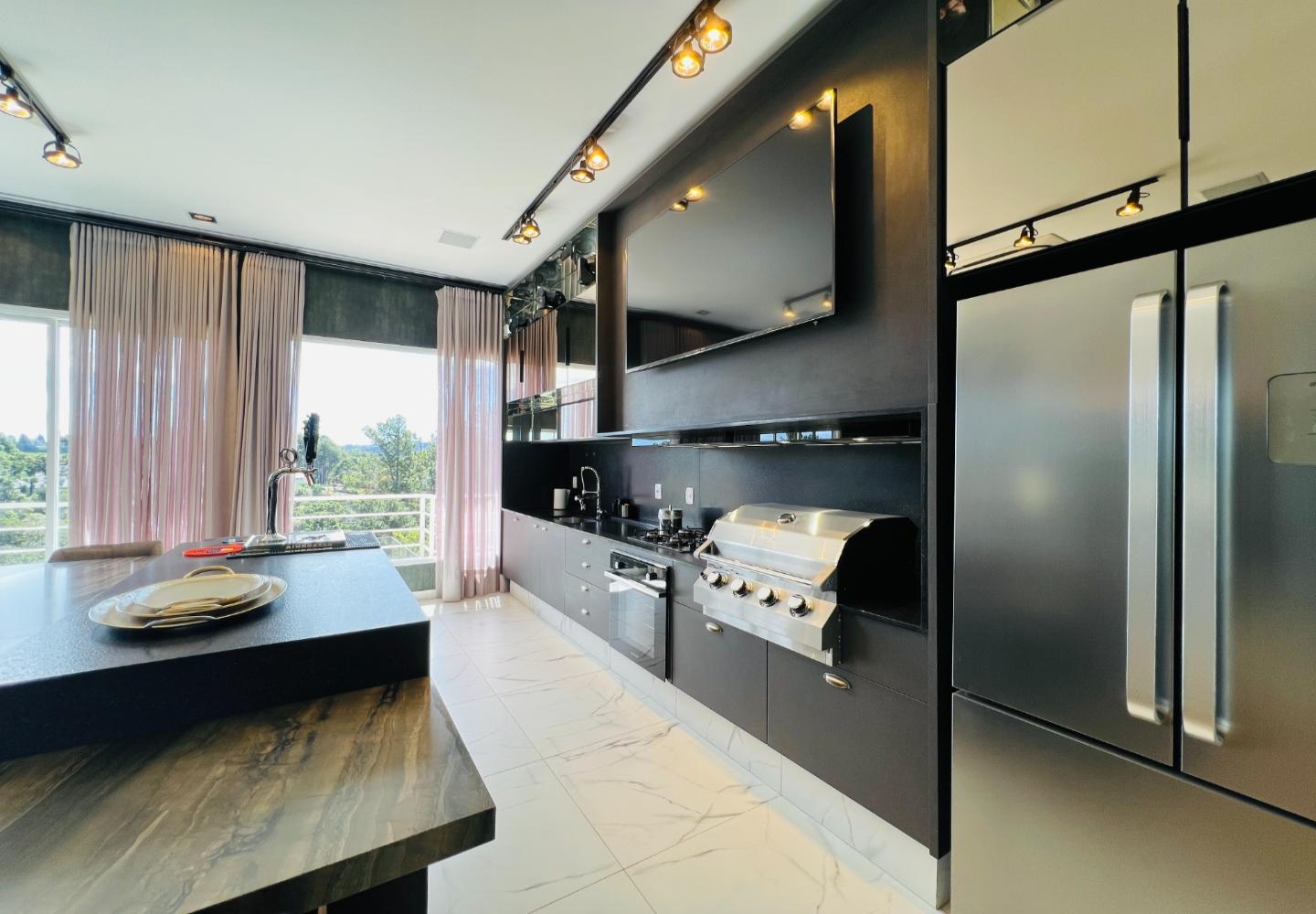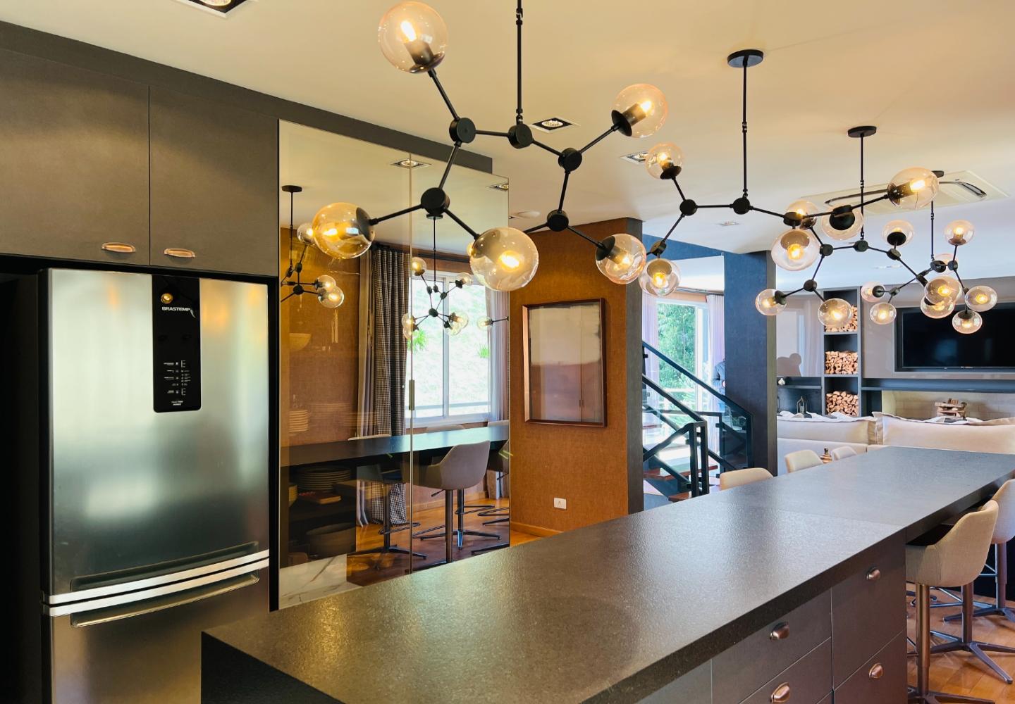 A área social chama atenção pelo espaço e pela harmonia dos materiais. O living é amplo e se conecta a uma jacuzzi voltada para o verde, lareira e um espaço gourmet completo, com churrasqueira a gás e a carvão, chopeira com refrigeração e um grande deck para aproveitar o ar da serra.